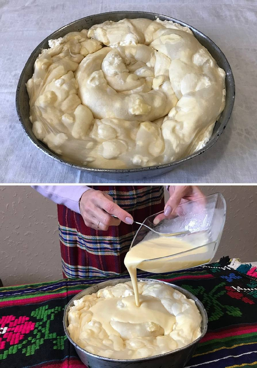 Цей багатошаровий пиріг з витяжного, тонкого, як пергамент, тіста може подаватися і як гаряча закуска, і замість хліба до перших страв. Його начиняють місцевою солонуватою бринзою, заливають бовтанкою з молока та яєць, інколи додають зелень.