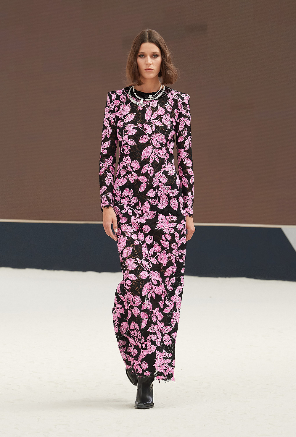 «У новій колекції є костюми та довгі сукні, якими їх створювала мадемуазель Шанель у 1930-х роках, — вони приталені до тіла, акцентують увагу на плечах та мають плісирування, як, наприклад, весільна сукня. Мереживо інкрустоване, перероблене — не вишиване, а перемальоване. Палітра складається з яскраво-зеленого, хакі, бежевого, рожевого, чорного та срібного кольорів», — зауважила креативна директорка.