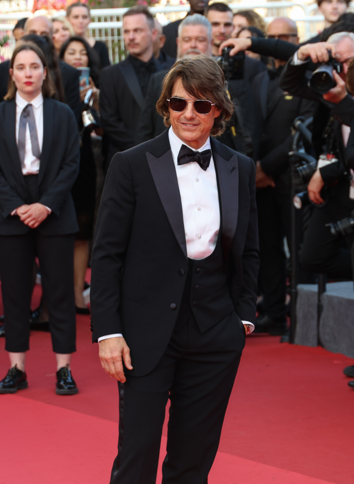 На червоній доріжці постала вся творча команда, яка працювала над фільмом, включно з головною зіркою франшизи Томом Крузом. Актор для такої події обрав вишуканий чорний смокінг, доповнений білою сорочкою, метеликом і сонцезахисними окулярами — ансамбль, який чи не найкраще вкладається у стриманий дрескод цьогорічної події.
