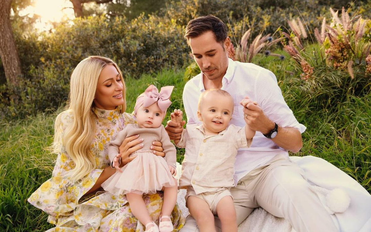 На світлинах із сімейної фотосесії Періс постала разом із Лондон, однорічним сином Феніксом і чоловіком Картером Реумом. Новонароджена донька з великим бантом на голові була вдягнена в рожеву сукню й сиділа на руках у матері. Гілтон написала, що завжди мріяла назвати дочку ім’ям Лондон.