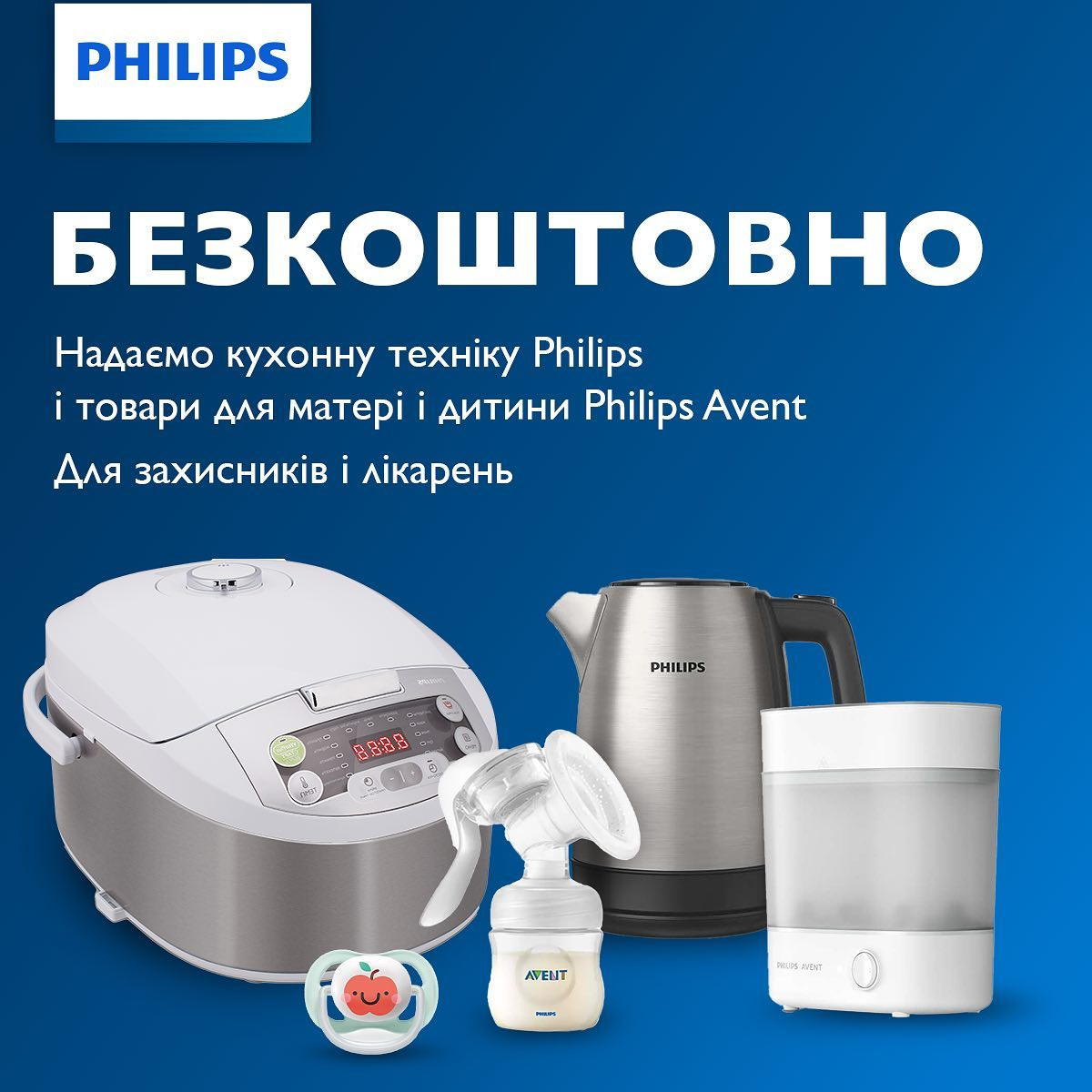 Philips безкоштовно передає свої чайники та мультиварки, які є в наявності, а також молоковідсмоктувачі, стерилізатори, пляшечки, пустушки, соски, пакети для зберігання молока Philips Avent для потреб захисникам, лікарням, пологовим будинкам за запитом волонтерських організацій чи клінік. Про це компанія повідомляє в своєму Instagram-аккаунті.