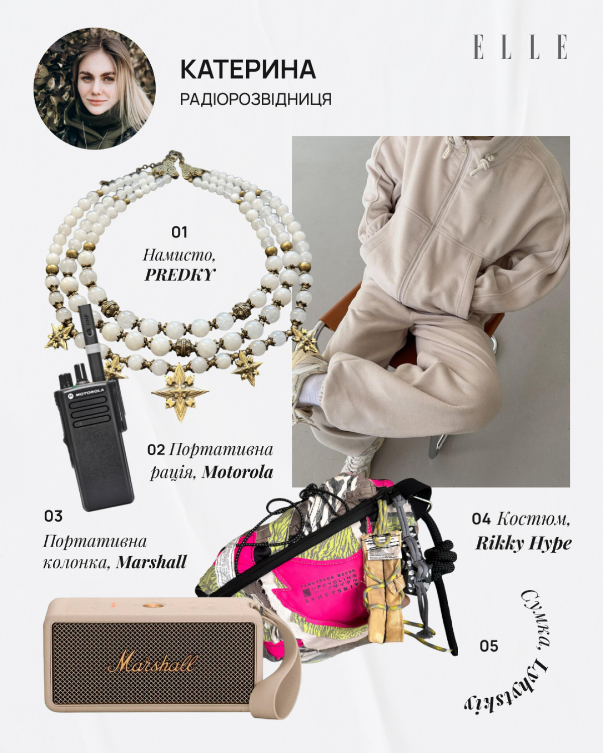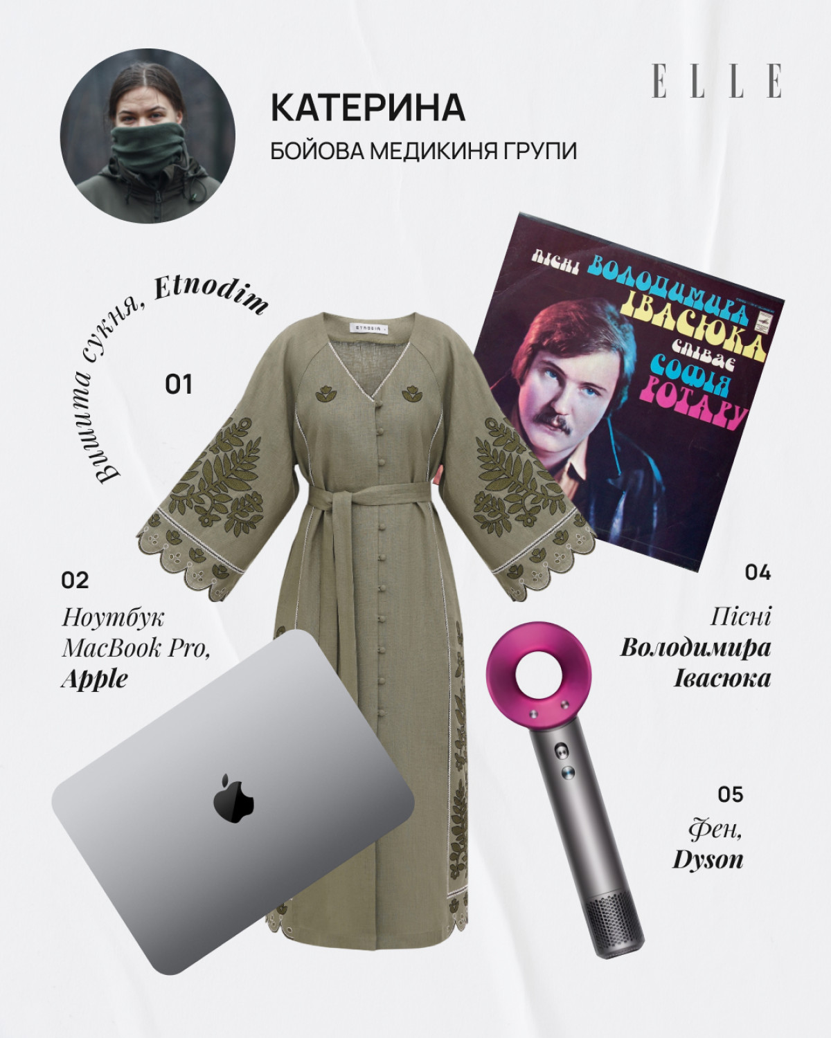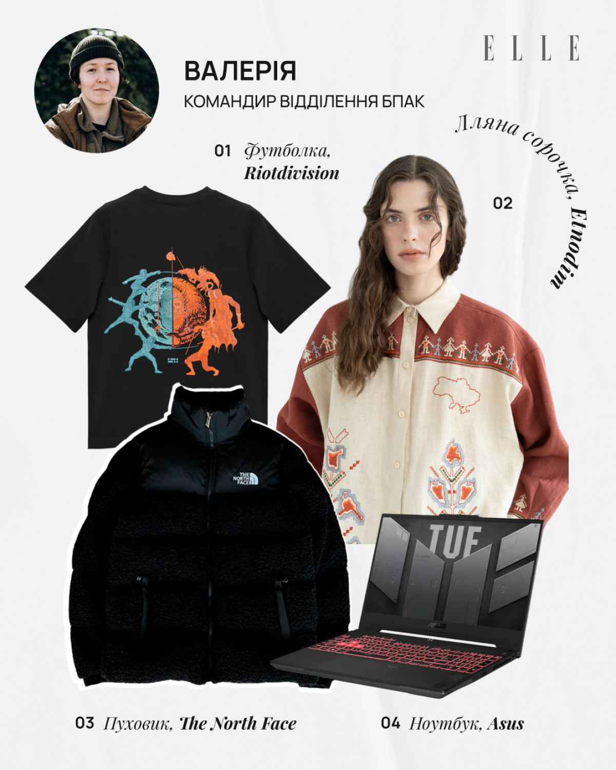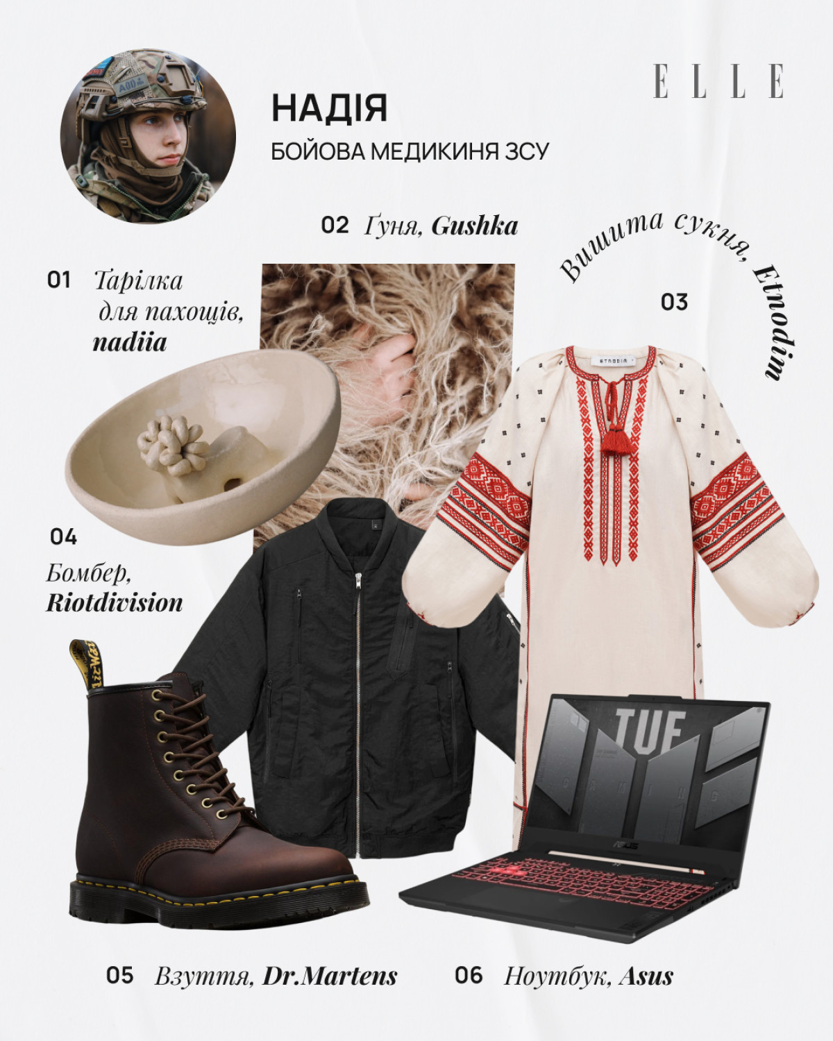 Я стежу за нашими брендами, і мені подобається, як зараз розвивається українська мода. Як те, що намагалася «зшароварити» Росія, відроджується з новою силою і сенсами. Особливо мене приваблює етноодяг в сучасному трактуванні. Тому почесне місце в моєму вішлісті займає вишиванка Etnodim «Полісся» (все просто: я родом звідти). Куртка Riotdivision — це стиль серед своїх, хто знає, той знає. Минулого разу на реабілітації в «Дідовій хатчині» мені сподобалися продукти бренду nadiia, я знайшла їх в Instagram, слідкую більше ніж пів року, бо мені подобається, як Надія бачить цей світ через кераміку, це неймовірно. Тому я їх собі вподобала. Через специфіку своєї роботи, коли я їжджу туди-сюди, я думала: «Може, не на часі?» А потім вирішила: чого воно має бути не на часі, якщо я хочу? На цій реабілітації в нас була фотосесія в шубках від Gushka. Це неймовірна шуба, вона виглядає так, що ти будеш іти, і на тебе всі звертатимуть увагу! Я виставила сторіс, і мене людей 50 запитало про неї. Я хочу, щоб такий одяг все частіше з’являвся в соціумі, адже це наша культура, наша спадщина, і світ має таке бачити. Щодо ноутбука у моєму вішлісті — мені здається, в наш час всі роботи підв’язані під гаджети. І ноутбук — це те, без чого зараз не обходиться серйозна робота. А в мене серйозна робота, тому маю відповідати критеріям. (Усміхається. — Ред.)