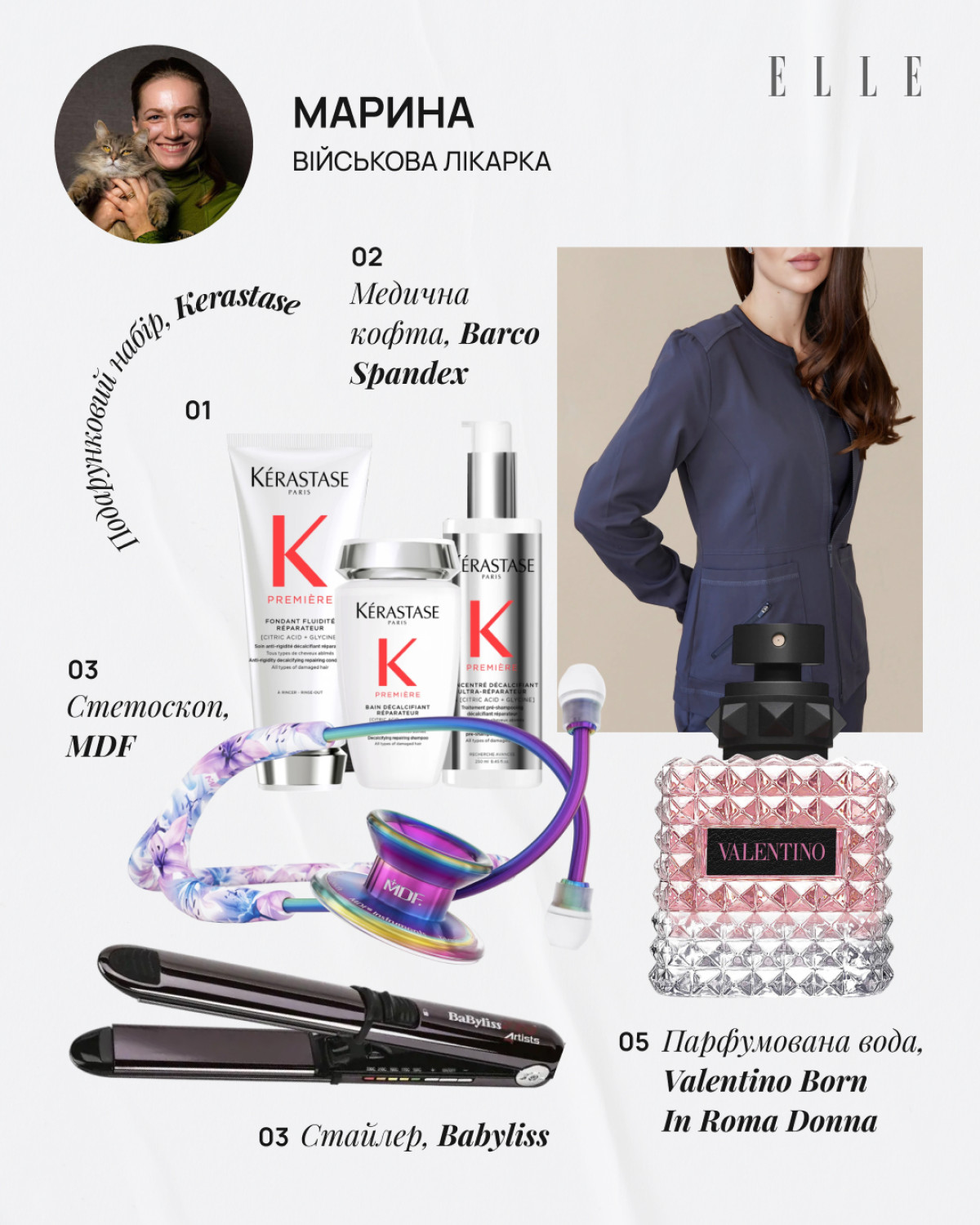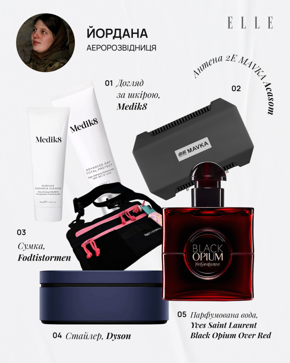 Перша з моїх бажанок — це сумка, яку я давно хотіла: її зручно носити як влітку, так і взимку. До того ж там є патч-панель, а я колекціоную патчі й хочу, щоб усі це бачили. (Сміється. — Ред.) Мрію про новий парфум, бо люблю приємно пахнути. Мені хлопці щодо цього часто роблять компліменти. Коли я виходжу з бойових, домовляюся про душ, тому що мені важливо почуватися охайною й доглянутою. Днями я спробувала у знайомої фен-стайлер, і тепер серйозно задумалася про покупку такої необхідної для мене речі, бо сушити волосся на повітрі взимку в бліндажі — ідея не з найкращих. Та й укладка, яку можна зробити за допомогою стайлера, — це завжди гарно, особливо якщо для нагороджень. Наступний пункт — догляд за шкірою. Через те що на бойових немає відповідних умов для догляду, її стан дуже погіршився. Мені не подобаються висипання, і, звісно, я хочу повернути свою здорову, сяйливу, чисту шкіру.