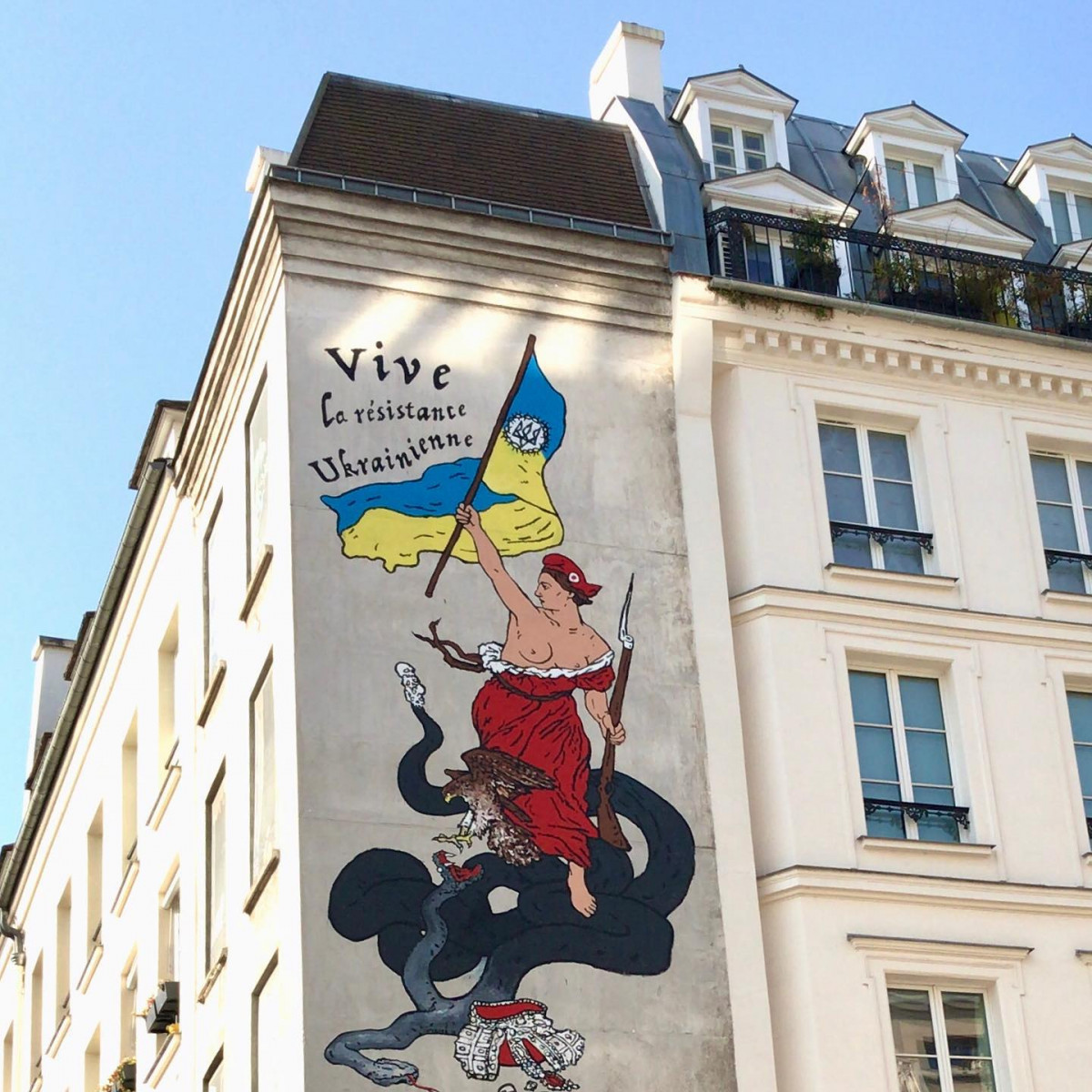 Українці, які перебувають за кордоном, не полишають спроб підтримати Україну. Так, 24 березня у Парижі, біля Центру сучасного мистецтва Помпіду був створений мурал на честь України та відважної боротьби українців за власну свободу та незалежність. Одну з домівок у центрі французької столиці тепер прикрашає жінка з українським прапором у руках. Автором муралу, на якому красується напис Vive la résistance ukrainienne!, виступив український художник Микита Кравцов, що мешкає в Парижі. Відомо, що мурал зроблено за підтримки мерії Парижу за участі команди митців.