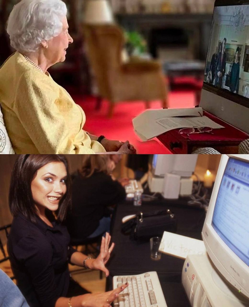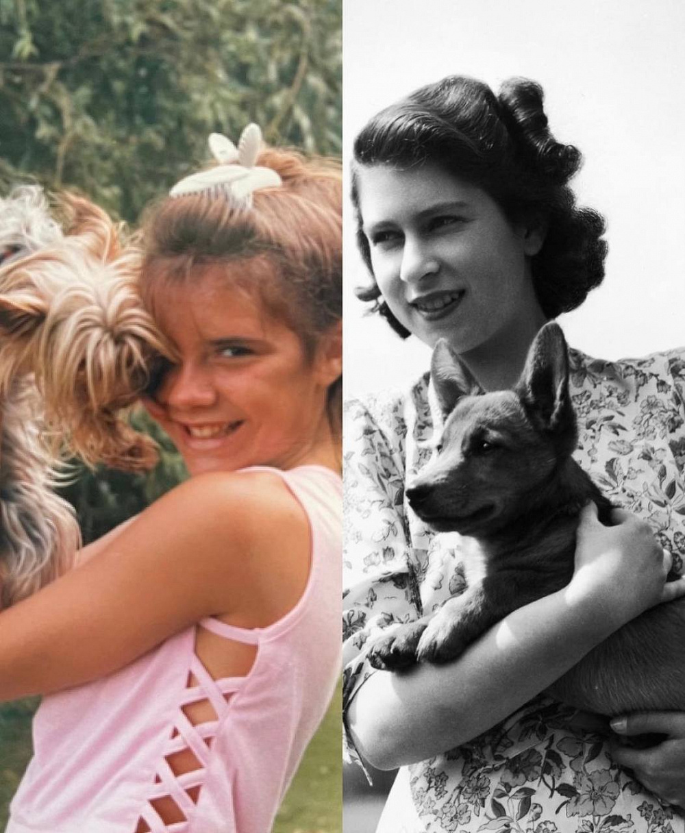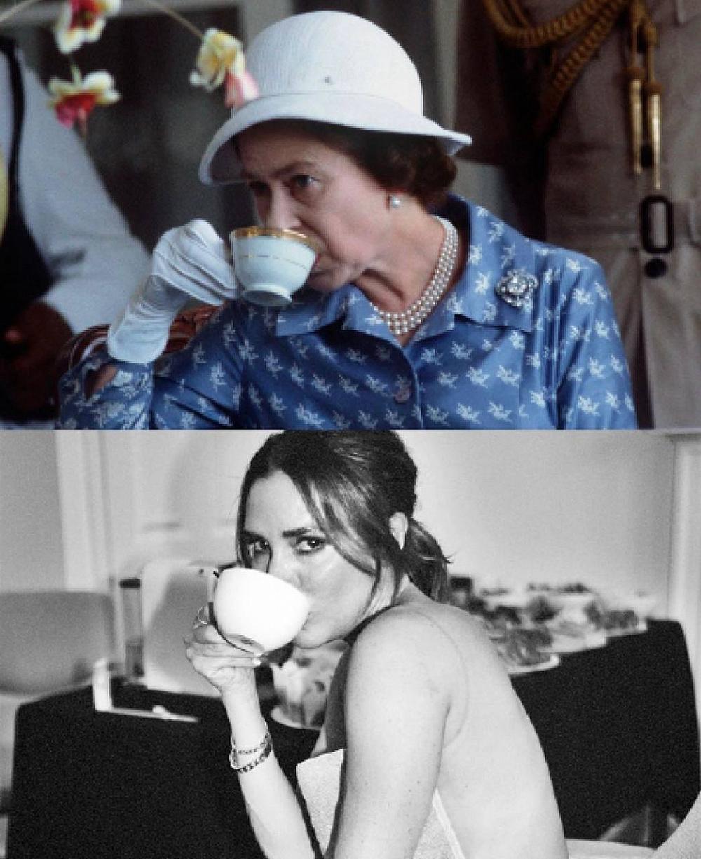 На фото дизайнерка зображена в тих самих ситуаціях, що й королева: на троні, із чаєм, у стильній хустці, за комп’ютером, з бокалом шампанського та з домашніми улюбленцями. На одному з колажів Вікторія та Єлизавета ІІ махають рукою з вікна автомобіля.