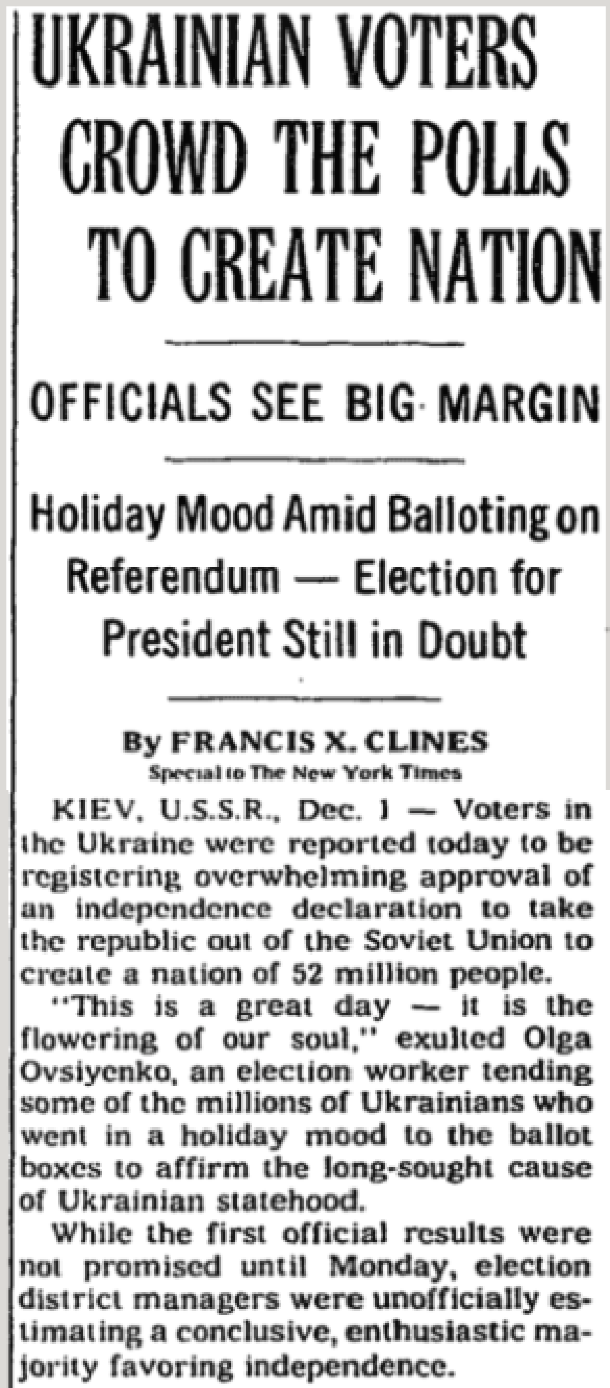 І більшість це усвідомлювала. У Києві, як і в селах, люди йшли голосувати цілими родинами. Іноземні журналісти спостерігали за піднесеним настроєм українців, а одна з працівниць виборчої дільниці називала цей день «великим», вочевидь наголошуючи на важливості історичного моменту.