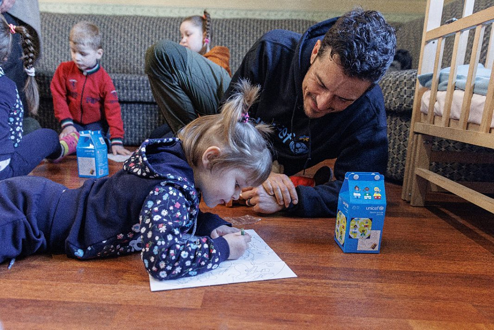 «В українській мові "Спільно" означає "разом", і таких центрів тут понад 180. Той, що я відвідав сьогодні, побудований глибоко під землею в метро, щоб переконатися у безпеці дітей. На декілька годин щодня батьки мають можливість залишити тут своїх дітей і подарувати їм відчуття нормальності, можливість пограти в ігри і просто побути дітьми», — написав актор.