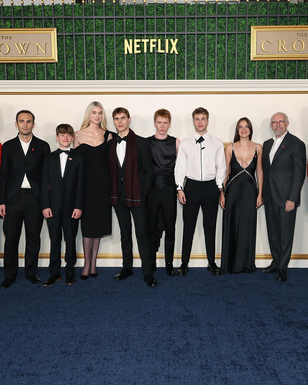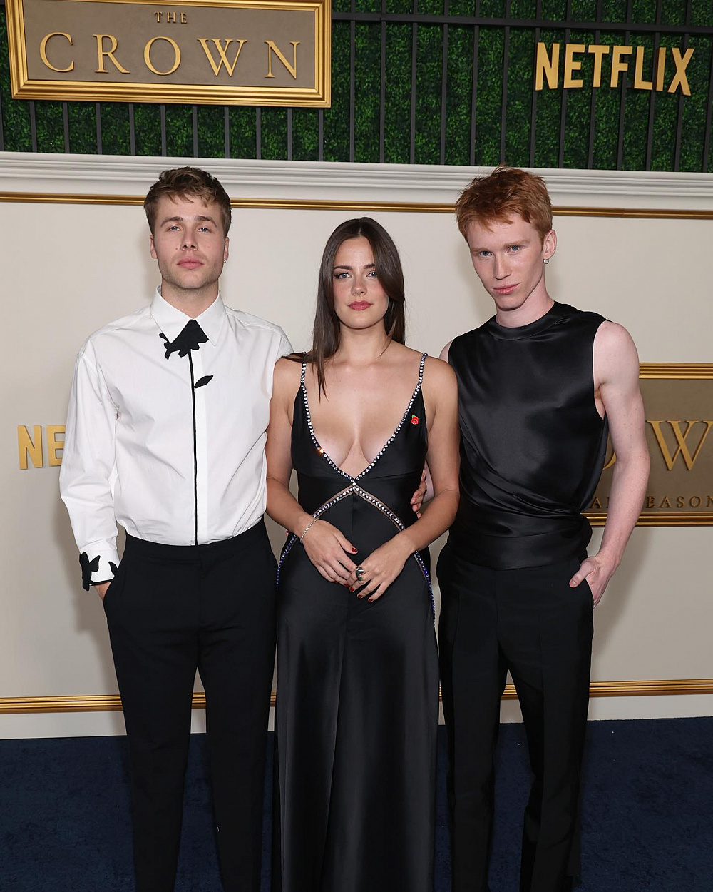 На килимі сяяла й Мег Белламі — нова учасниця касту «Корони», яка на екрані втілила образ Кейт Міддлтон. Вона одягла сукню Stella McCartney. Поряд із нею позували виконавці ролей принців Вільяма та Гаррі — Ед Маквей і Лютер Форд.