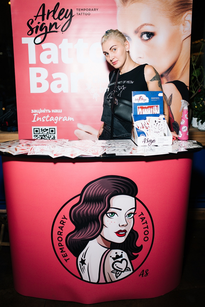 Визажисты бьюти-бара G.Bar рисовали актуальные элементы хеллоуинского мейкапа всем, кто не успел подготовиться к празднику. Также весь вечер работал tattoo-bar от бренда временных татуировок Arley Sign, где можно было украсить себя тематическими тату.