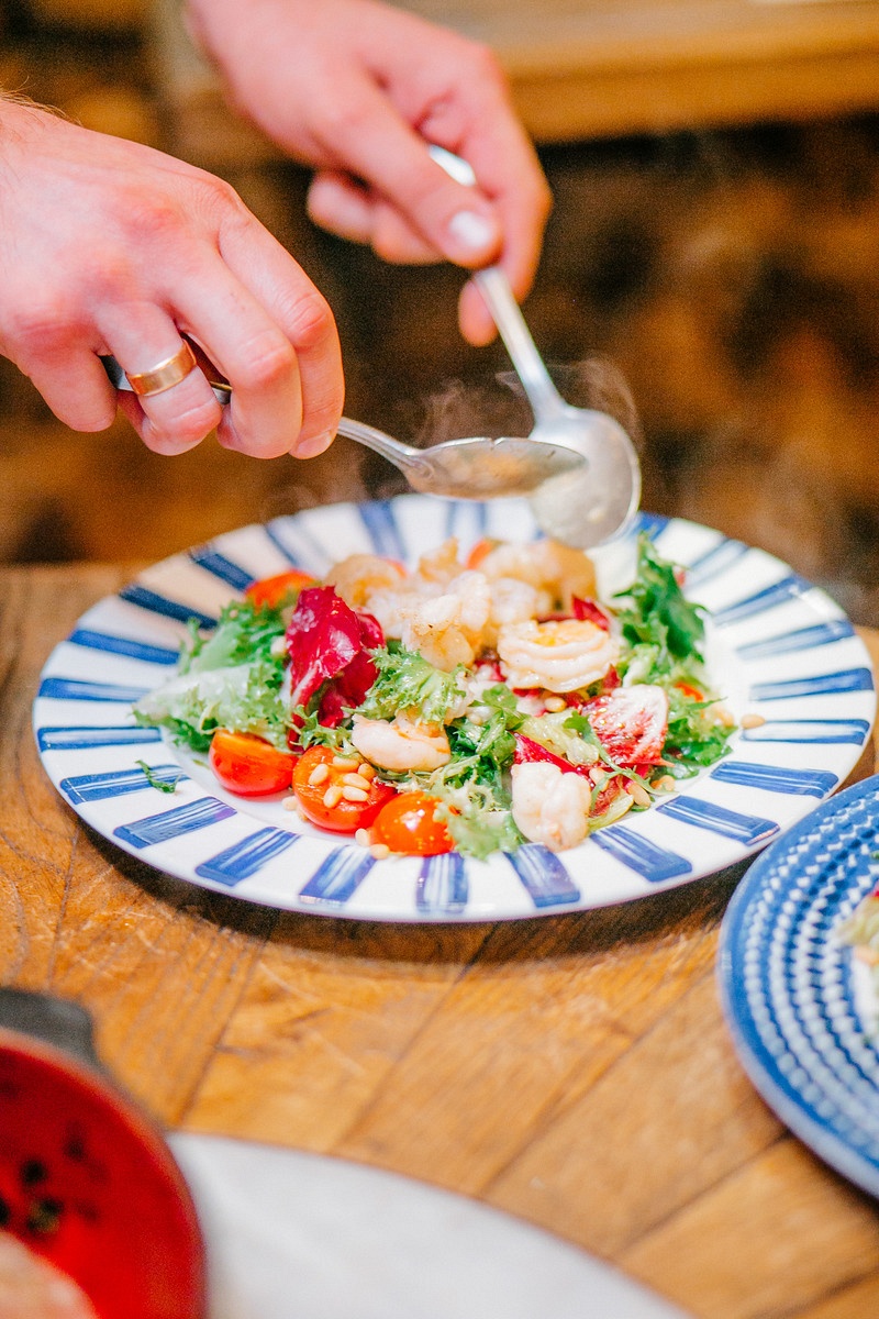 Свежий морской улов здесь готовят в уникальной дровяной печи родом из Неаполя. Ее внутренняя часть выложена вулканическим камнем, за счет которого температура в середине может достигать 350 градусов. На посуде, которая нагревалась в печи, шеф прямо в зале, на глазах изумленных гостей создал вкуснейший салат с креветками и кедровыми орешками.
