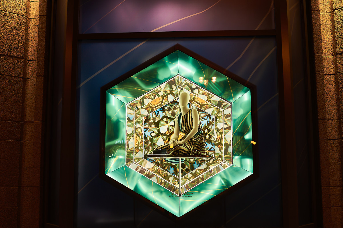 Калейдоскоп моди, трендів, стилю та брендів – все це унікальний формат ЦУМ. Натхненням для оформлювачів став калейдоскоп, як своєрідна філософія, в якій зі схожих елементів кожного разу народжується щось унікальне, нове і неповторне. Кожна вітрина – трансформований калейдоскоп, за допомогою системи дзеркал створюється багатошарова картина, елементи в постійному русі заворожують спостерігача. Для того що б підкреслити фізику цього явища у вітринах були використані кінетичні елементи та digital екрани. За допомогою різноманітних форм загальний ряд вітрин створює гру кольору та ритмів. Зовнішня текстура матового покриття вітрини створює контраст з глянцевими поверхнями усередині вітрини, що вносить різноманіття в композицію.