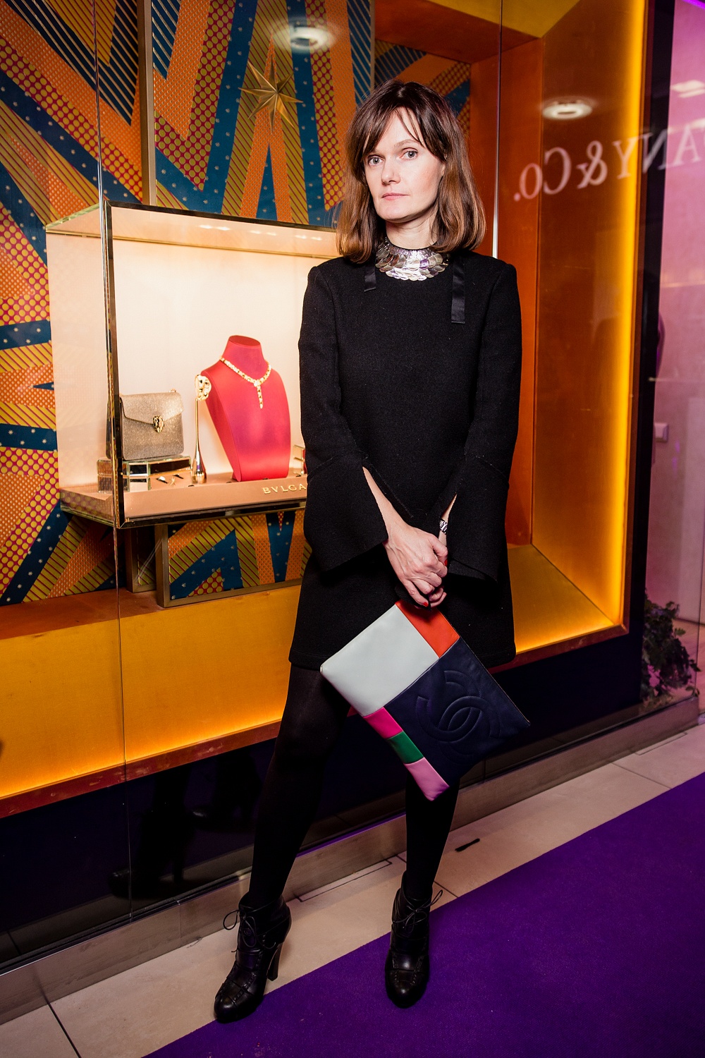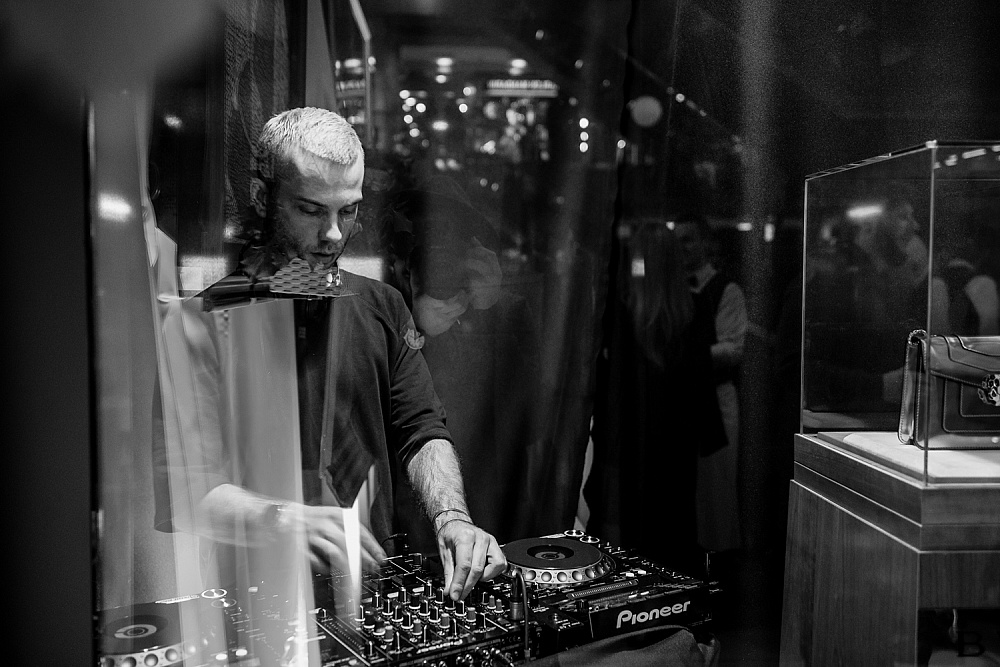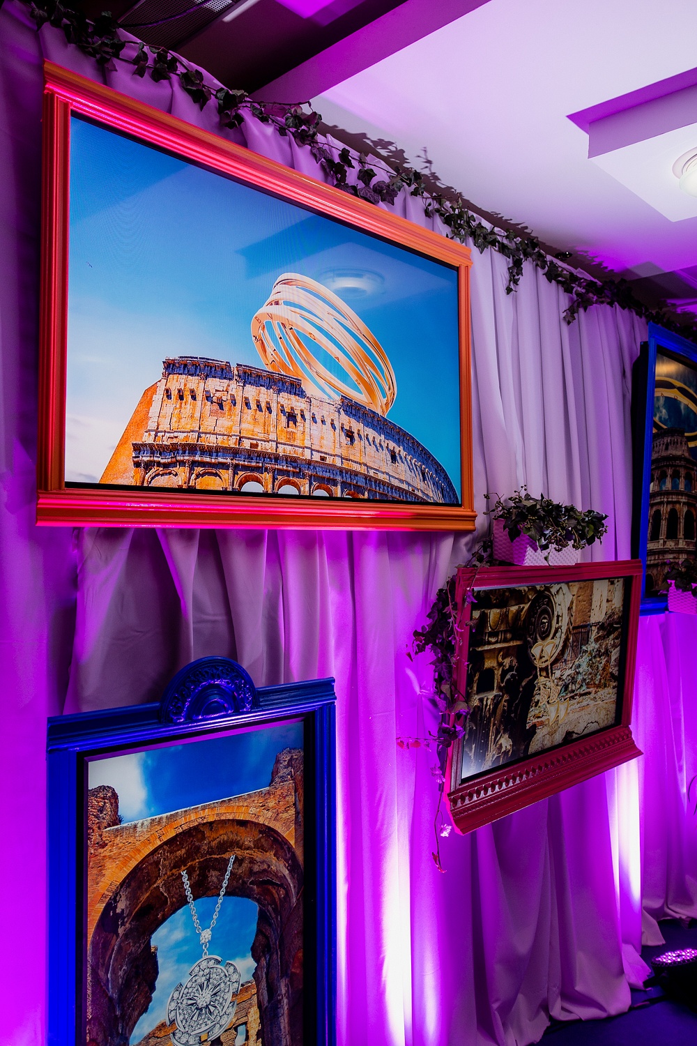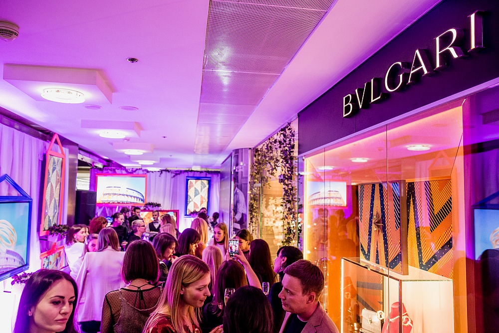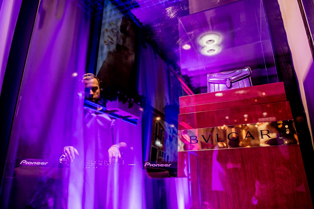 Погружение в атмосферу вечернего аперитива проходило под светом плазм, декорированных авторскими рамками. Специально для мероприятия команда new media arts studio Blck Box разработала видеоконтент, отображающий главные источники вдохновения дизайнеров Bvlgari: Колизей, Термы Каракаллы и секретные улочки Рима. Дополнял арт-инсталляцию DJ Стас Тви.