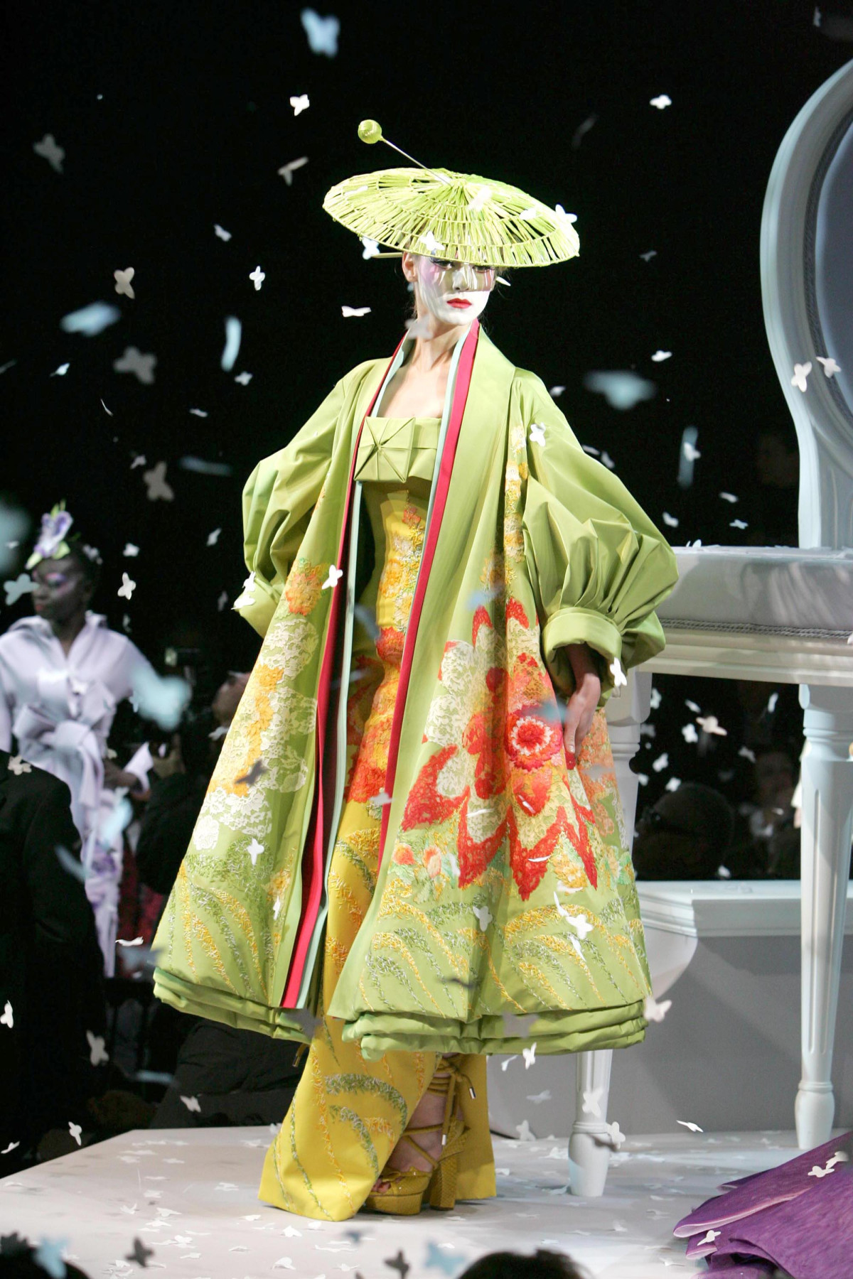 Подіум для шоу перетворили на кабінет маестро, прикрашений гілкою сакури. Моделі зʼявлялися в образах з пишними спідницями, що підкреслювали талію, у розкішних корсетах, декорованих коштовним камінням і вишивкою, та футуристичних капелюхах авторства Стівена Джонса.