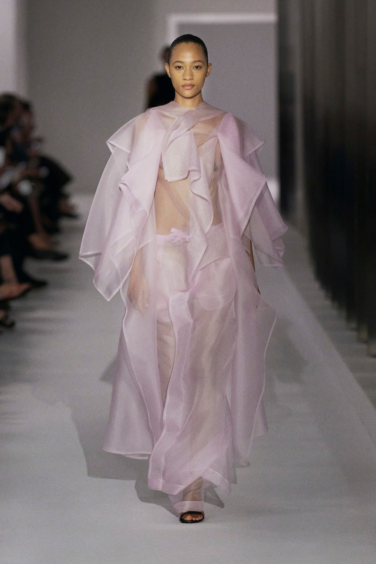 Спершу на подіум вийшли моделі в чорно-білому вбранні. Шовкові топи з об’ємними деталями у вигляді квітів, напівпрозорі спідниці, розшиті камінням та аплікаціями, сукні, всуціль вкриті пелюстками, — уже на початку дизайнер продемонстрував неабияку майстерність у роботі з тканинами, формами та візерунками. Згодом до цього всього додався сплеск яскравості: речі тепер заграли контрастними рожевими, червоними, фіолетовими та жовтими відтінками. Флористичні мотиви, драпірування, пишні силуети з кількома шарами тканини, банти та невагомі тканини, які розліталися від подиху вітру, зберігали настрій лінійки аж до останнього образу.