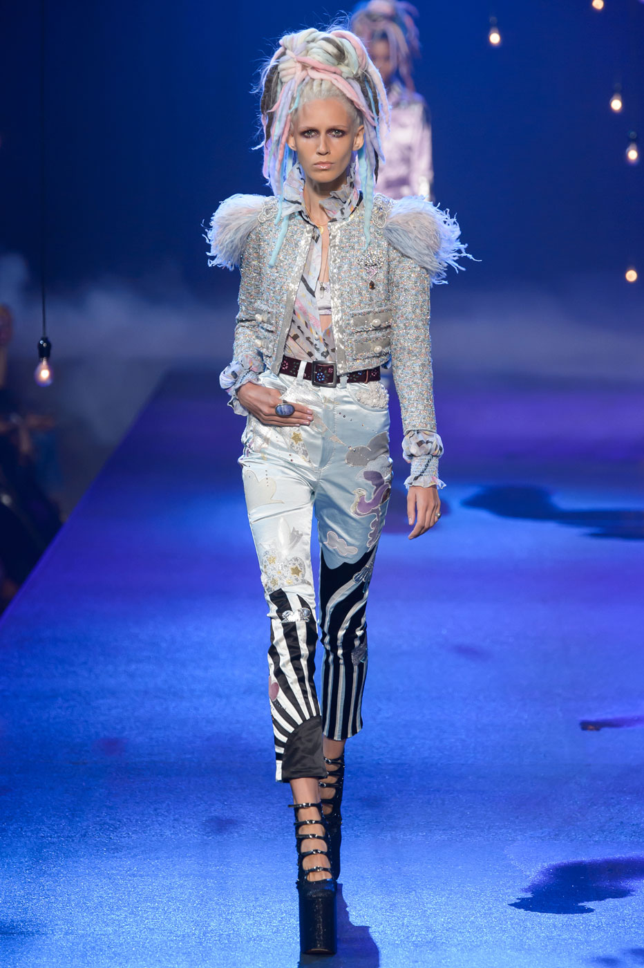 Mark Jacobs. Лук состоял из легкой рубашки из натурального материала, брюк, пиджака и ботинок на платформе и, разумеется, аксессуаров. Брюки были расшиты камнями и жемчужинами – потрясающая работа, такая вещь больше тянет на произведение искусства, нежели на простые штаны. Ботинки на высоченной платформе, в которых, наверняка, сможет ходить не каждый. Я люблю сложные луки, подобные этому, в них чувствуешь себя героем какого-то фантастического кино.