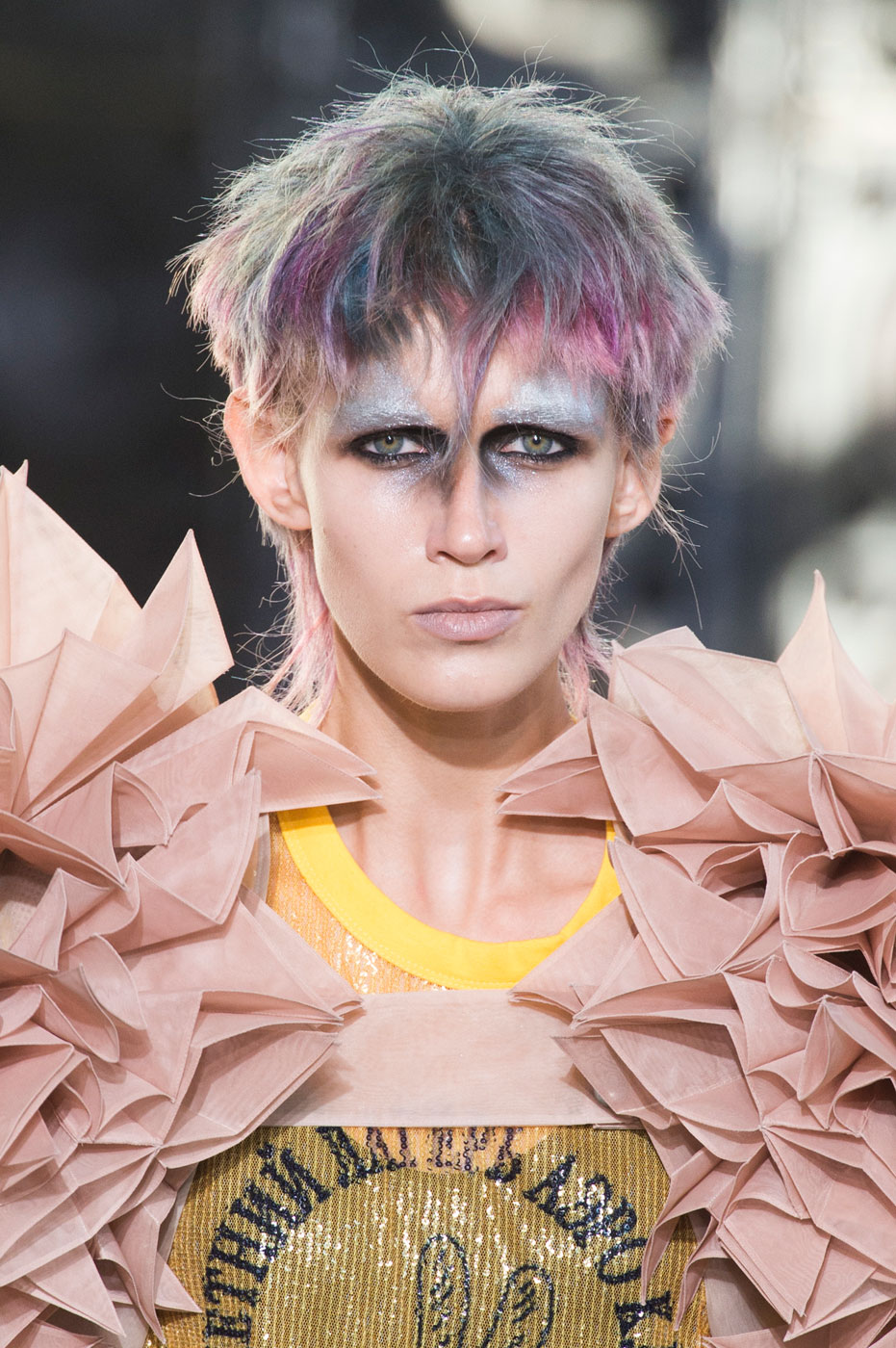 Watanabe. Так вышло, что я участвовала в создании макияжа, именно на мне делали тестовую версию. Дизайнер лично контролировал весь процесс. Макияж очень сложный, самое ужасное то, что брови заклеивали специальным клеем, чтобы они не были пушистыми. Сверху уже положили специальный продукт, похожий на воск, который делал поверхность более гладкой. После этого, визажист сделала привычный smoky eyes, который дополнила крупными серебряными элементами, выглядело впечатляюще. Макияжи моделей несколько отличались друг от друга, но основной идеи придерживались в каждом из них. Кроме того, у каждой девочки был свой парик, который придавал образу индивидуальности.
