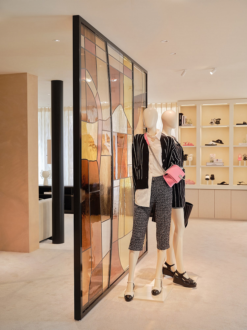Кожен поворот відкриває перед відвідувачами експозицію одягу, сумок, аксесуарів. Серед них — культові годинники J12 і колекція ювелірних виробів COCO CRUSH. На вході представлений широкий асортимент окулярів та ароматів, зокрема Les Exclusifs і Les Eaux de Chanel.