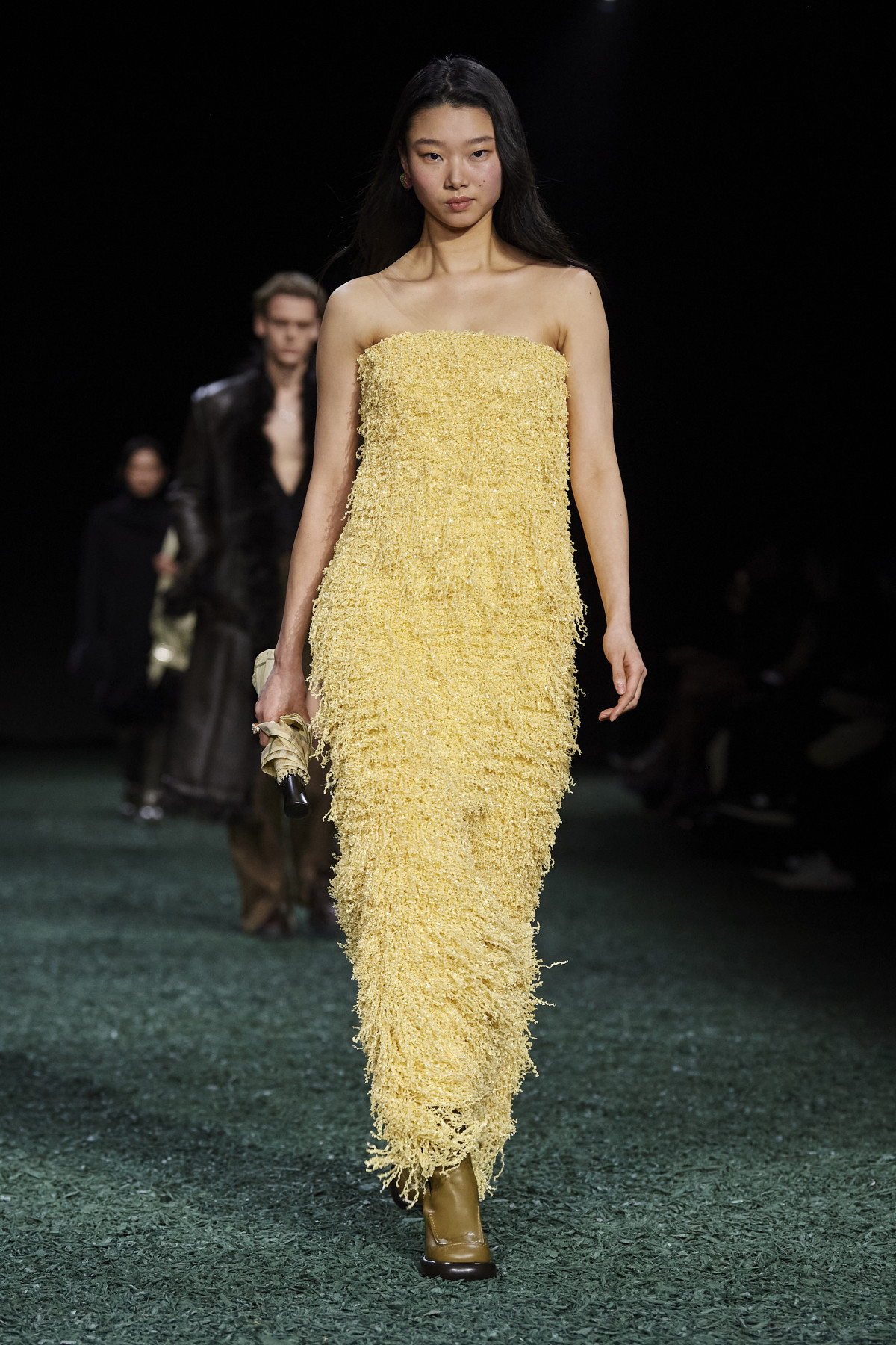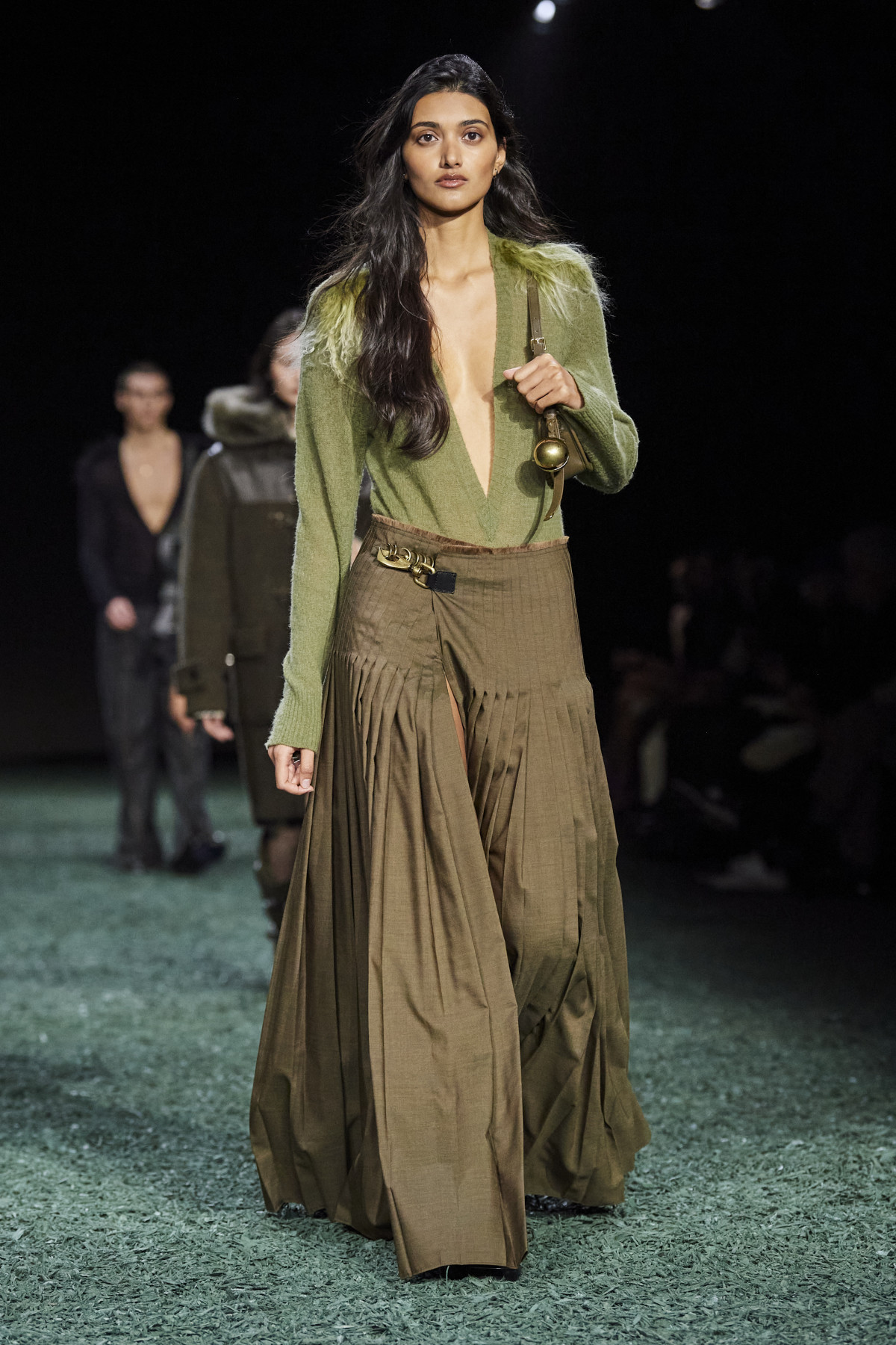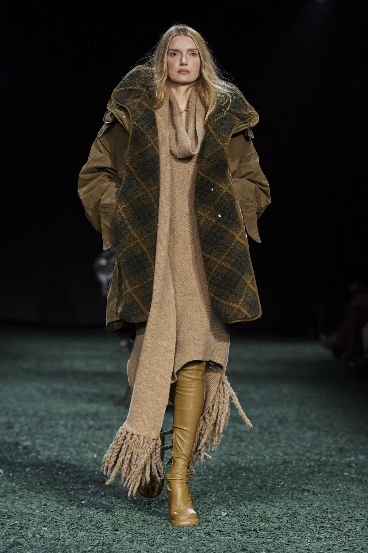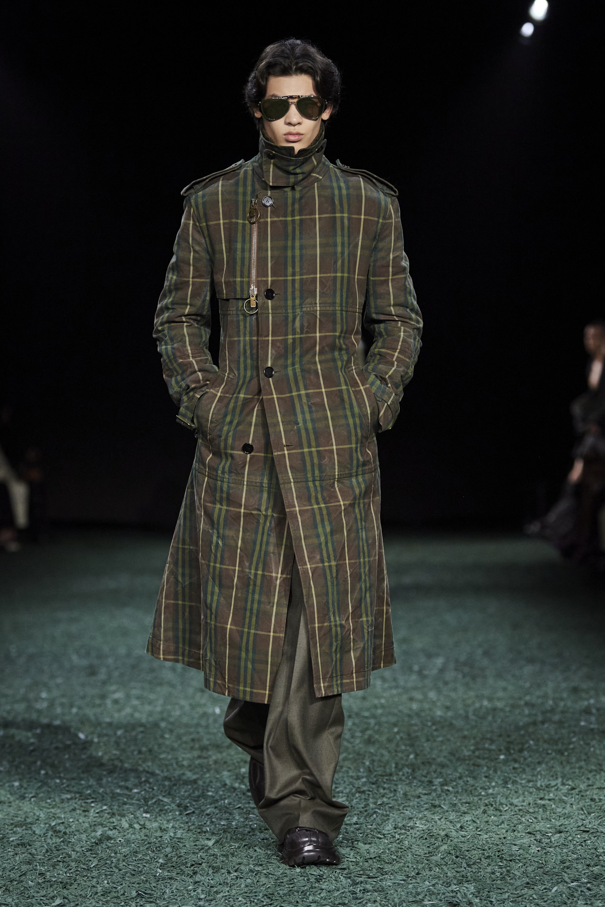Шоу цього бренду, особливою шанувальницею якого була покійна королева Єлизавета II, гості Лондонського тижня моди, певно, очікували найбільше. У новій лінійці Burberry Деніел Лі переосмислив британську класику, урізноманітнивши її новими відтінками й формами. Традиційно говорячи про натхнення дизайнерів, можемо здогадатися, що ідеї для створення колекції модельєр Burberry черпав в унікальній красі природи Англії — зокрема, ми помічаємо це в різних відтінках зеленого й коричневого. Не зраджуючи собі, бренд представив картаті пальта й брючні костюми, дублянки з хутряними вставками, шкіряні спідниці максі, тренчі з високою горловиною й довгі текстурні сукні.