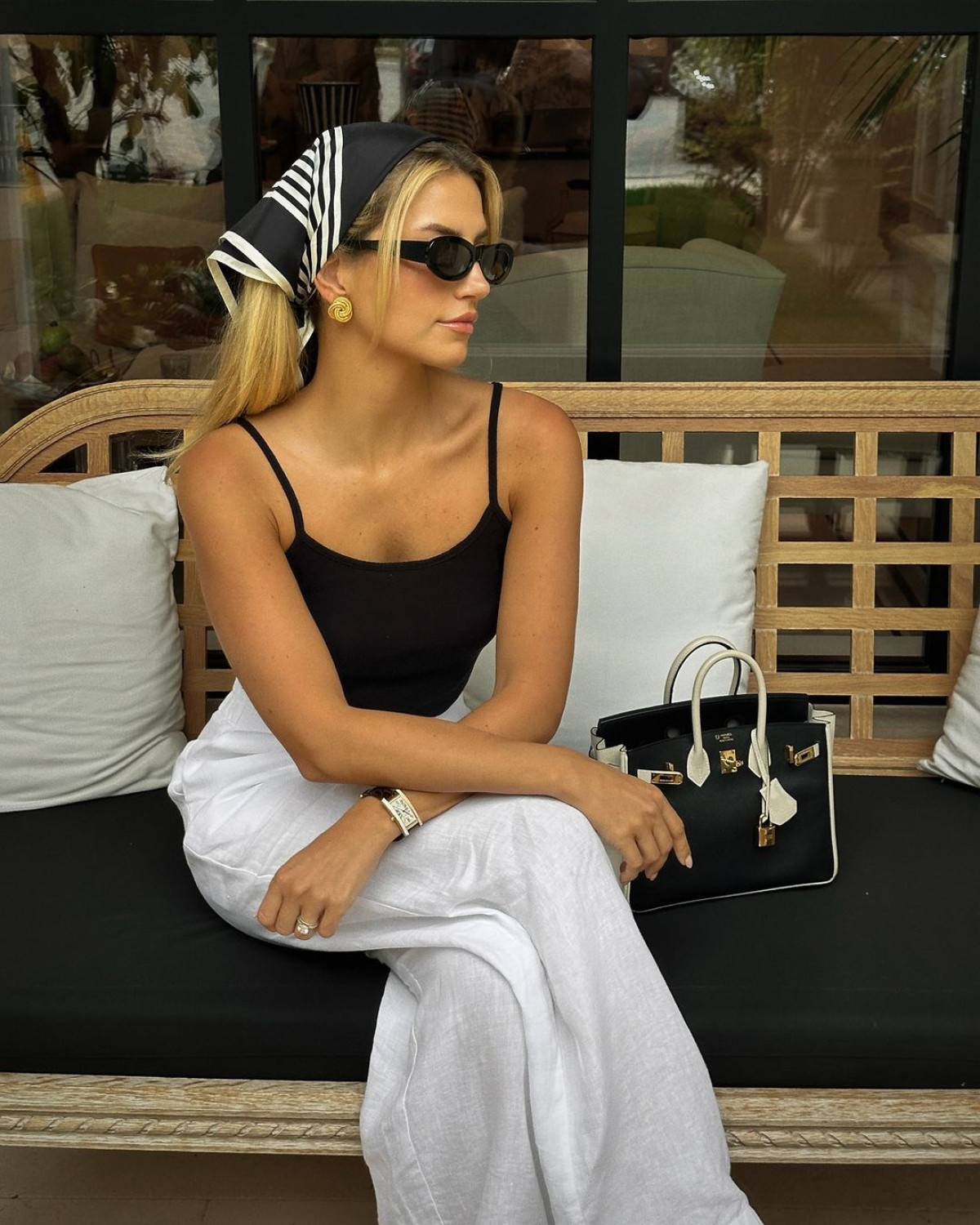 Зав’яжіть хустку на підборідді чи на потилиці або одягніть подібно до косинки чи бандани. Додайте купальник, улюблений легкий костюм і плетену сумку — ідеальний образ для теплої пори готовий.