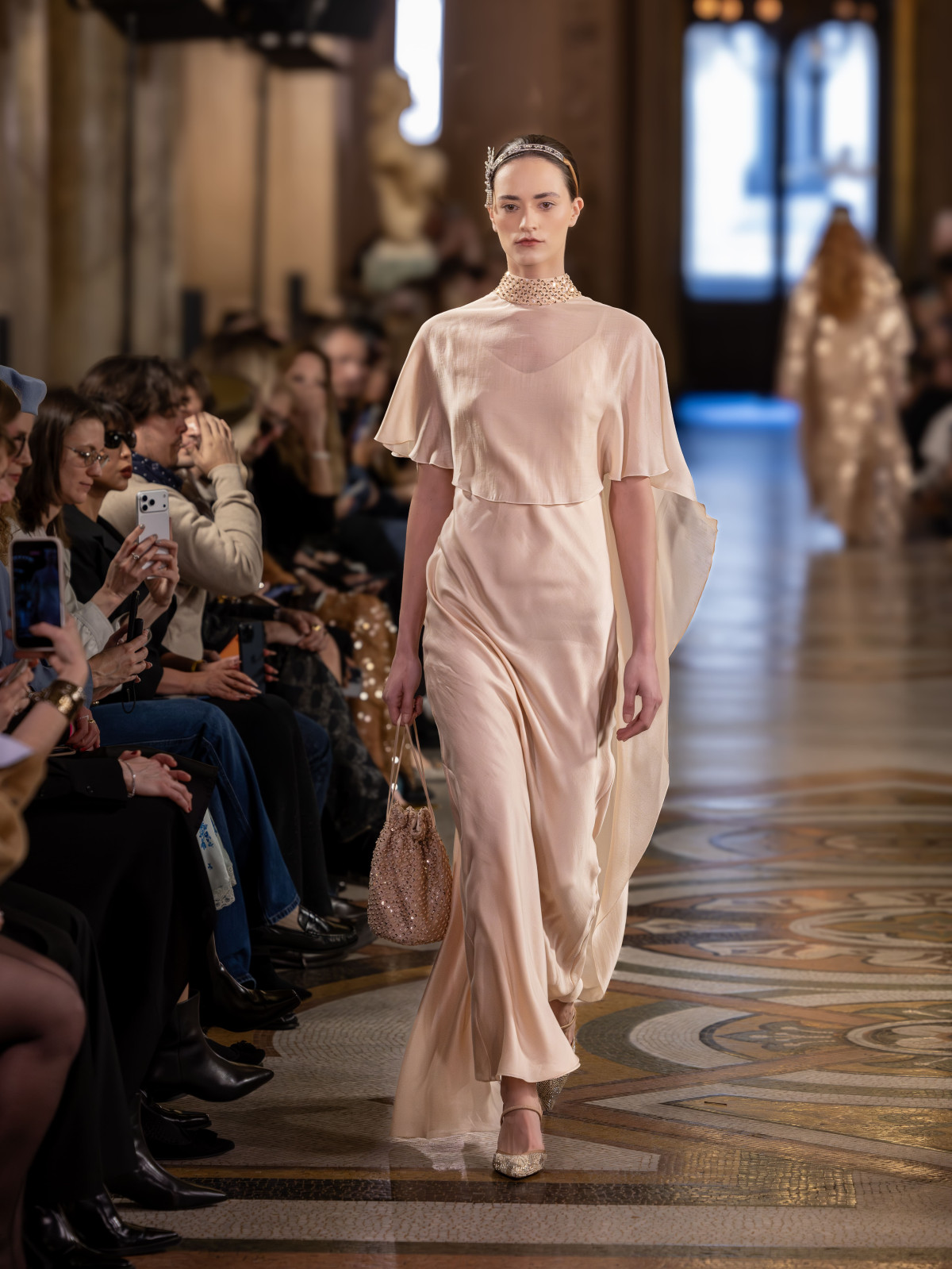 The collection emphasized balance and detail, with tailored forms and soft movement defining the looks as they moved through the grand halls of the venue. Subtle theatrical elements, including delicate feathered headpieces, added an element of drama while maintaining the brand’s signature sense of poise and elegance.