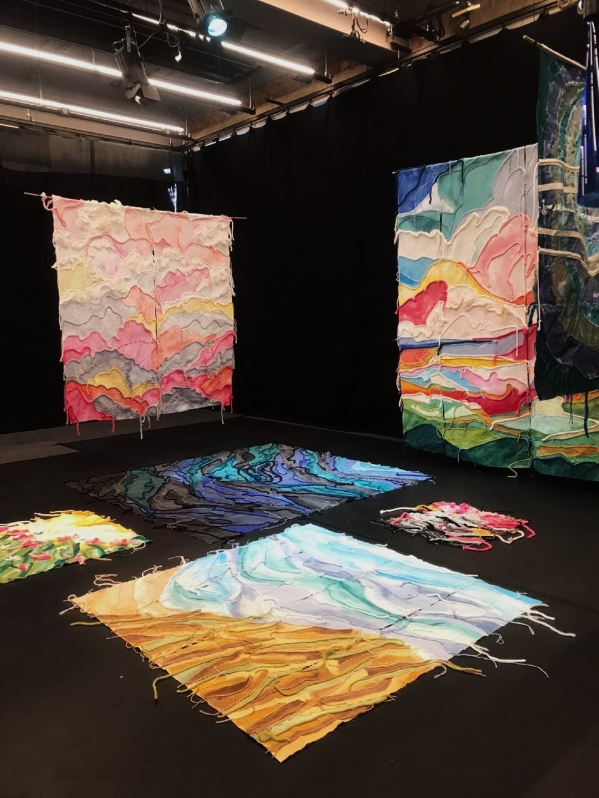 Her master’s project, Lost Soul, stands as a compelling synthesis of her methods. It explored the intersections of textile art, costume design, and performance through a series of large-scale, hand-painted textile landscapes. Each textile —depicting imagery such as stormy skies, ocean depths, and blooming fields —embodied a distinct emotional state: fear, hope, joy, solace, and liberation. Rather than remain static, these landscapes transformed into wearable garments through zero-waste pattern cutting, enabling them to move and evolve with the performer’s body.