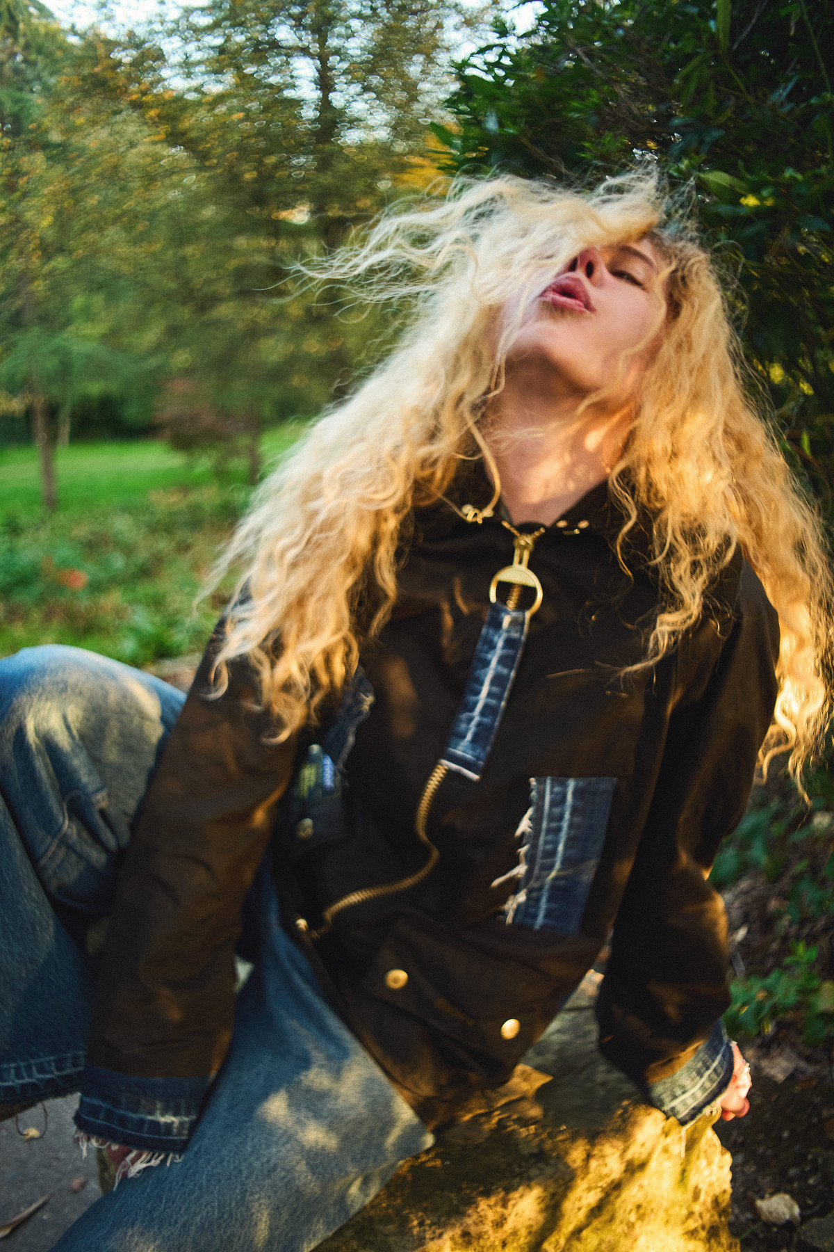 ALLERSTON WAXED JACKET — класичний силует Barbour, доповнений денім-печворком від KSENIASCHNAIDER. Вставки з деніму поєднані з унікальним матеріалом куртки — вощеним бавовняним полотном (waxed cotton), що винайшов бренд Barbour. Підкладку виробу з принтом «тартан» було збережено як частину оригінального конструктиву. Куртку доповнили кастомними бірками, фурнітурою, металевими елементами та характерними знаками KSENIASCHNAIDER.