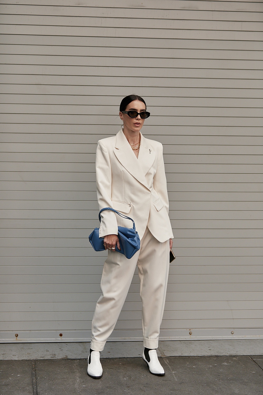 Брючные костюмы всех цветов и фасонов, белые рубашки и много трикотажа