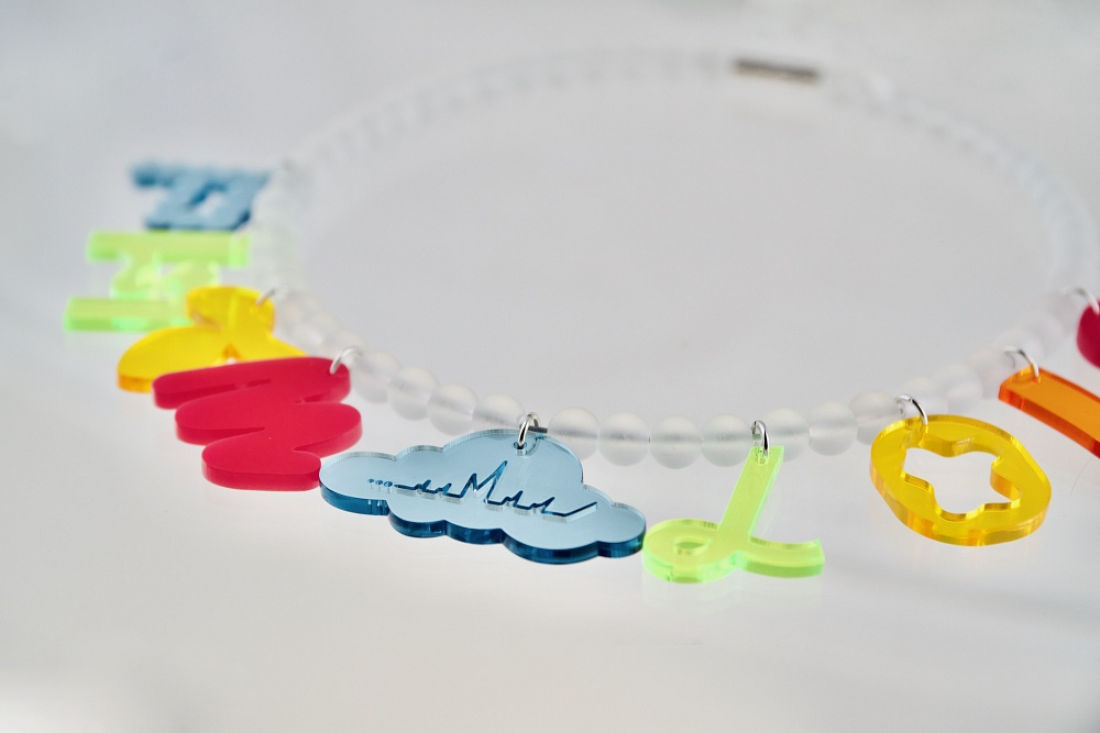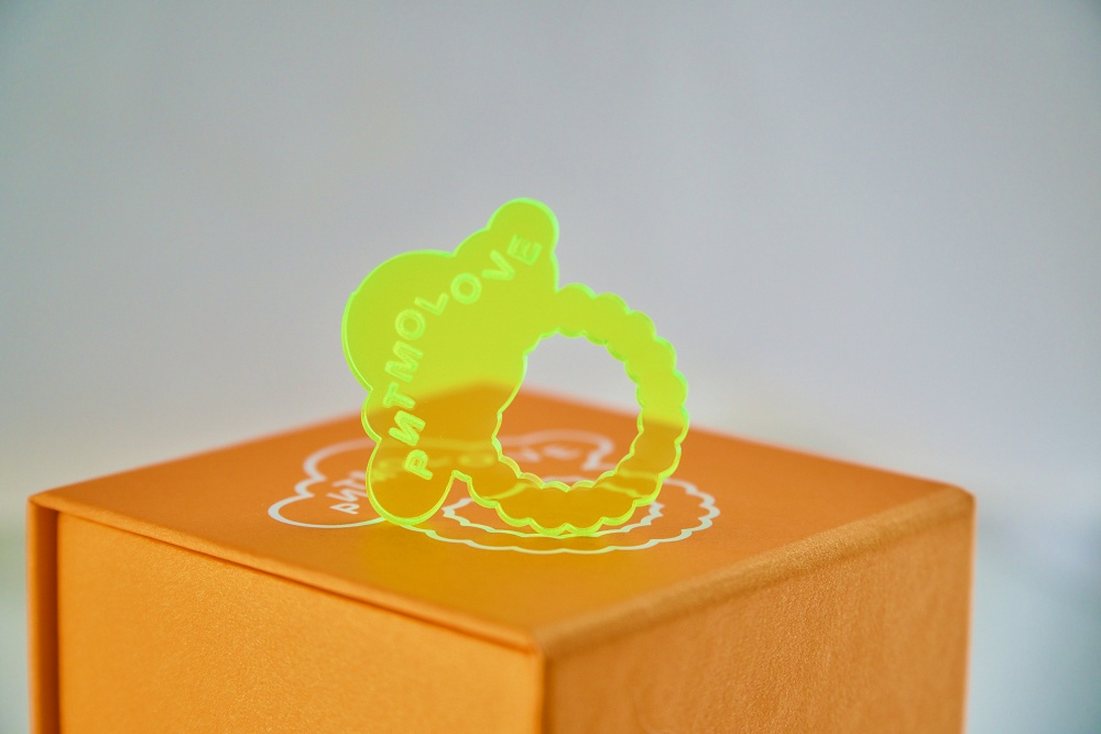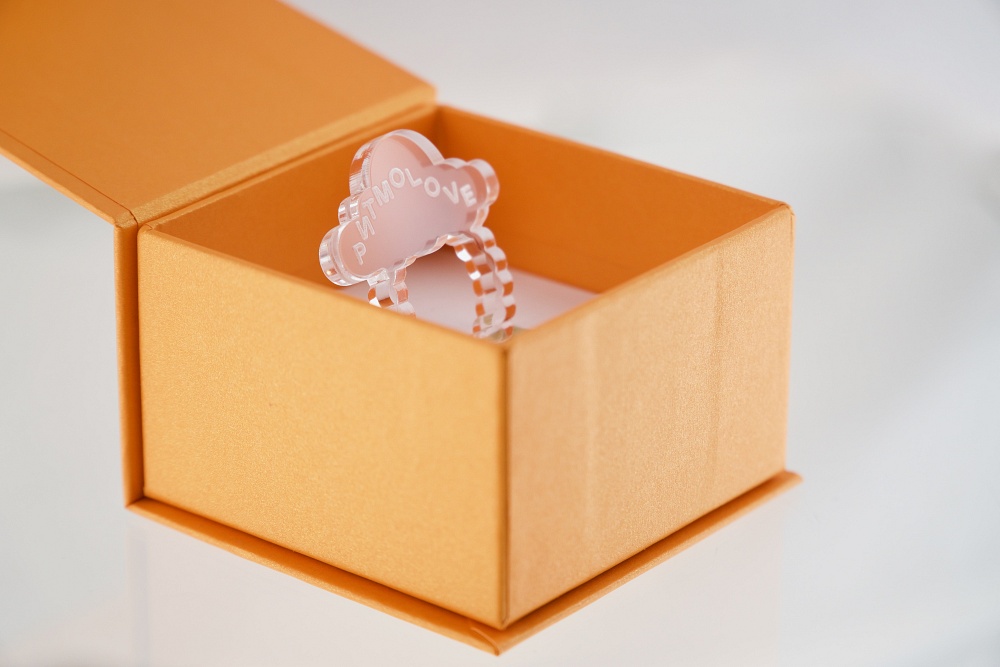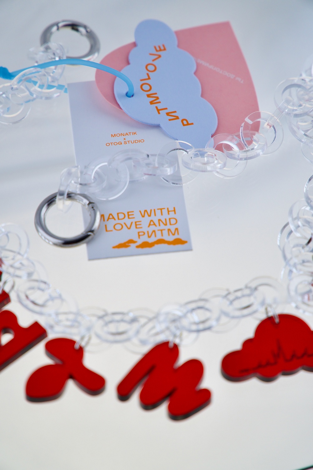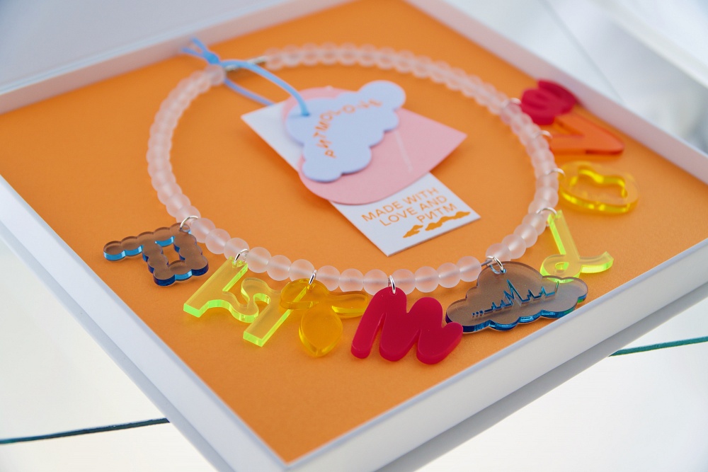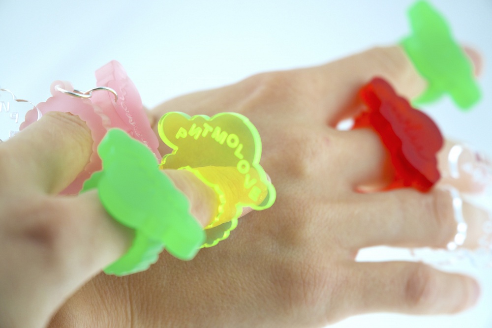 Основной материал — цветной прозрачный акрил актуальных оттенков, который был куплен в Германии. Каждое украшение — бусы, кольца, серьги, а также подвеска и брелок на кроссовки — сопровождается подарочной коробочкой с принтом с эффектом 3D.