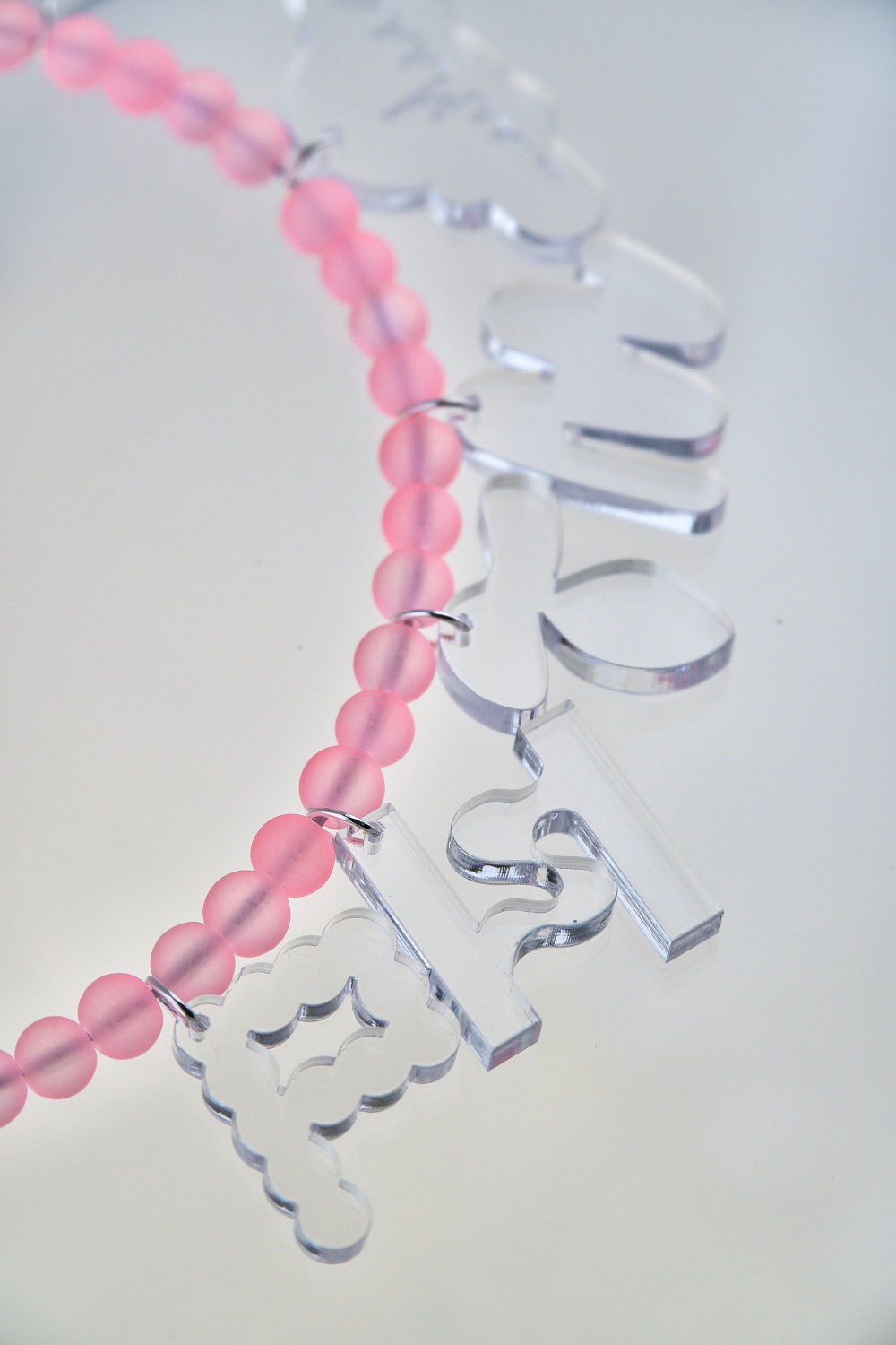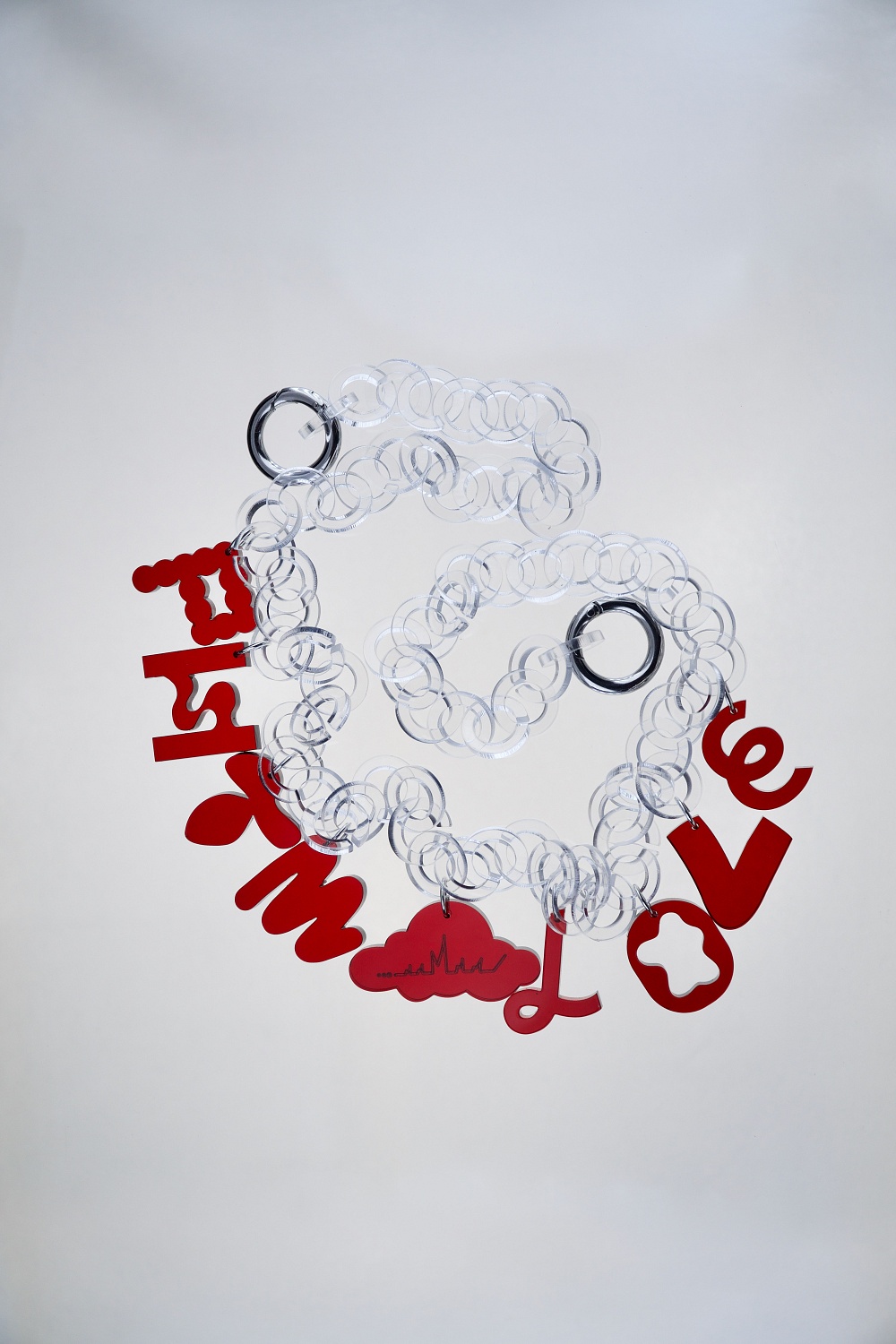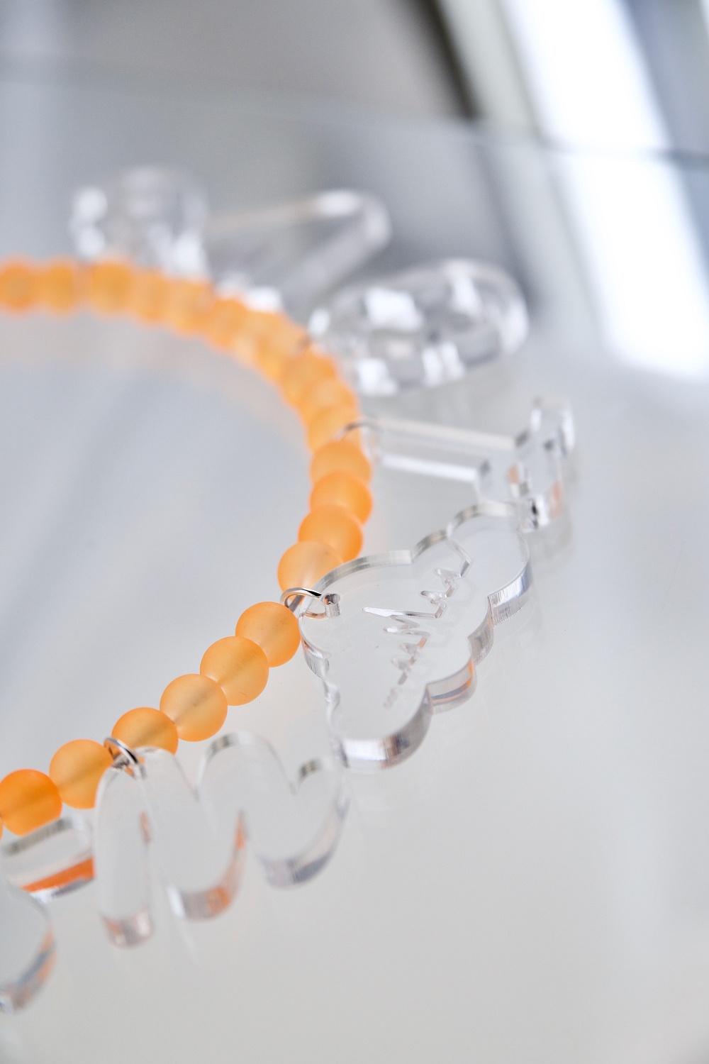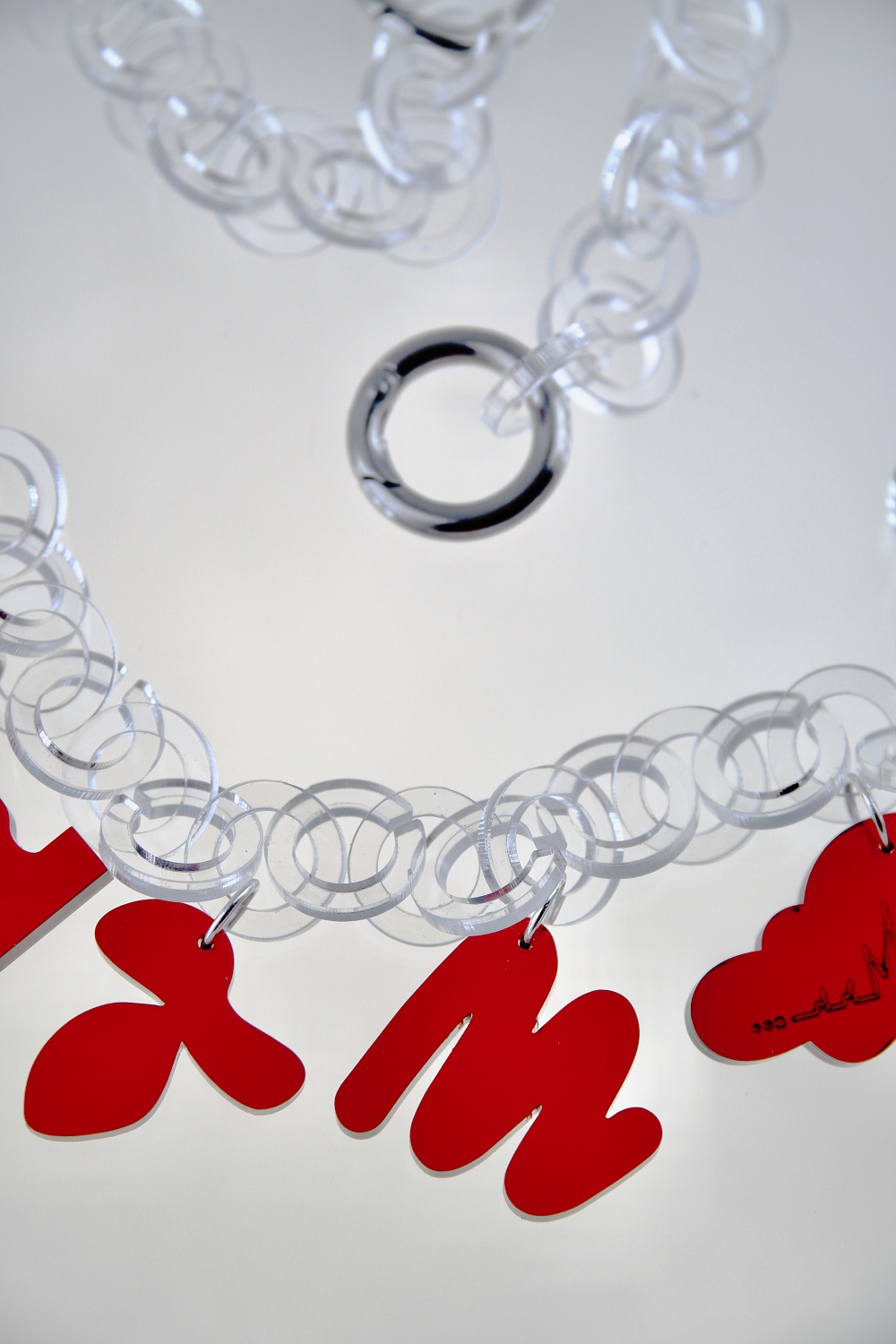 Основной материал — цветной прозрачный акрил актуальных оттенков, который был куплен в Германии. Каждое украшение — бусы, кольца, серьги, а также подвеска и брелок на кроссовки — сопровождается подарочной коробочкой с принтом с эффектом 3D.