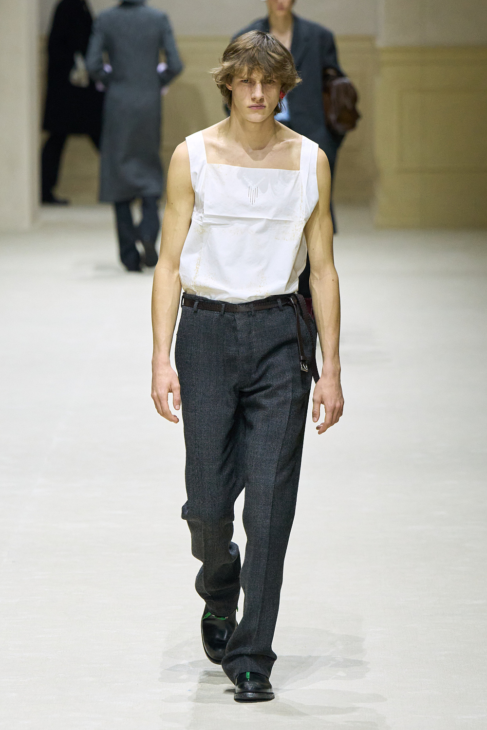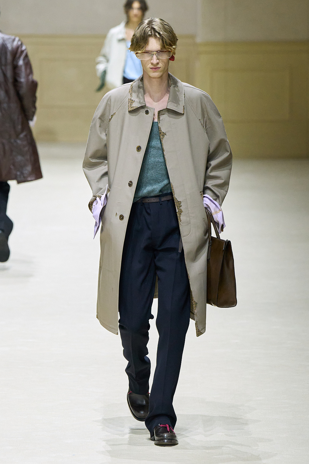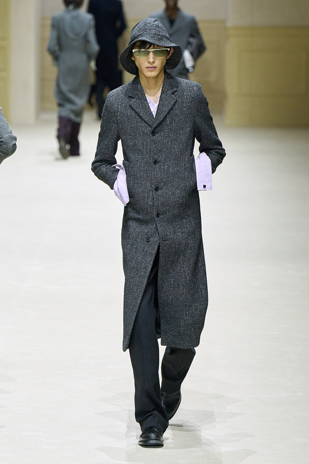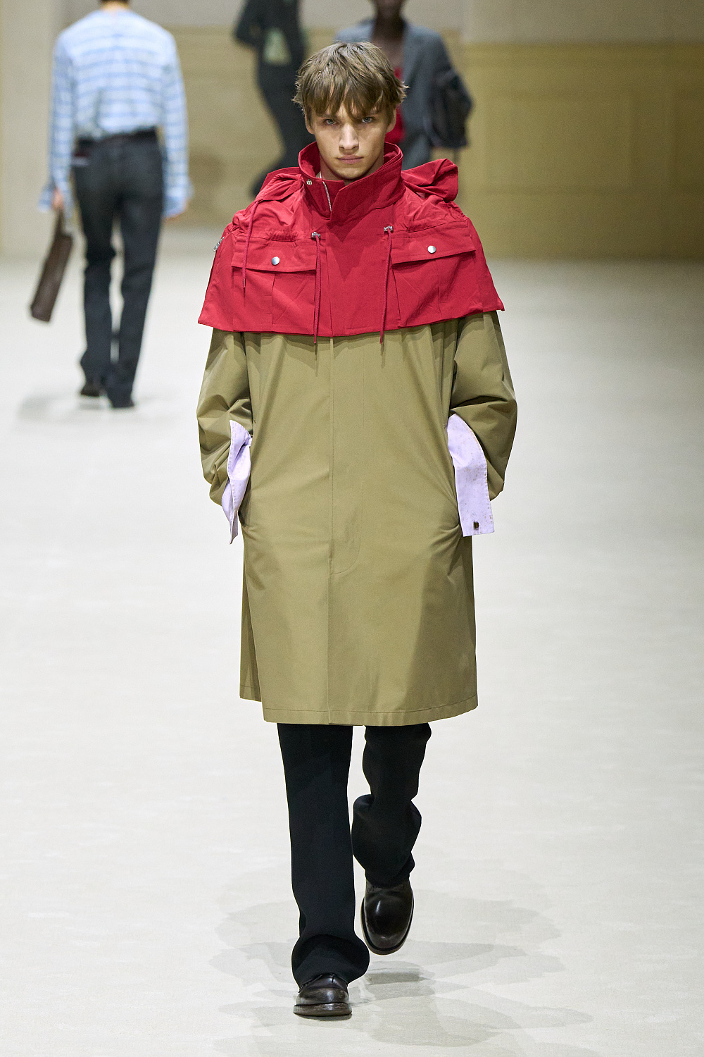 Загалом колекція постала як стриманий, але емоційно насичений роздум про стан невизначеності. Подовжені пальта з високою застібкою поєднувалися з розслабленими бомберами й блузонами, формуючи силуети з легкою недбалістю та ледь відчутним настроєм 1970-х. Аксесуари — зім’яті кепки й капелюхи — порушували звичну логіку носіння, додаючи образам відчуття зсуву від усталених правил. Альтернативу цій лінії складали тренчі та mac’и з яскравими кейпами, однак саме витончена, майже крихка форма стала найвиразнішим жестом сезону.