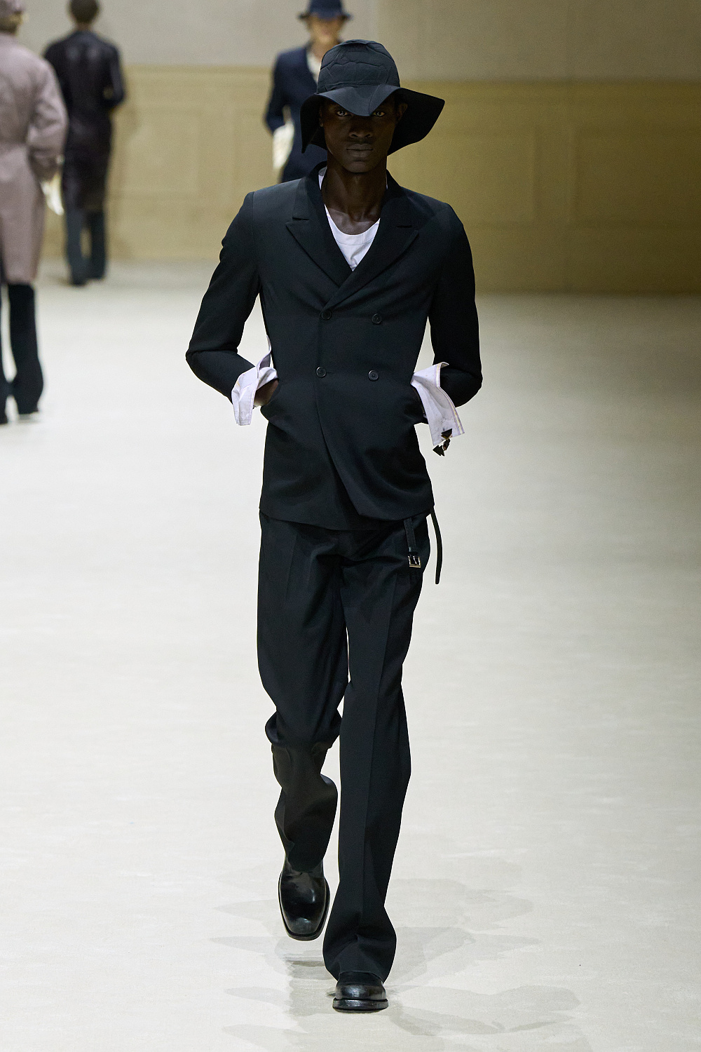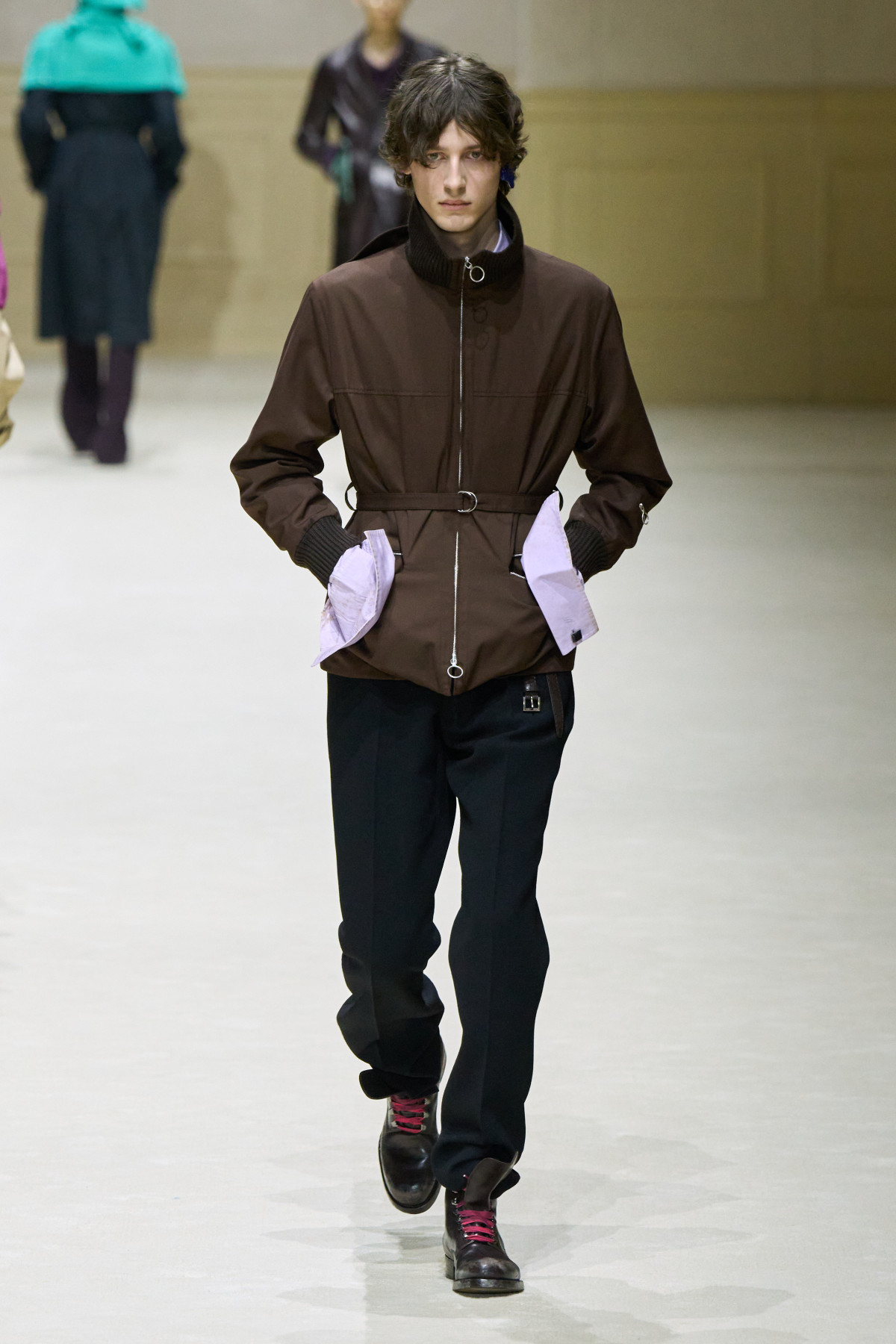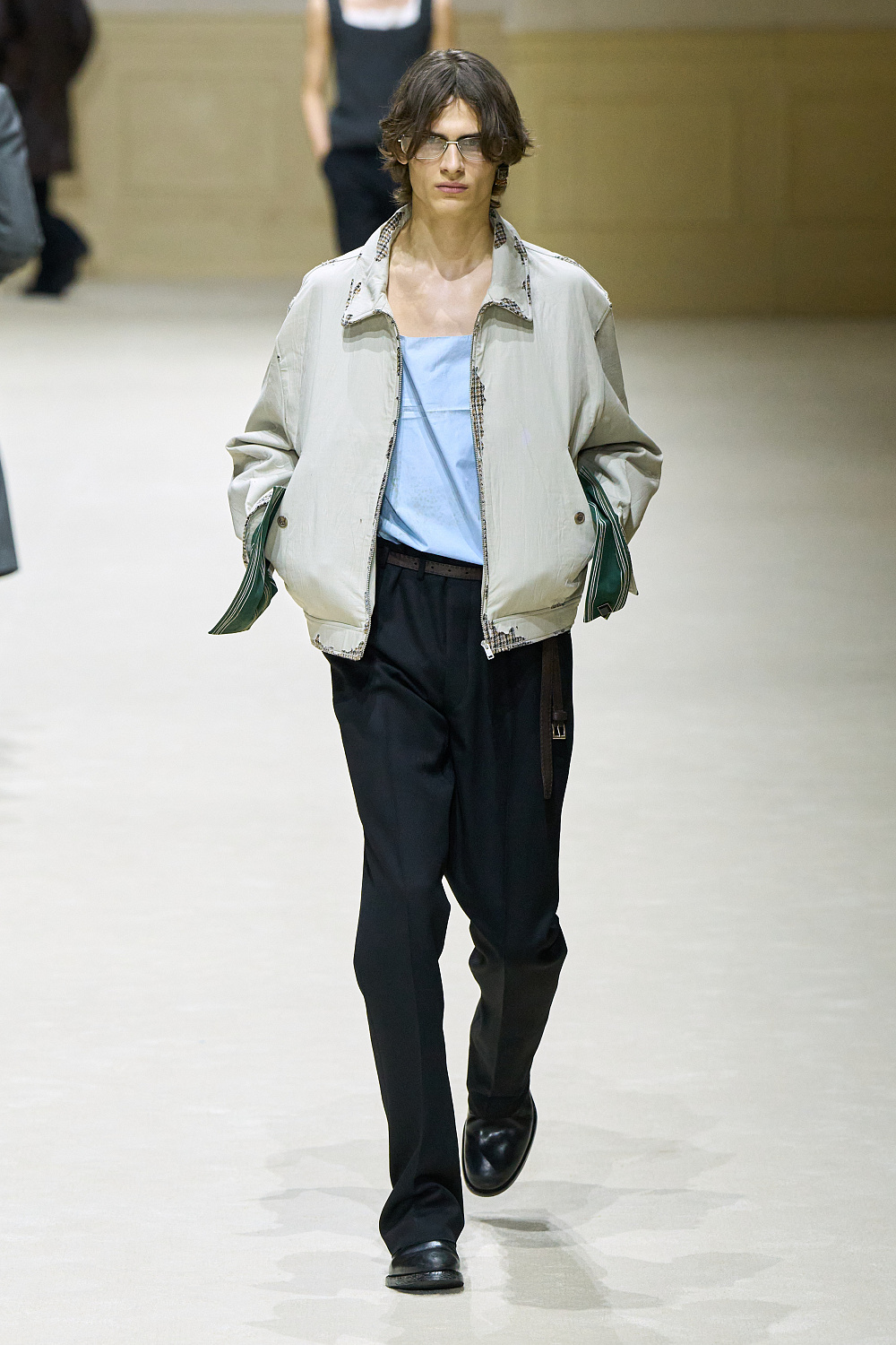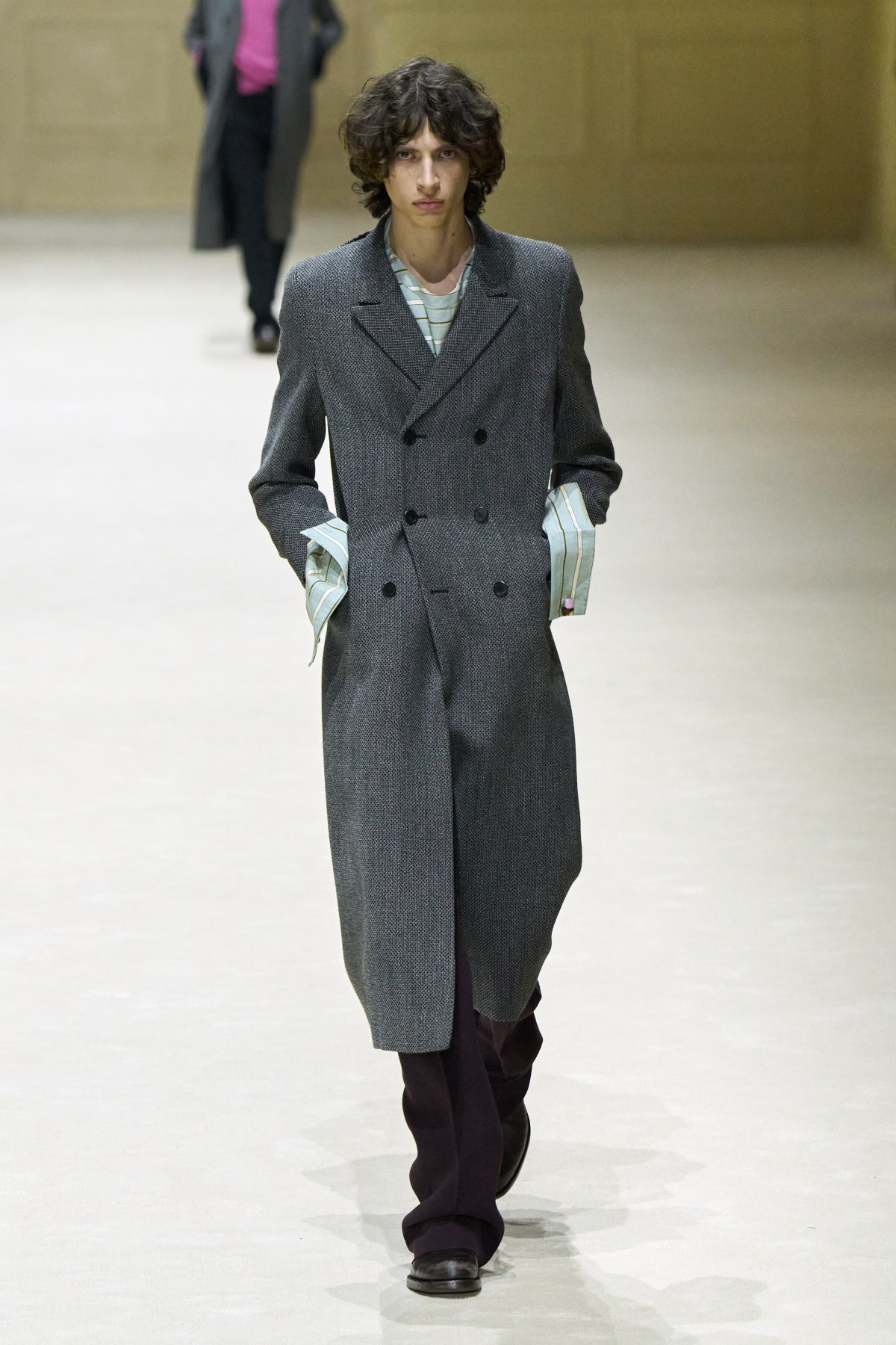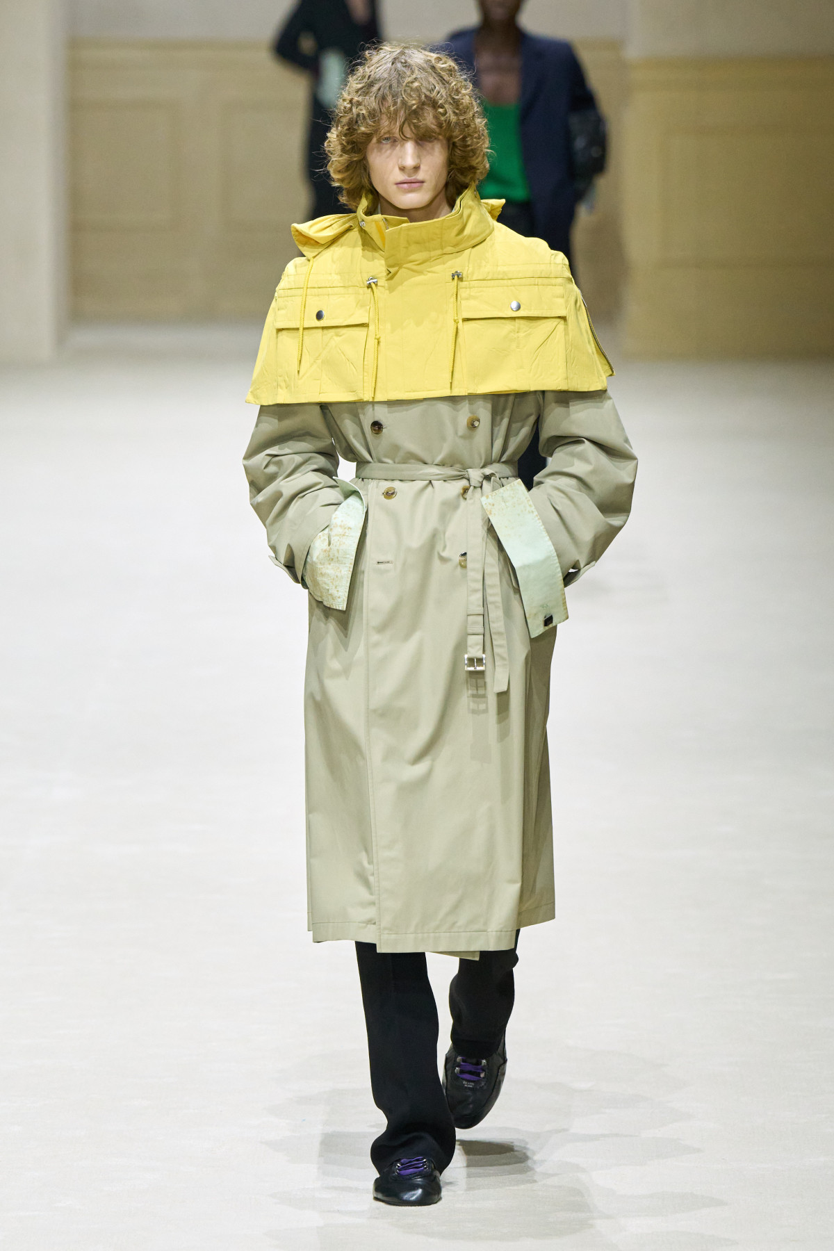 Загалом колекція постала як стриманий, але емоційно насичений роздум про стан невизначеності. Подовжені пальта з високою застібкою поєднувалися з розслабленими бомберами й блузонами, формуючи силуети з легкою недбалістю та ледь відчутним настроєм 1970-х. Аксесуари — зім’яті кепки й капелюхи — порушували звичну логіку носіння, додаючи образам відчуття зсуву від усталених правил. Альтернативу цій лінії складали тренчі та mac’и з яскравими кейпами, однак саме витончена, майже крихка форма стала найвиразнішим жестом сезону.