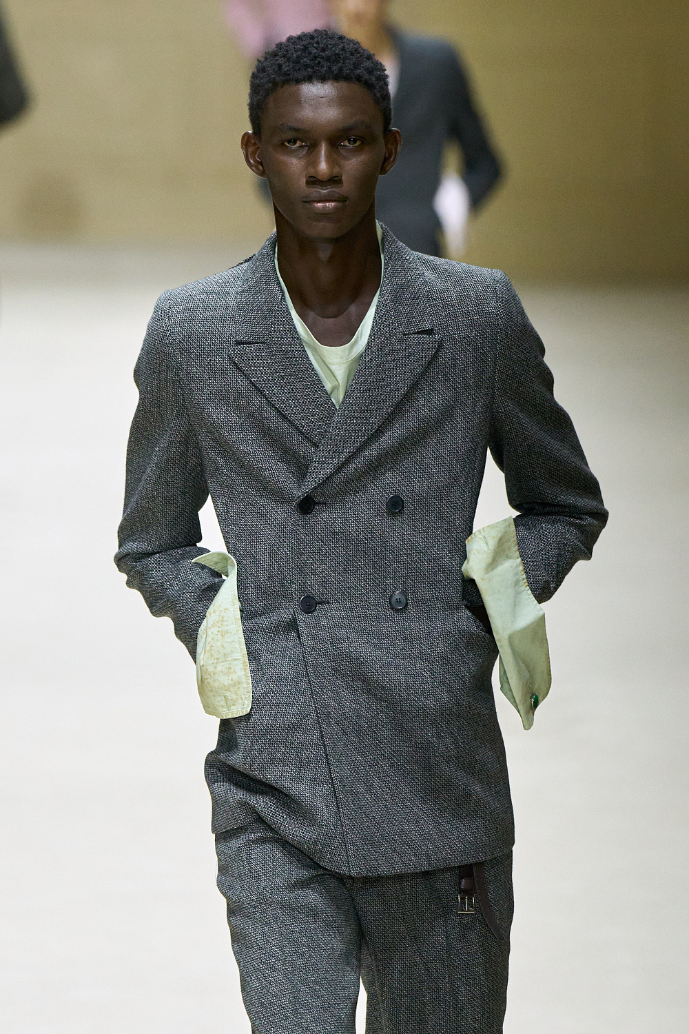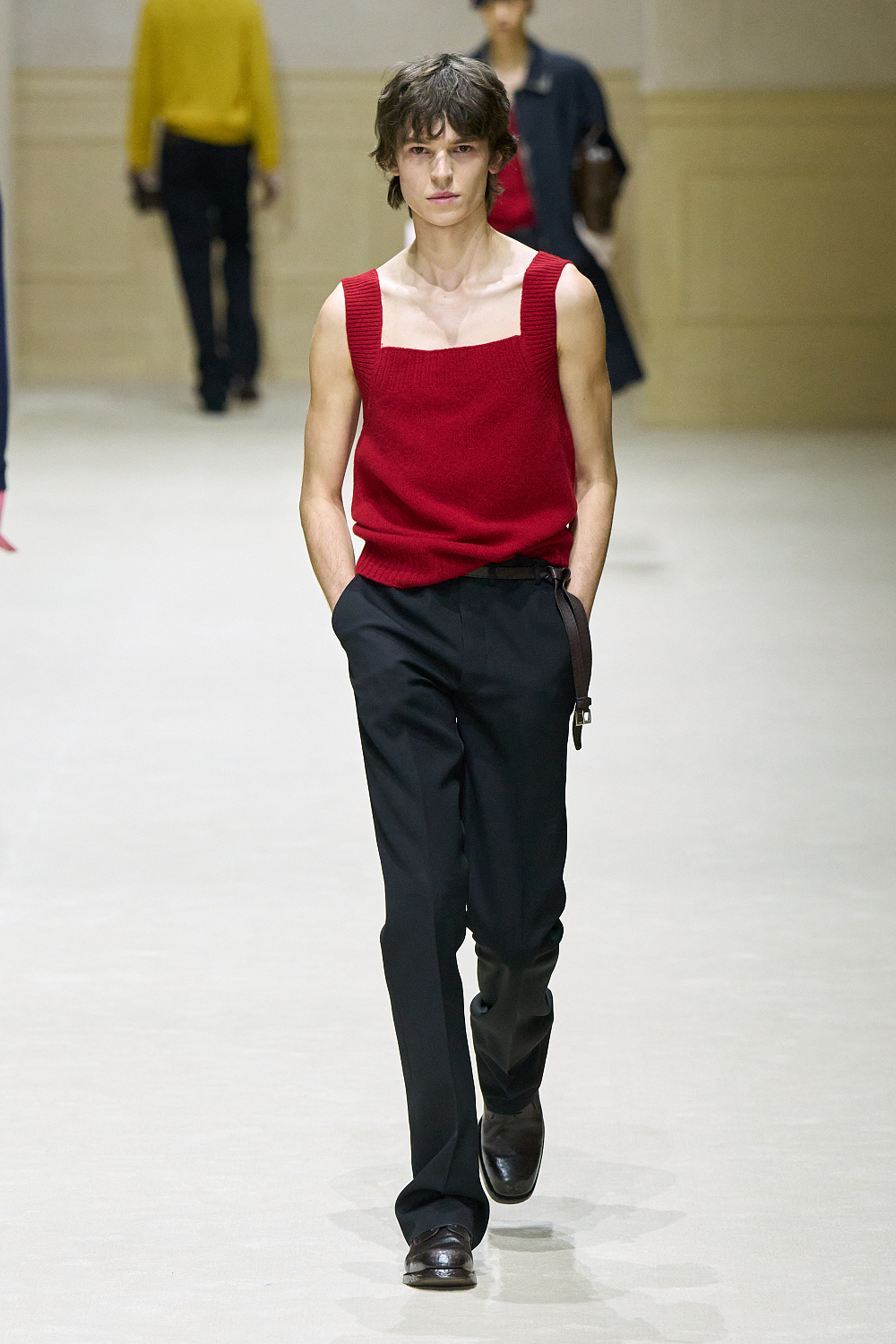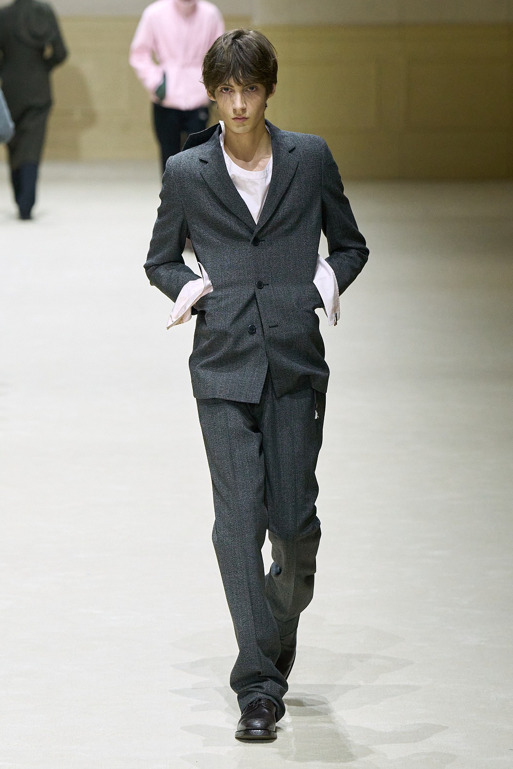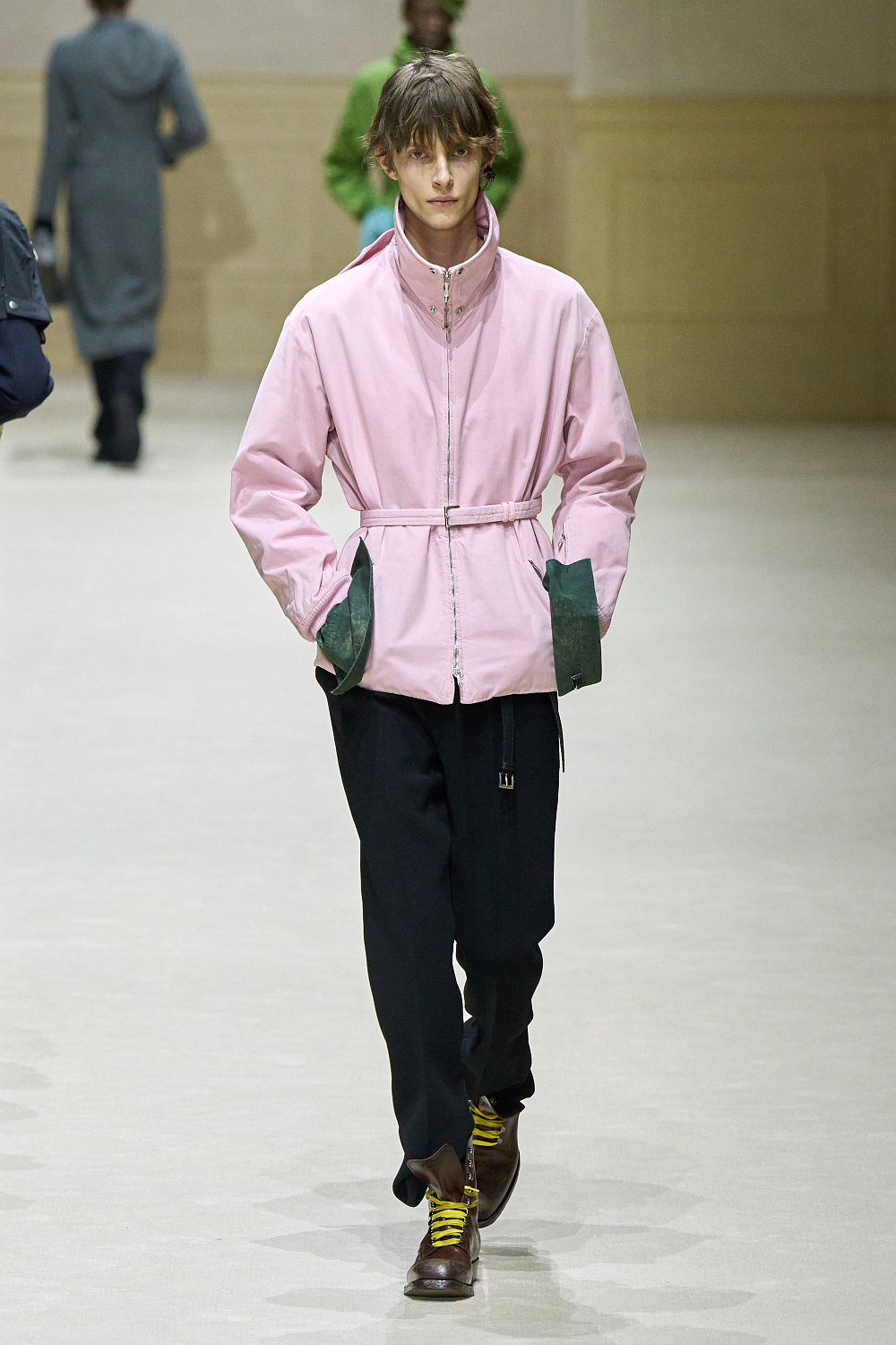 Загалом колекція постала як стриманий, але емоційно насичений роздум про стан невизначеності. Подовжені пальта з високою застібкою поєднувалися з розслабленими бомберами й блузонами, формуючи силуети з легкою недбалістю та ледь відчутним настроєм 1970-х. Аксесуари — зім’яті кепки й капелюхи — порушували звичну логіку носіння, додаючи образам відчуття зсуву від усталених правил. Альтернативу цій лінії складали тренчі та mac’и з яскравими кейпами, однак саме витончена, майже крихка форма стала найвиразнішим жестом сезону.