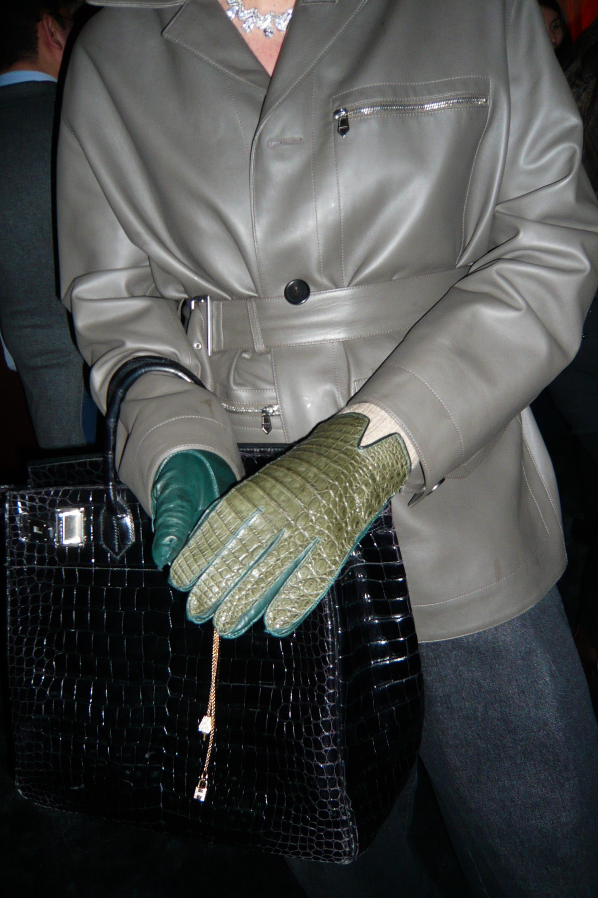 On its hands, green crocodile gloves added a jolt of saturated color and texture, a controlled flash that kept the ensemble from slipping into understatement.