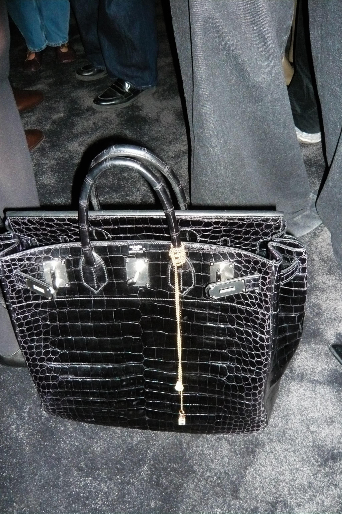 The final anchor of the look was a Hermès 40 crocodile Haut à Courroies, finished with a diamond chain that pushed the ensemble decisively into collector territory. The bag, historically associated with travel and status, read here as a piece of portable architecture — rigid, gleaming, and unmistakably intentional. Together, the coat, gloves, bracelet, and HAC formed a portrait of Borchers as an art‑minded European figure who treats dressing for a show not as attendance, but as collaboration with the house itself.