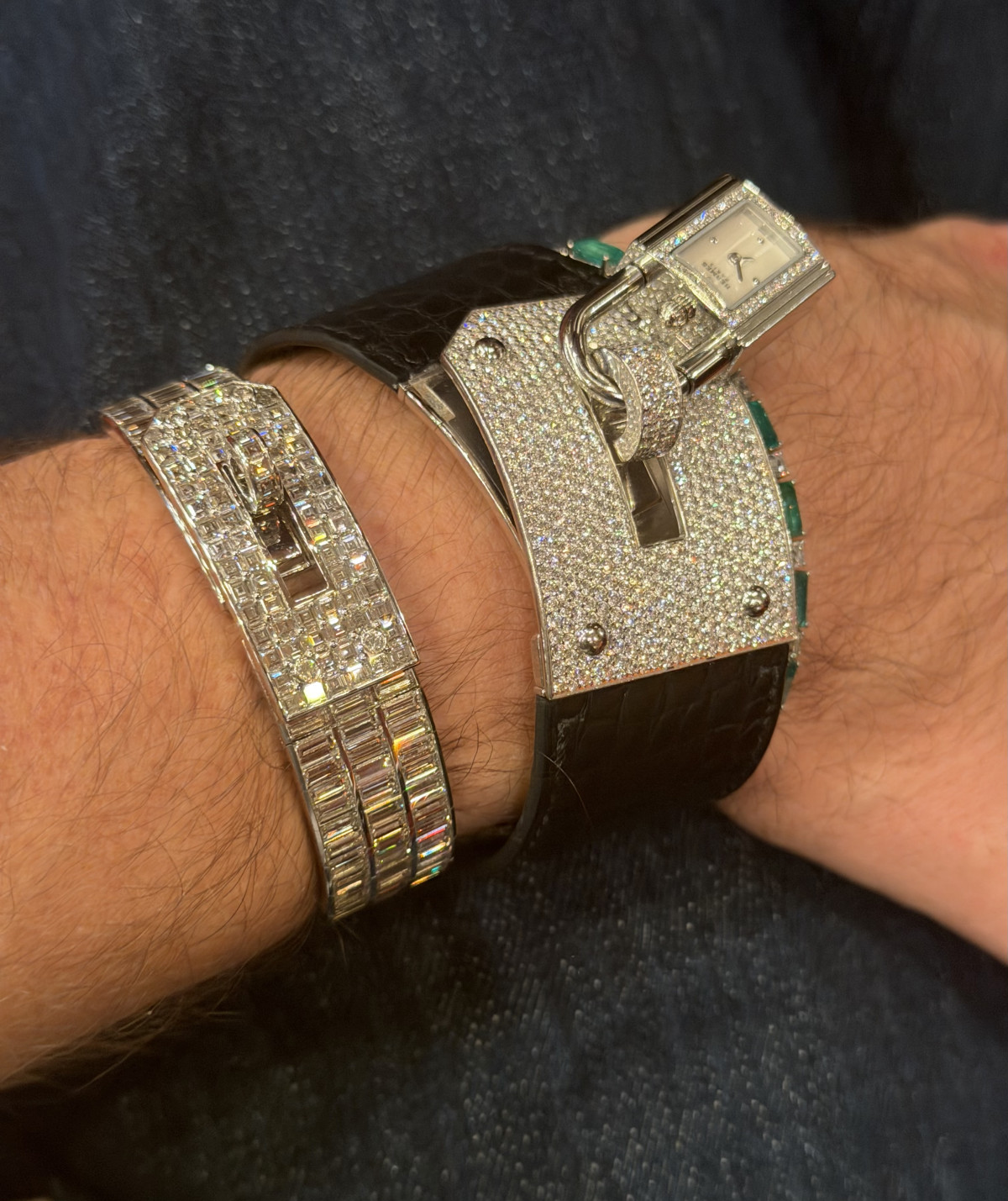 Around the wrist, a fully pavé Kelly crocodile bracelet with integrated watch functioned as both timepiece and jewel, the kind of object that quietly announces access to the most rarefied corners of the Hermès universe next to a full Kelly pave baguette bracelet.