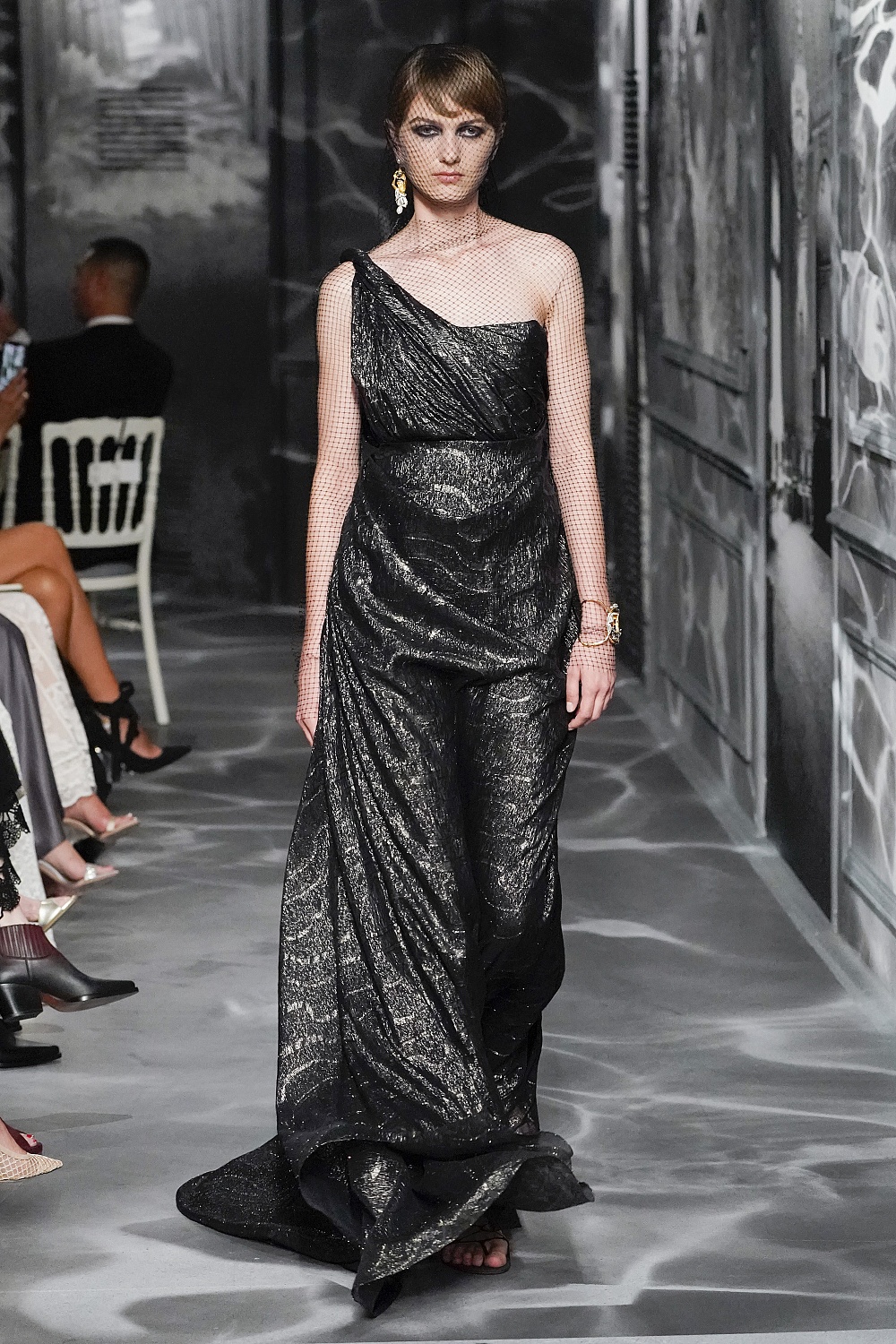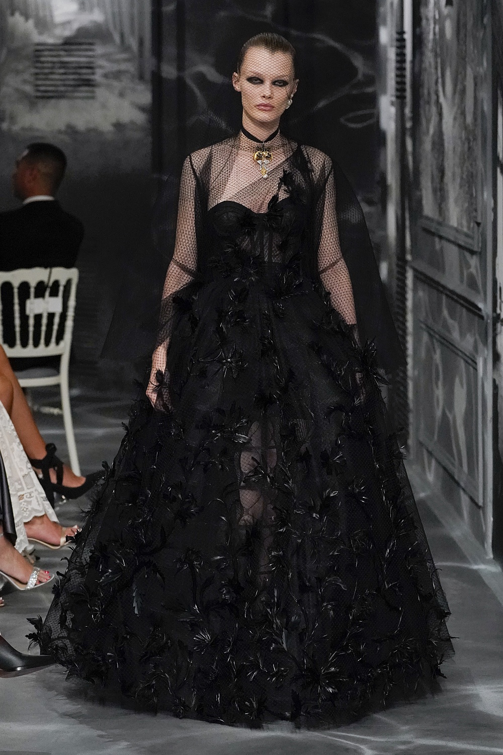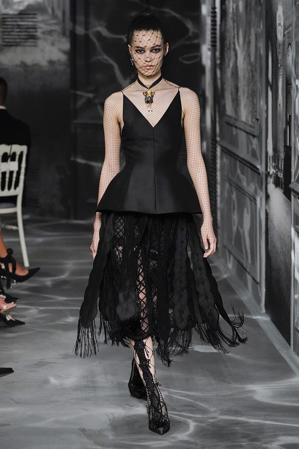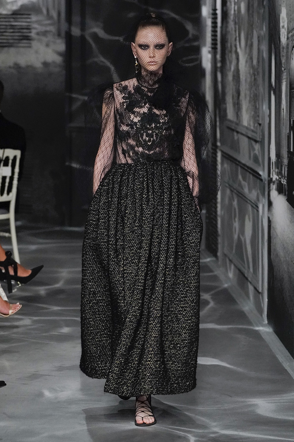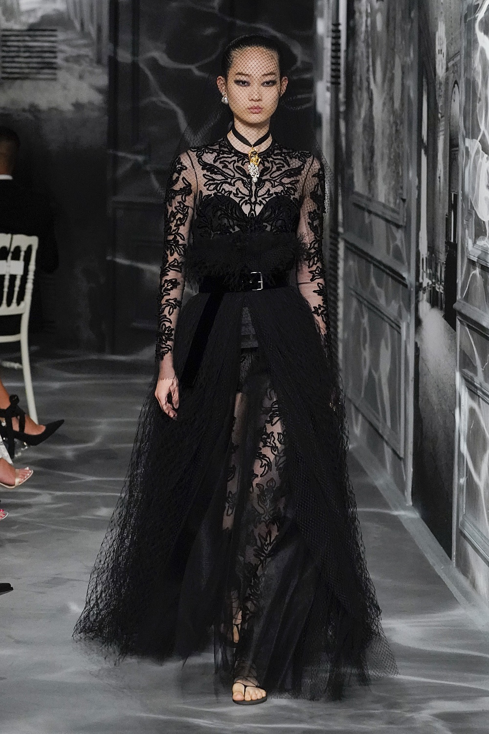 Бал традиционно правил черный цвет: модели ходили по подиуму в струящихся платьях в пол, костюмах сложного архитектурного кроя и жакетах-кольчугах. Яркими акцентами стали вуаль, гладиаторские сандалии, моносерьги и колготки-сетка. Одним из самых запоминающихся стало платье в форме самой штаб-квартиры дома Dior, которое закрывало показ.