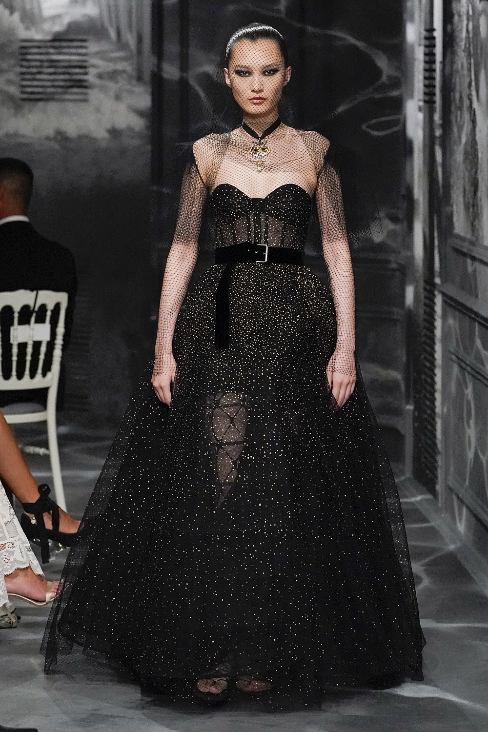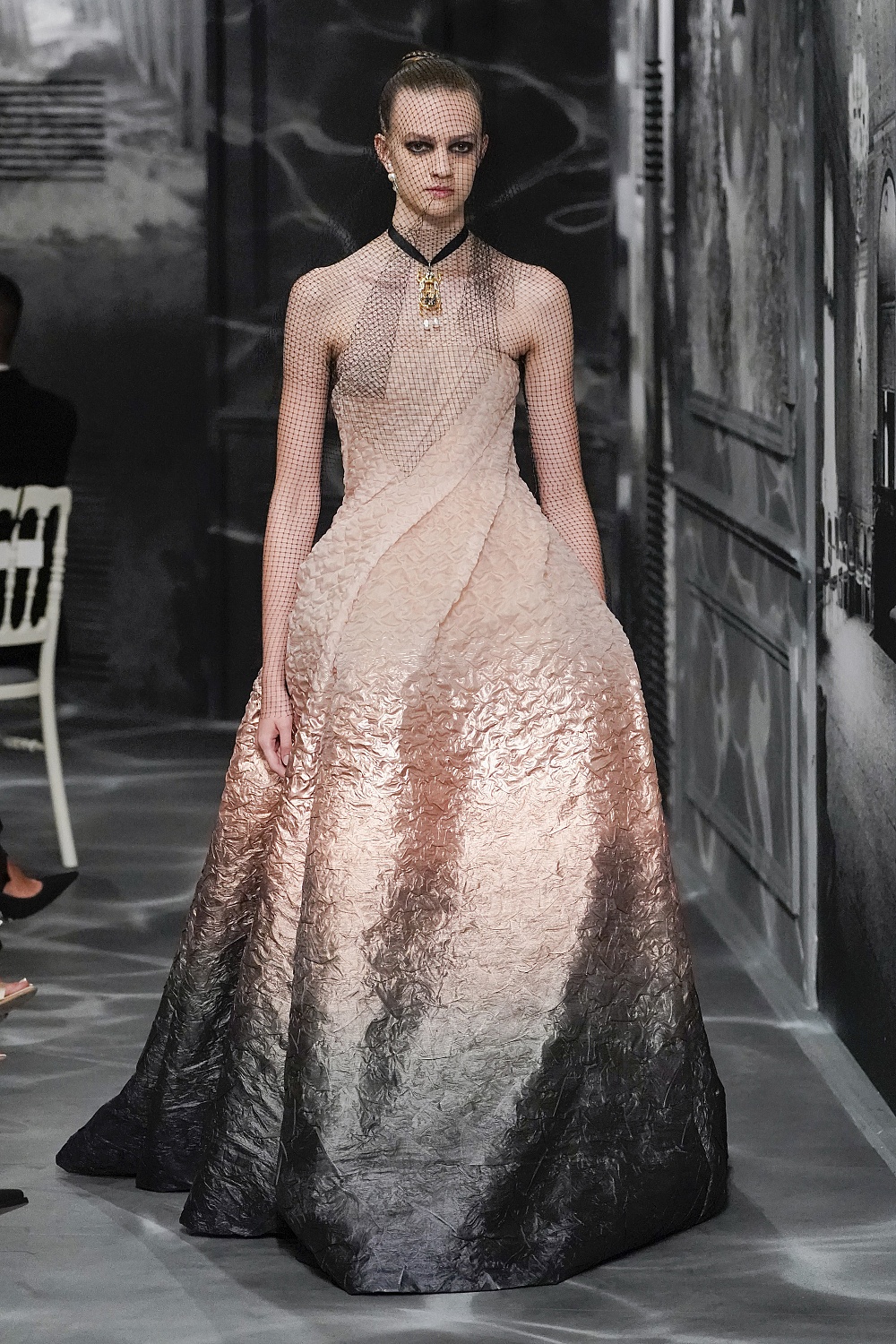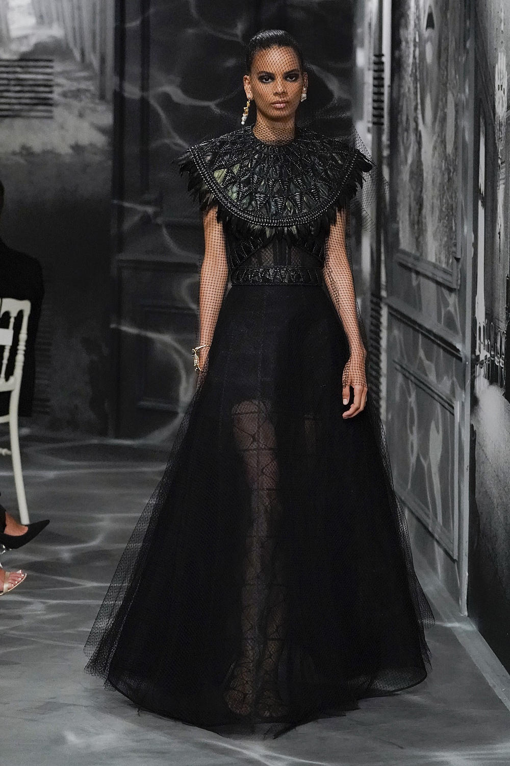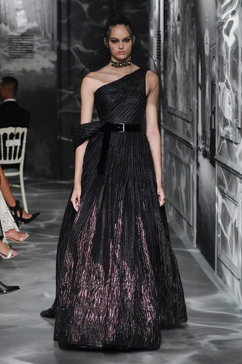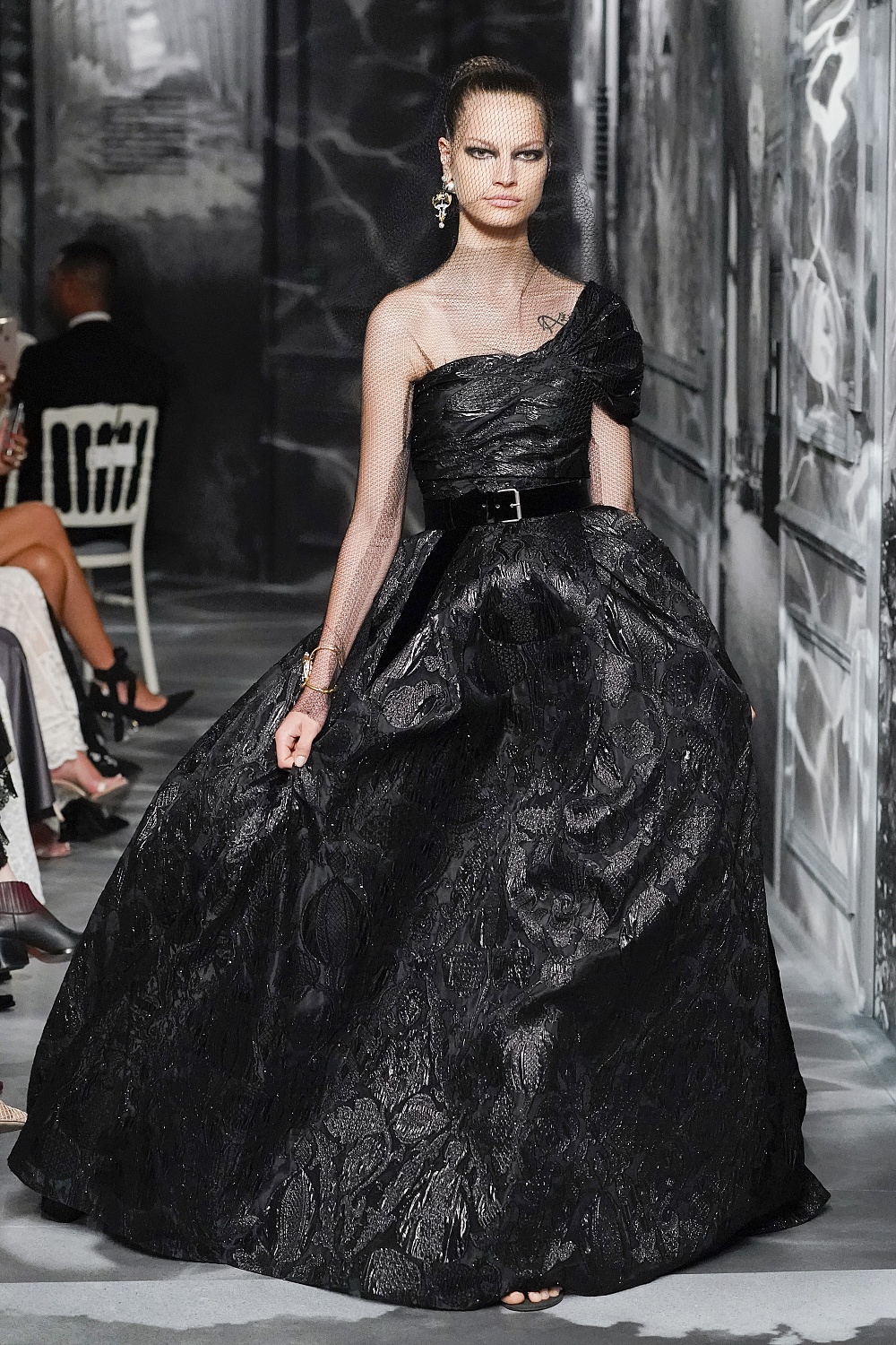 Бал традиционно правил черный цвет: модели ходили по подиуму в струящихся платьях в пол, костюмах сложного архитектурного кроя и жакетах-кольчугах. Яркими акцентами стали вуаль, гладиаторские сандалии, моносерьги и колготки-сетка. Одним из самых запоминающихся стало платье в форме самой штаб-квартиры дома Dior, которое закрывало показ.