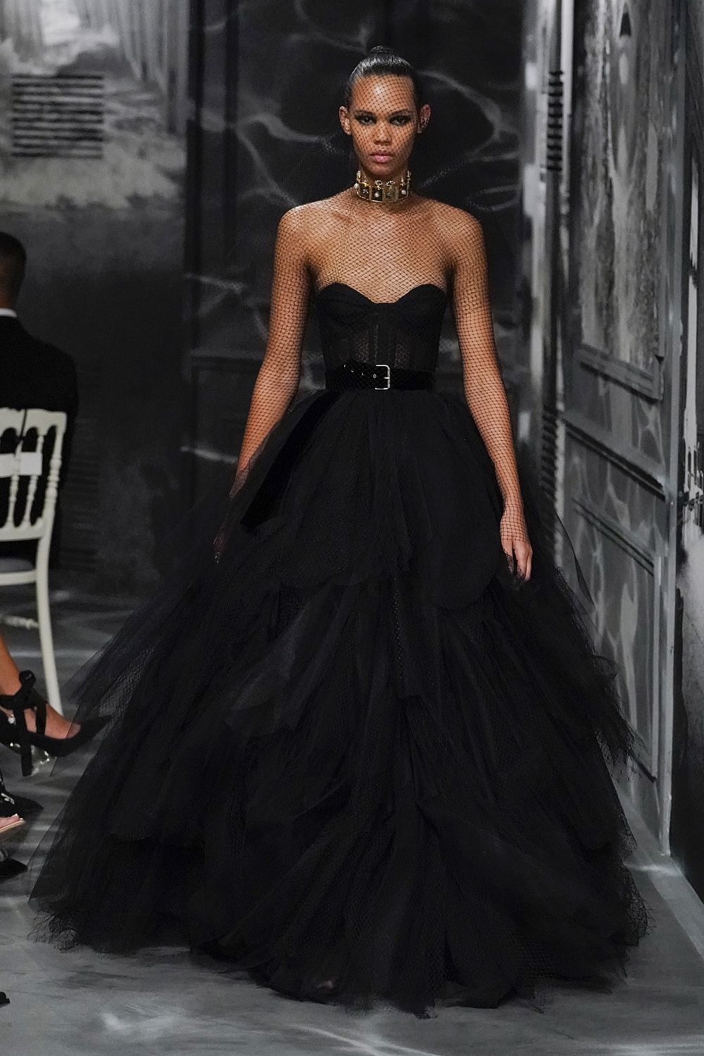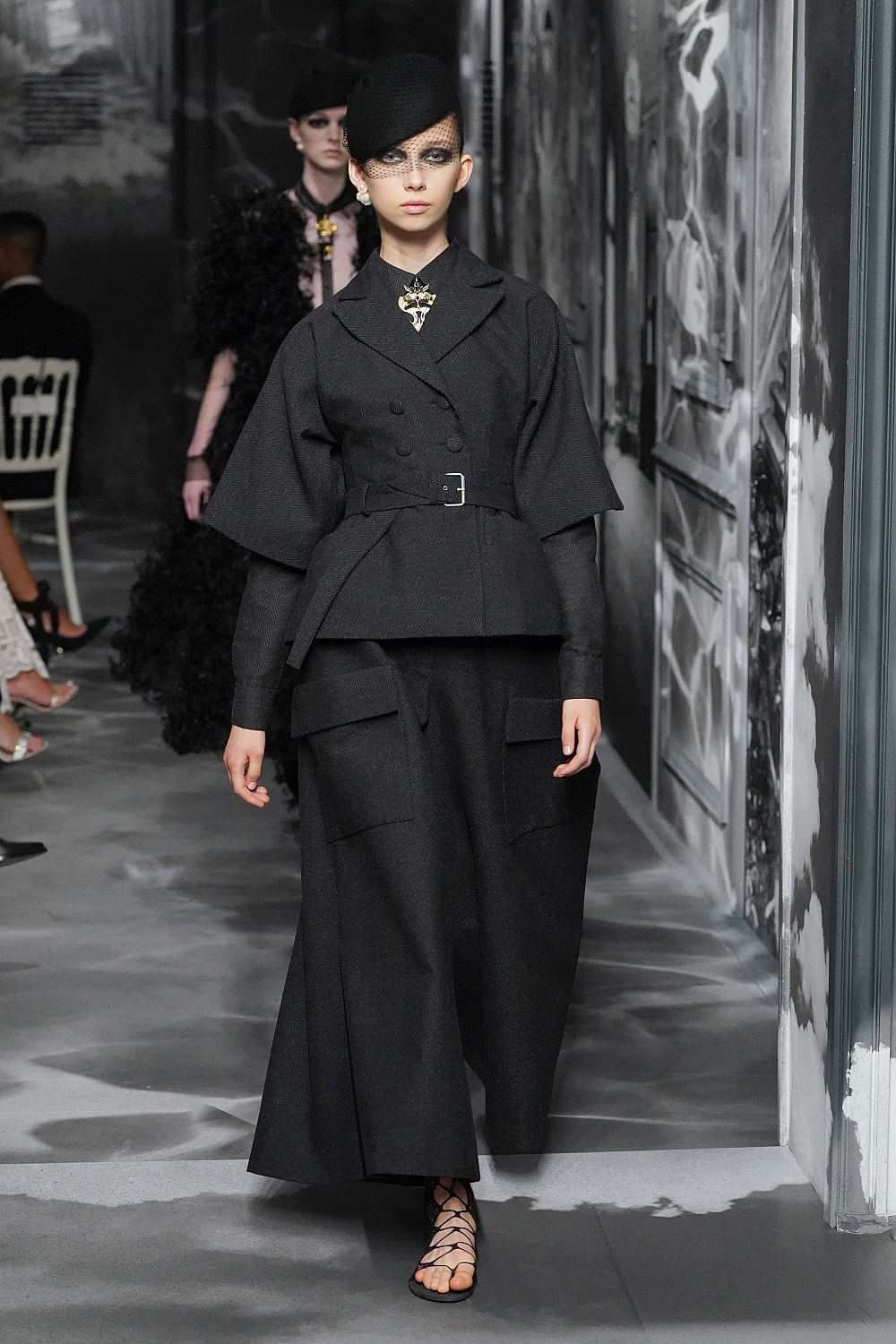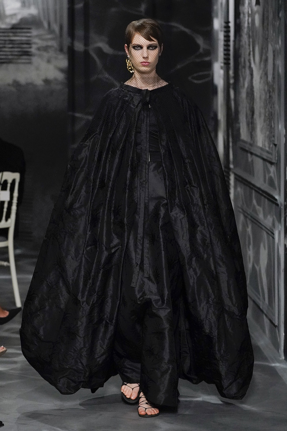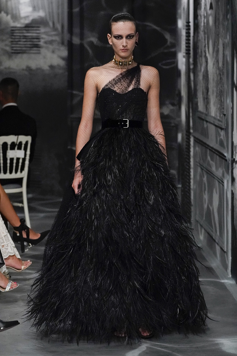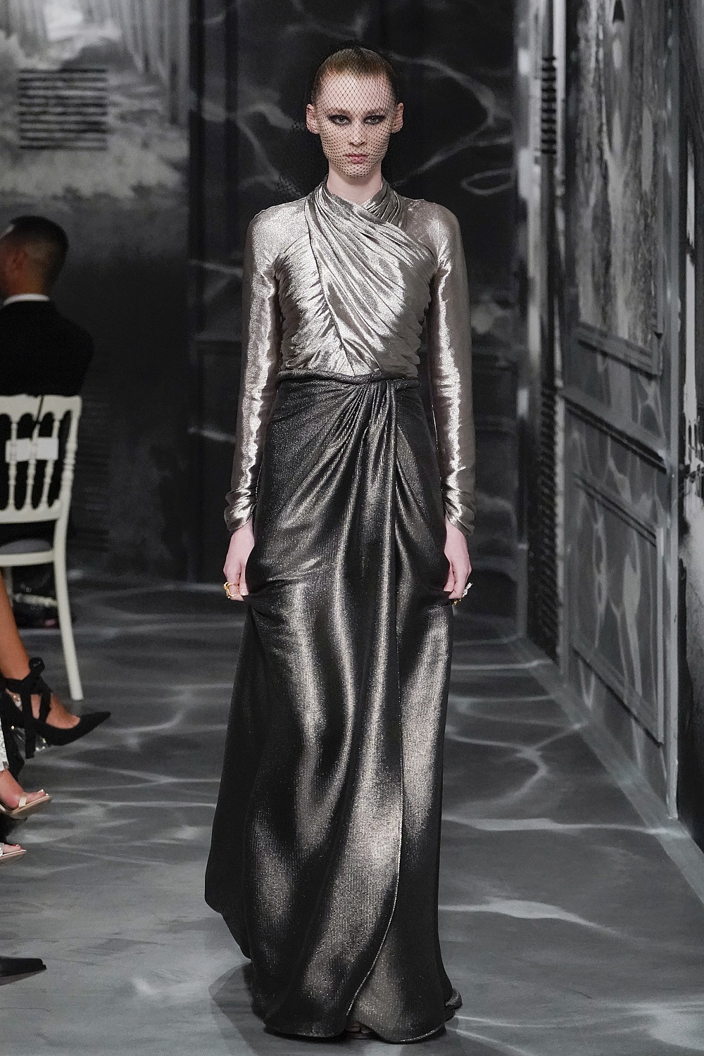 Бал традиционно правил черный цвет: модели ходили по подиуму в струящихся платьях в пол, костюмах сложного архитектурного кроя и жакетах-кольчугах. Яркими акцентами стали вуаль, гладиаторские сандалии, моносерьги и колготки-сетка. Одним из самых запоминающихся стало платье в форме самой штаб-квартиры дома Dior, которое закрывало показ.
