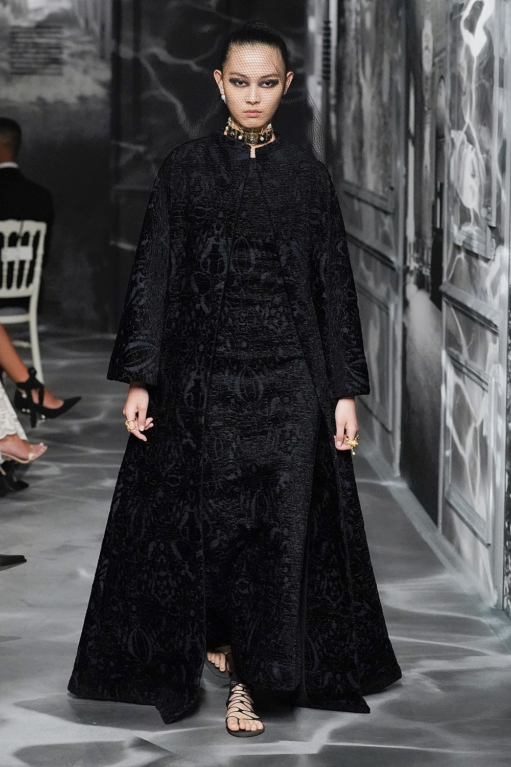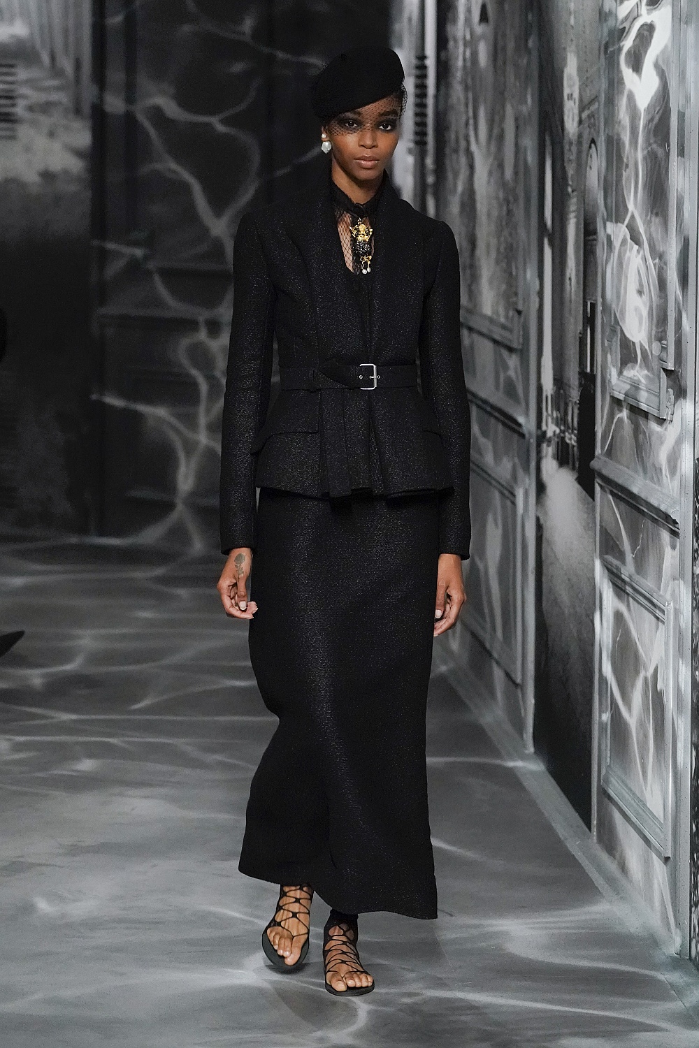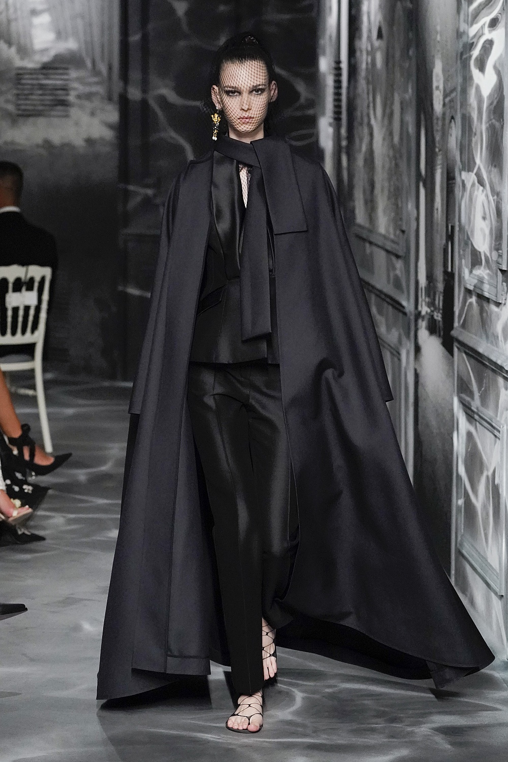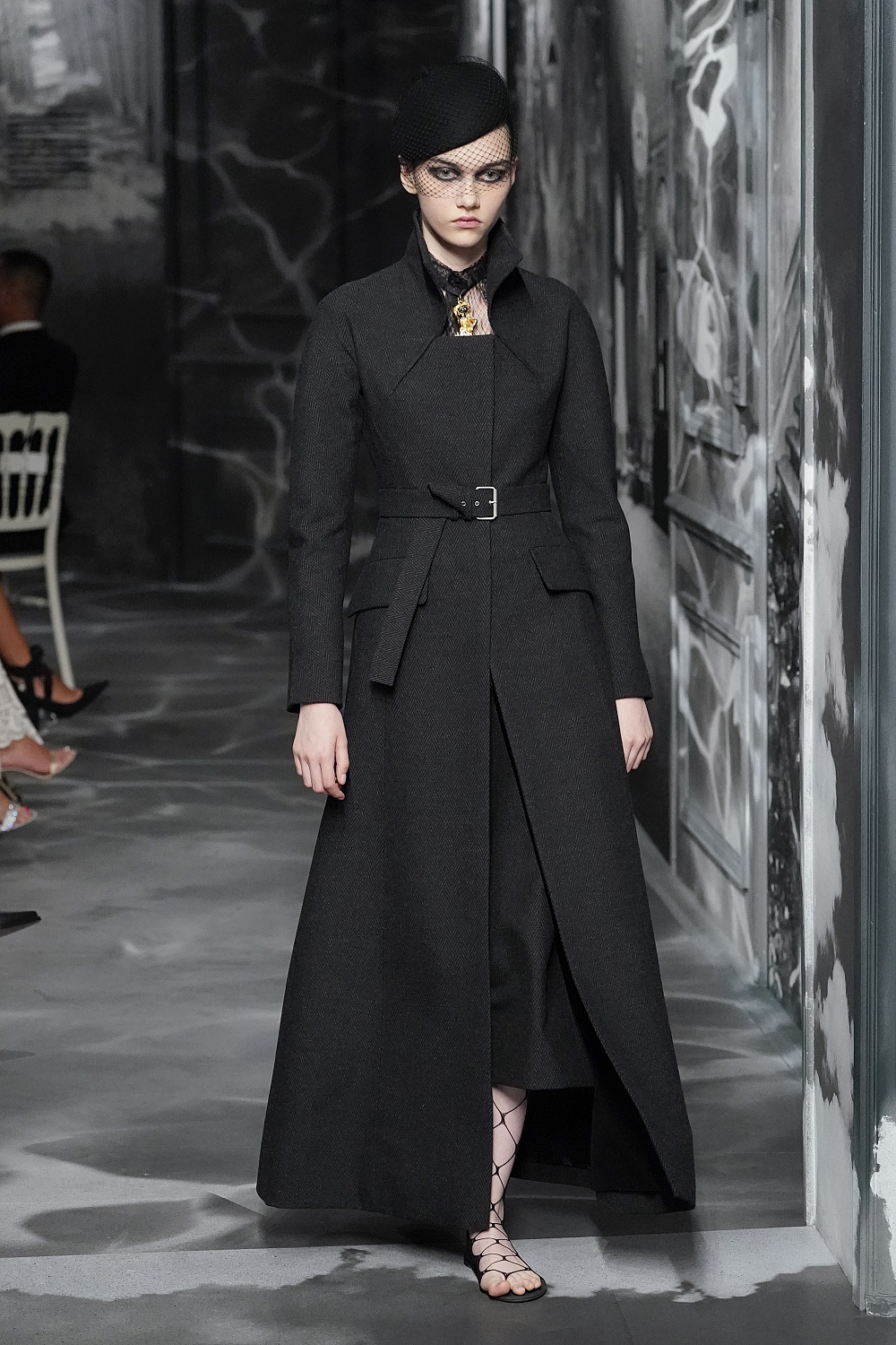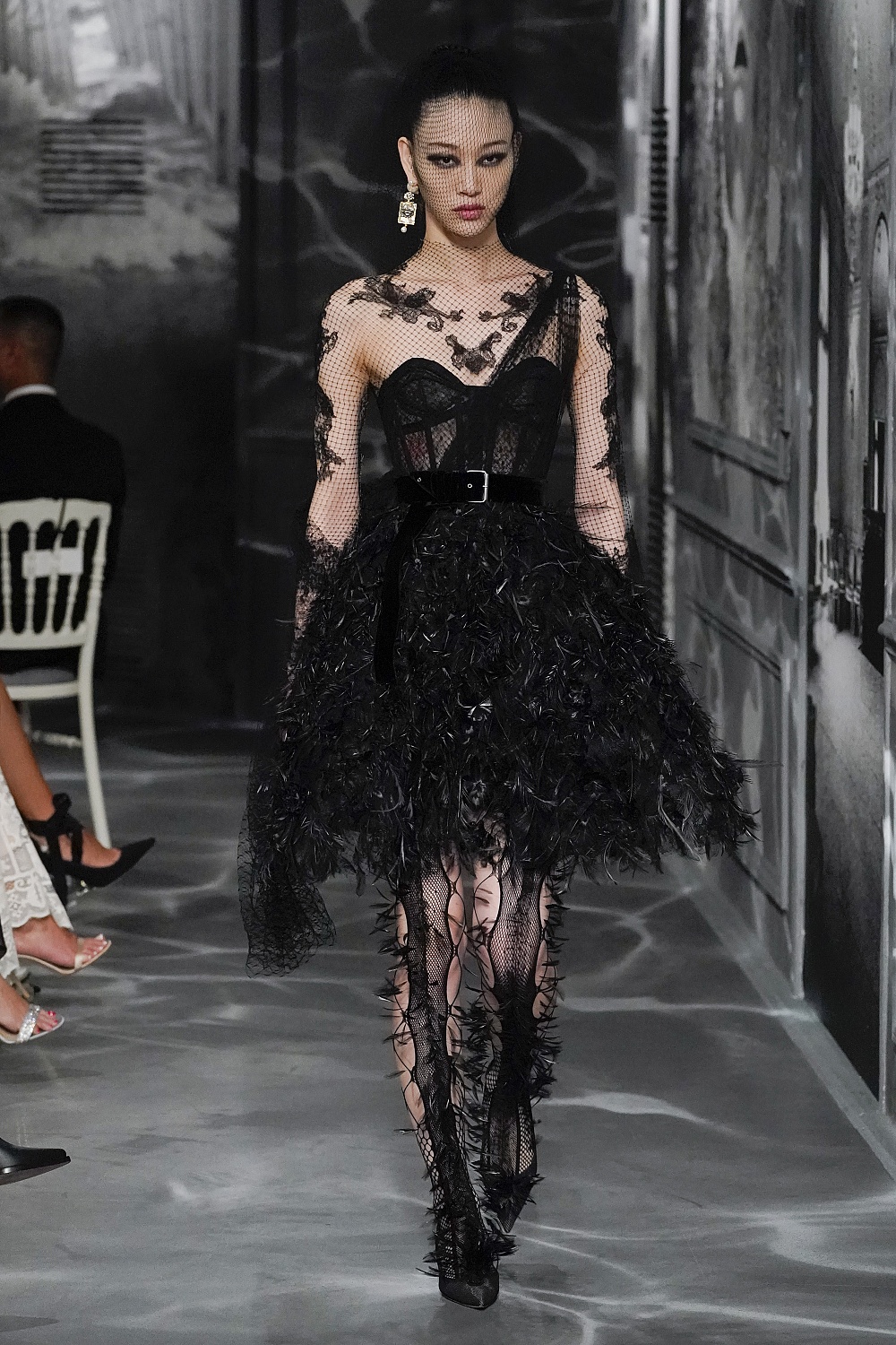 Бал традиционно правил черный цвет: модели ходили по подиуму в струящихся платьях в пол, костюмах сложного архитектурного кроя и жакетах-кольчугах. Яркими акцентами стали вуаль, гладиаторские сандалии, моносерьги и колготки-сетка. Одним из самых запоминающихся стало платье в форме самой штаб-квартиры дома Dior, которое закрывало показ.