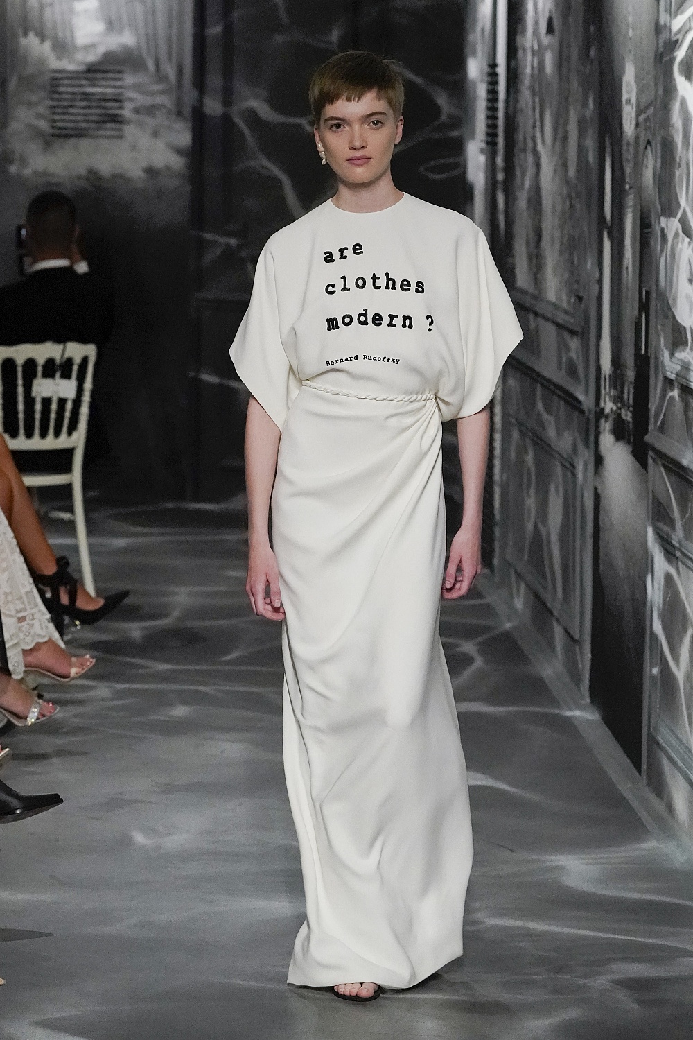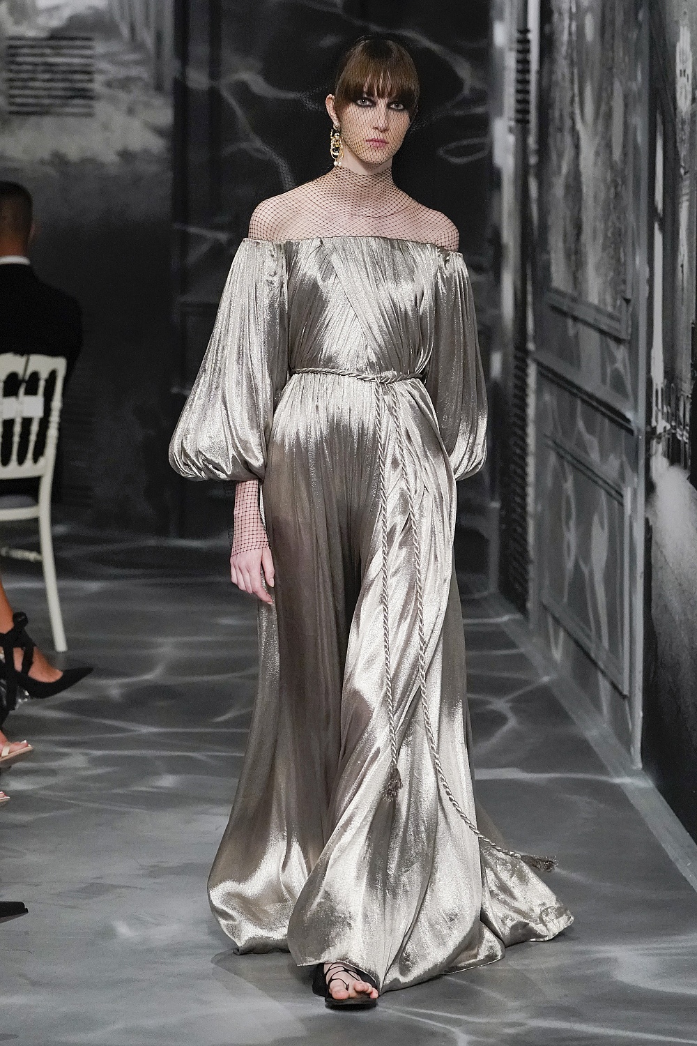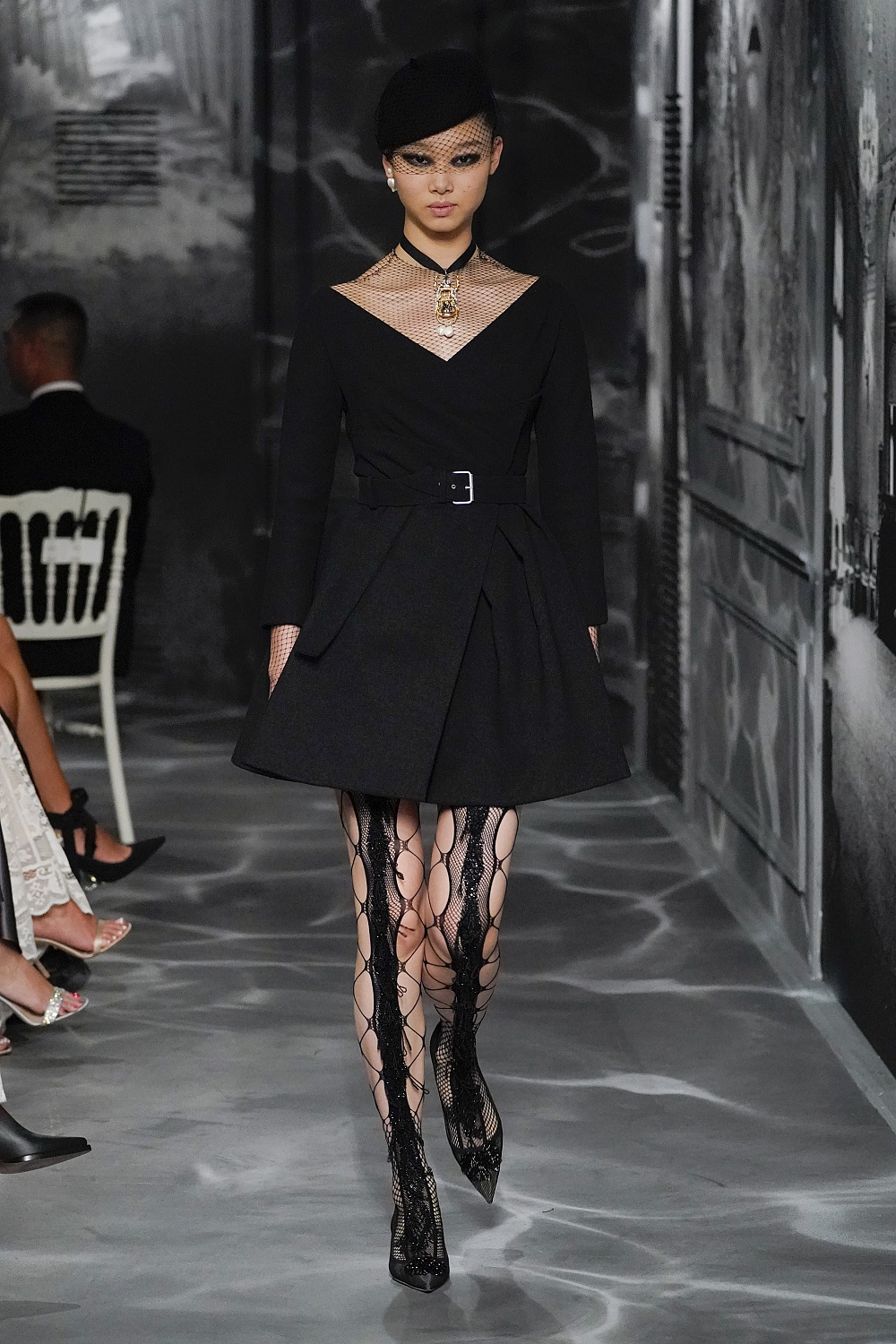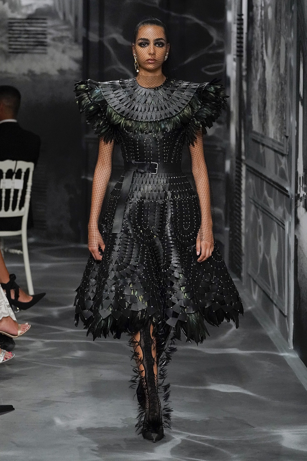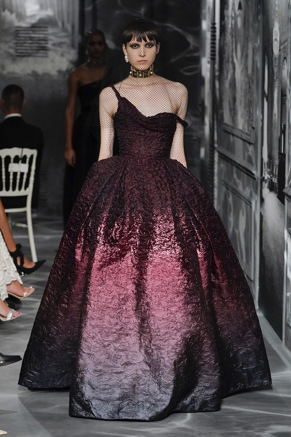 Бал традиционно правил черный цвет: модели ходили по подиуму в струящихся платьях в пол, костюмах сложного архитектурного кроя и жакетах-кольчугах. Яркими акцентами стали вуаль, гладиаторские сандалии, моносерьги и колготки-сетка. Одним из самых запоминающихся стало платье в форме самой штаб-квартиры дома Dior, которое закрывало показ.