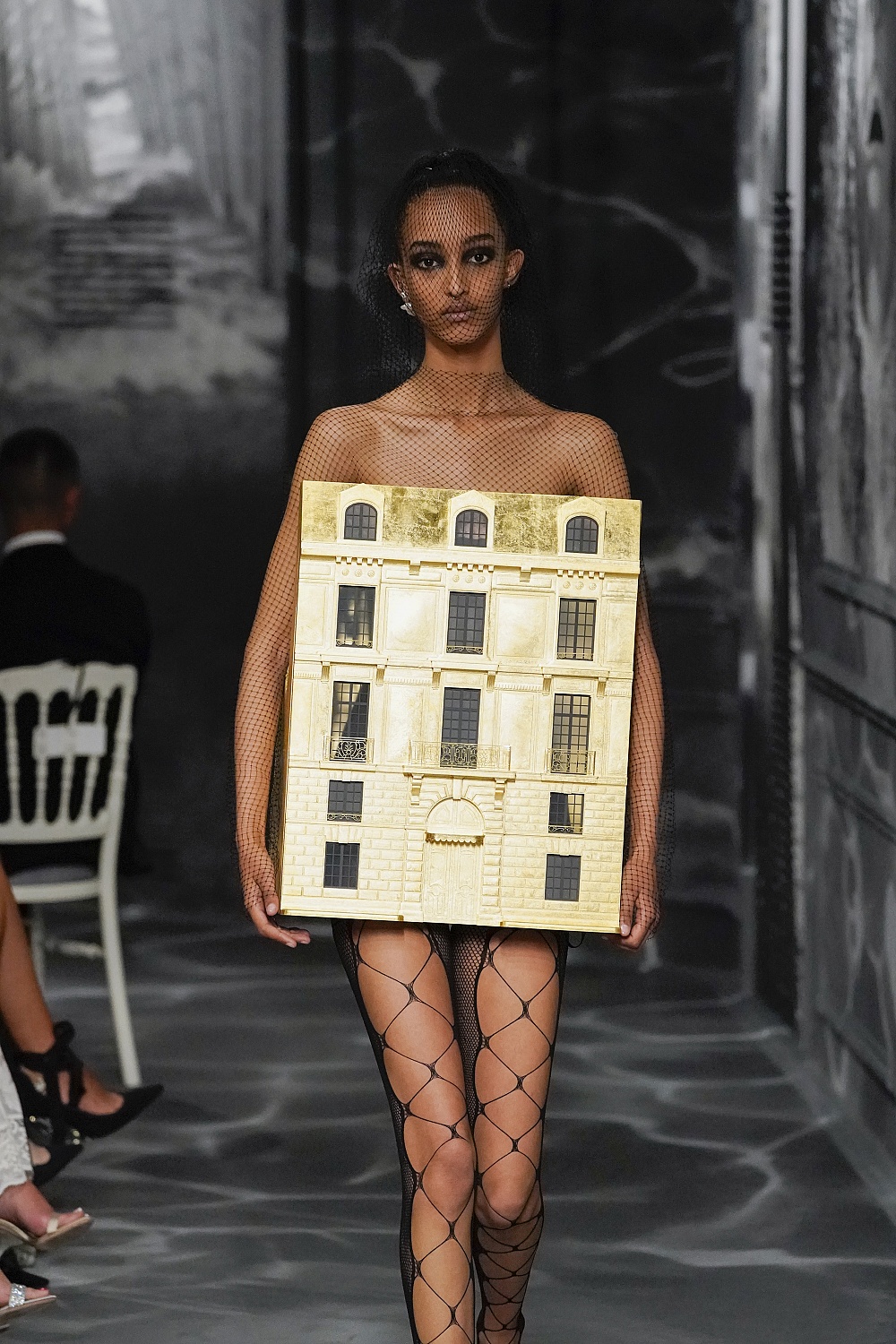 Закрывала шоу модель, которая несла на себе уменьшенную версию бутика Dior на авеню Монтень.
