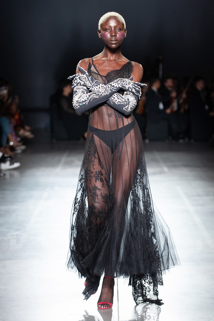 Лаванадовий напівпрозорий комплект у будуарному стилі, в якому топ-модель Наталія Гоцій під симфонію Бетховена закривала показ Frolov. Муза, від якої б точно шаленіли Едуард Мане, Франсуа Буше та Жан Фуке.