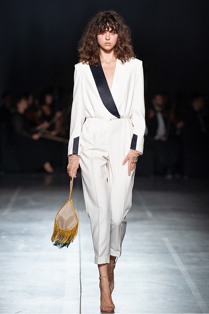 Следующий любимый образ — от Elena Burenina. Признаюсь, задача выделить только один look из этой коллекции оказалась абсолютно негуманной. И тут пришлась очень кстати моя особая любовь к розовым оттенкам, которая и помогла сделать выбор — жакет потрясающе красивого кроя в паре с брюками и черными босоножками на высокой шпильке.