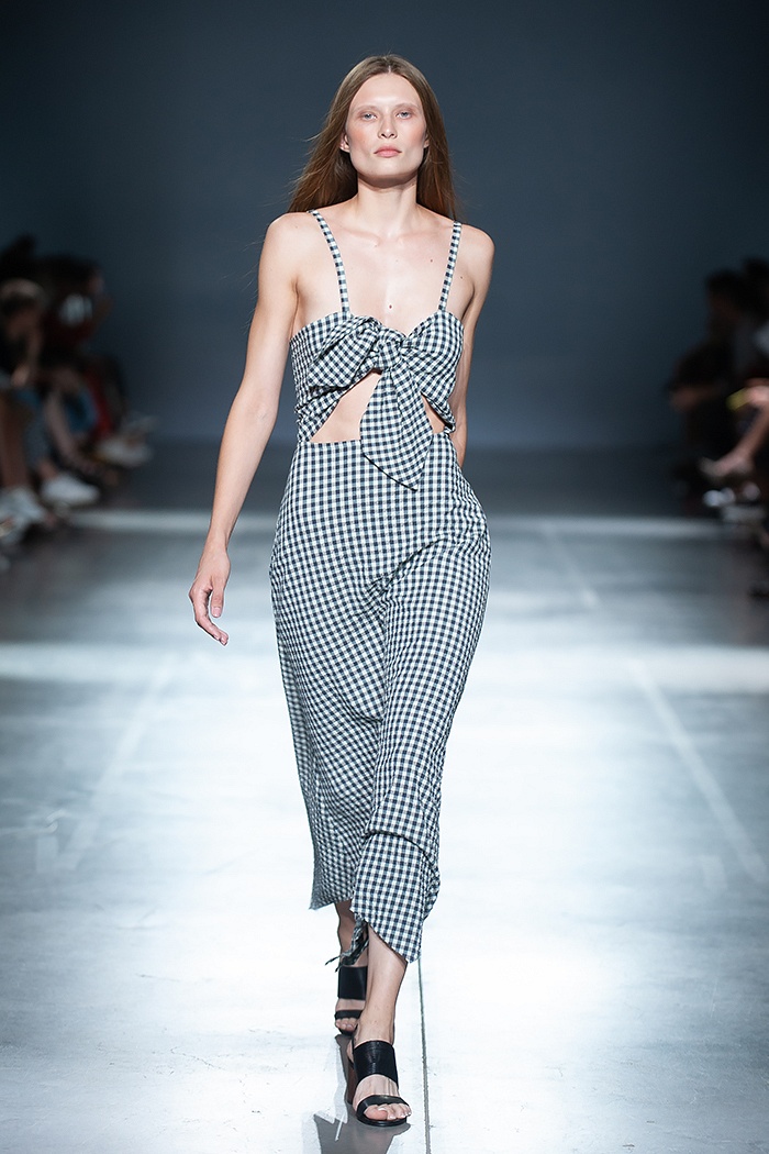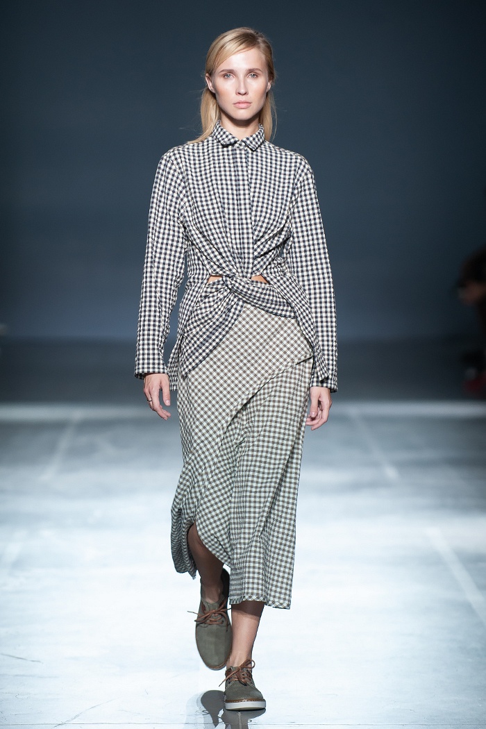 Уже традиционно я выбираю не один, а целых три любимых образа. И первый будет от Przhonskaya. Мне очень понравилась модель Хельга Хитко на показе бренда. Особенно запомнился второй ее выход в многослойном образе. Клетчатая юбка в тандеме с льняным жилетом, надетым поверх белой хлопковой рубашки и лаконичного трикотажного топа, на мой взгляд, это красивое сочетание очень органично вписывается в основной лейтмотив коллекции Przhonskaya, которая посвящена путешествиям.