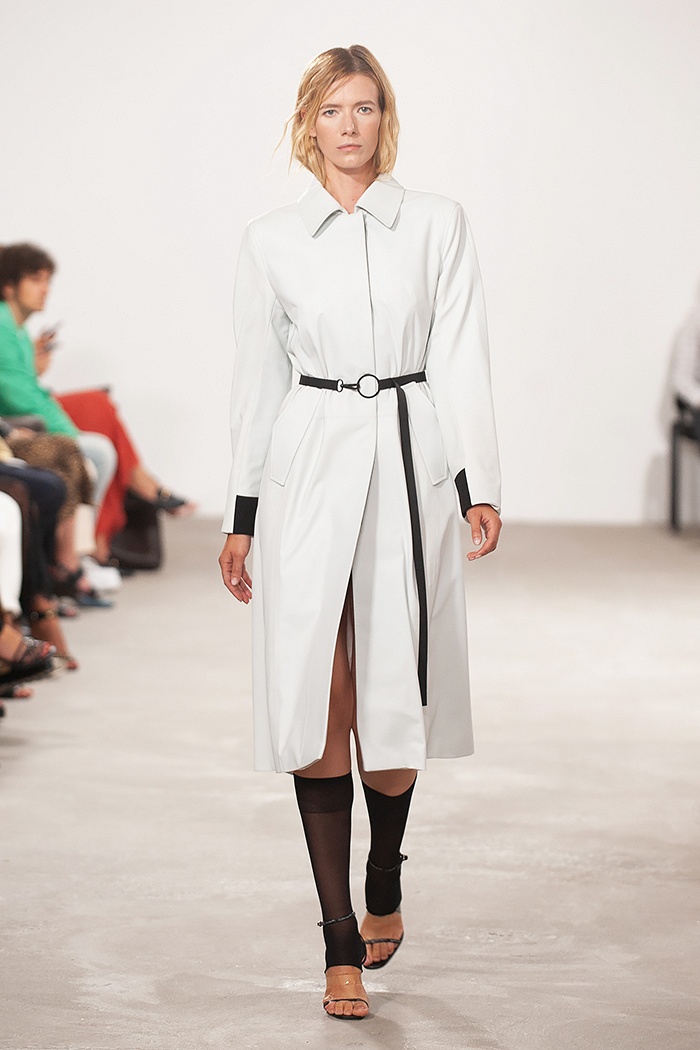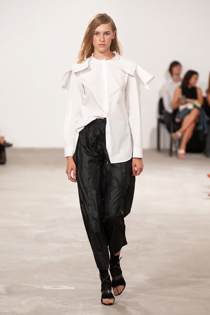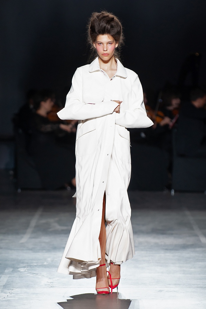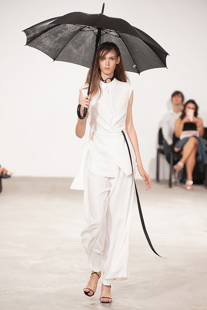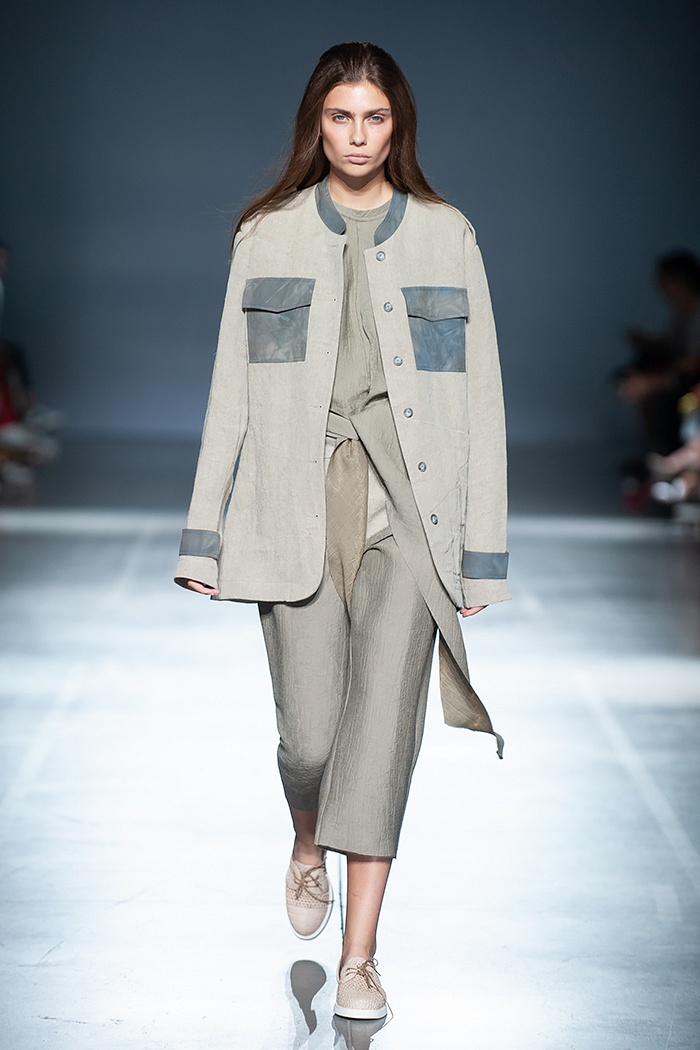 Строгие плащи, жакеты и рубашки сложного кроя — все от Elena Burenina определенно имеет собственный очень сильный характер. Усилить впечатления гостей дизайнеру удалось и самой постановкой шоу.