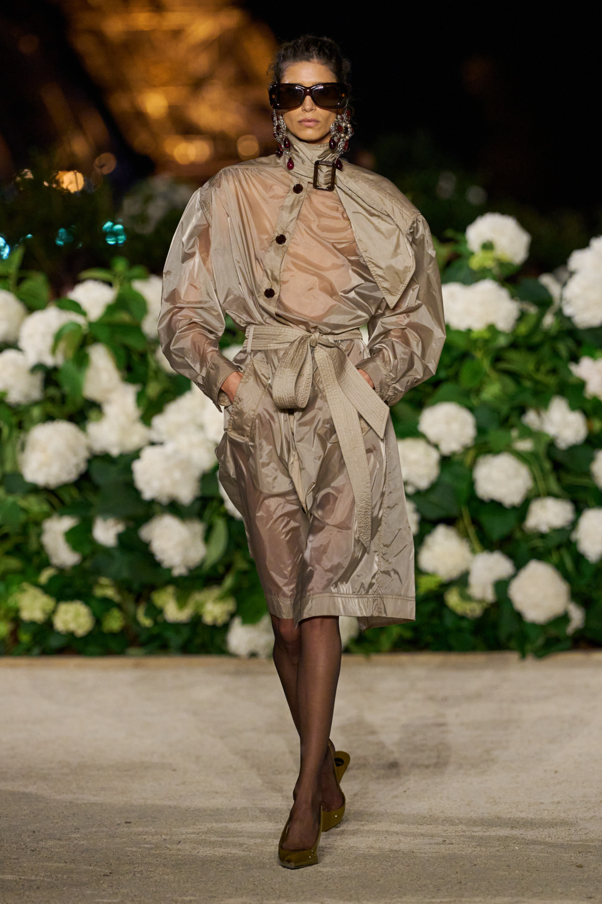 Не менш символічною стала й друга частина показу — переосмислення класичних плащів і суконь Saint Laurent. Зроблені з тонкого, майже прозорого нейлону, вони підкреслювали тіло, але не прикривали його. «Це все ще про оголеність», — зауважив Ваккарелло, посилаючись на дизайни самого Іва Сен-Лорана, який неодноразово експериментував із напівпрозорими тканинами.