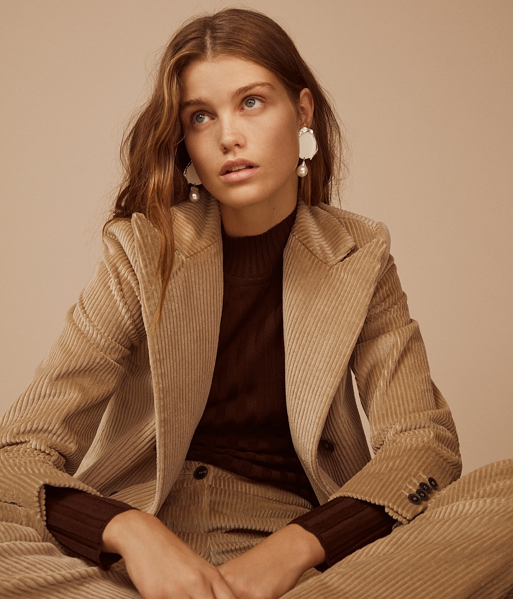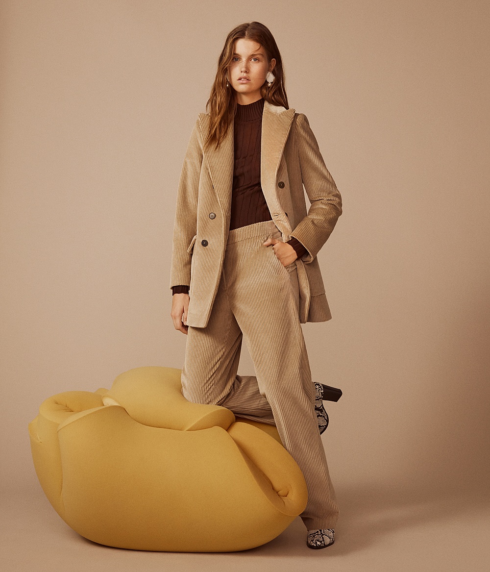 Жакет с широкими лацканами и широкие брюки-трубы – при выборе брючного костюма ориентируемся на архивные снимки Джейн Биркин.