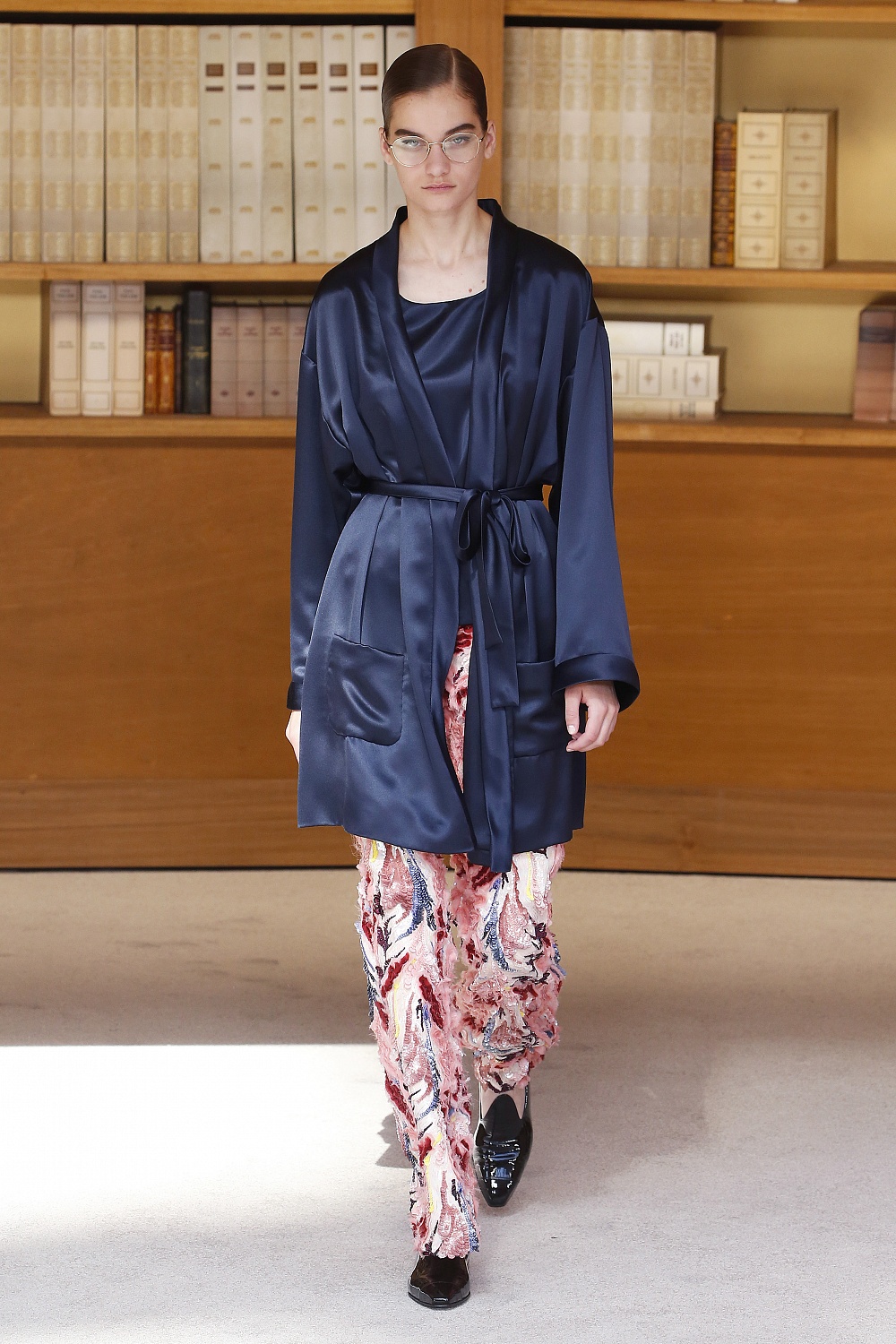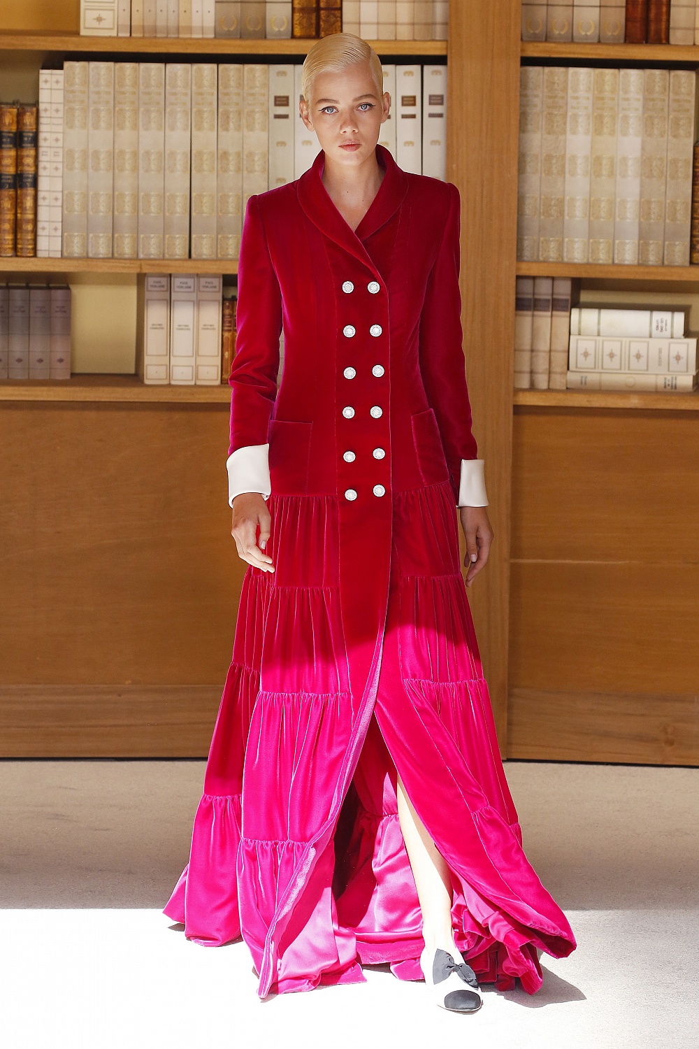Немного дерзости в коллекцию внесли яркие укороченные жакеты с объемными рукавами, полупрозрачные платья в пол и пальто-шинели с крупными пуговицами.