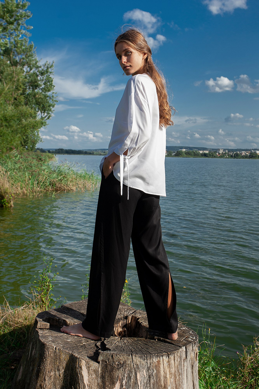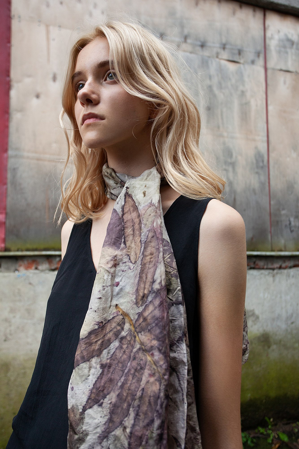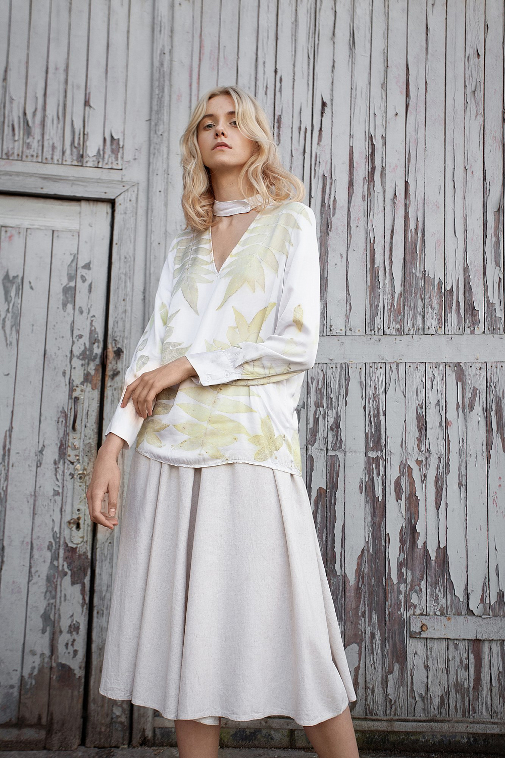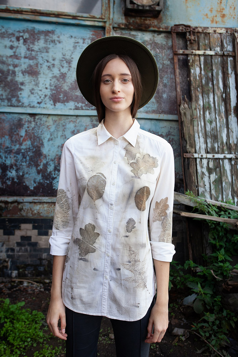 Мімікрія — це про контакт з природою та про справжність принта. Білі сорочки фарбовані завдяки техніці, яка існує століттями: пігменти з рослини залишаються на тканині шляхом трикратної термообробки. Усі речі дизайнерка Богдана Войтенко принтує власноруч.