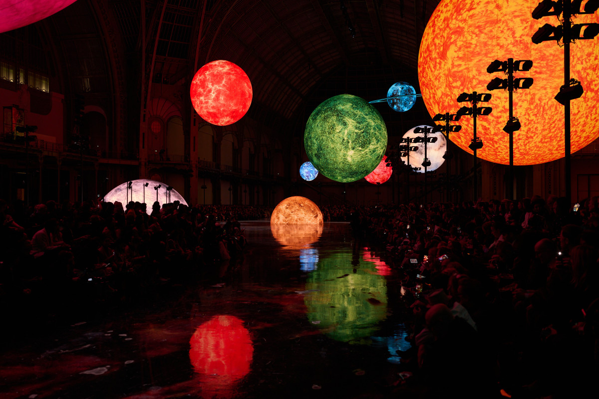 Як тільки гості ступили до вже звичного простору Grand Palais, який роками зустрічає палких шанувальників бренду на нових шоу, то одразу ж зрозуміли, що наступні кілька хвилин пройдуть максимально видовищно. Велику залу з арками та склепіннями тепер прикрасили масивні декорації у вигляді підсвічених різними відтінками планет, що немовби звисали зі стелі чи пробивалися крізь глянцеву підлогу. Таким чином створювалося відчуття, що всі на мить потрапили на борт космічного корабля, який от-от вирушить у мандрівку крізь галактики.